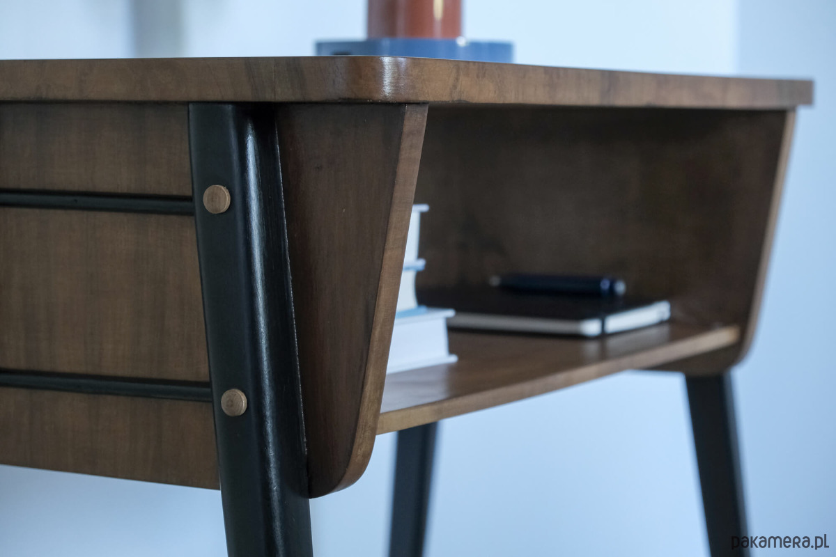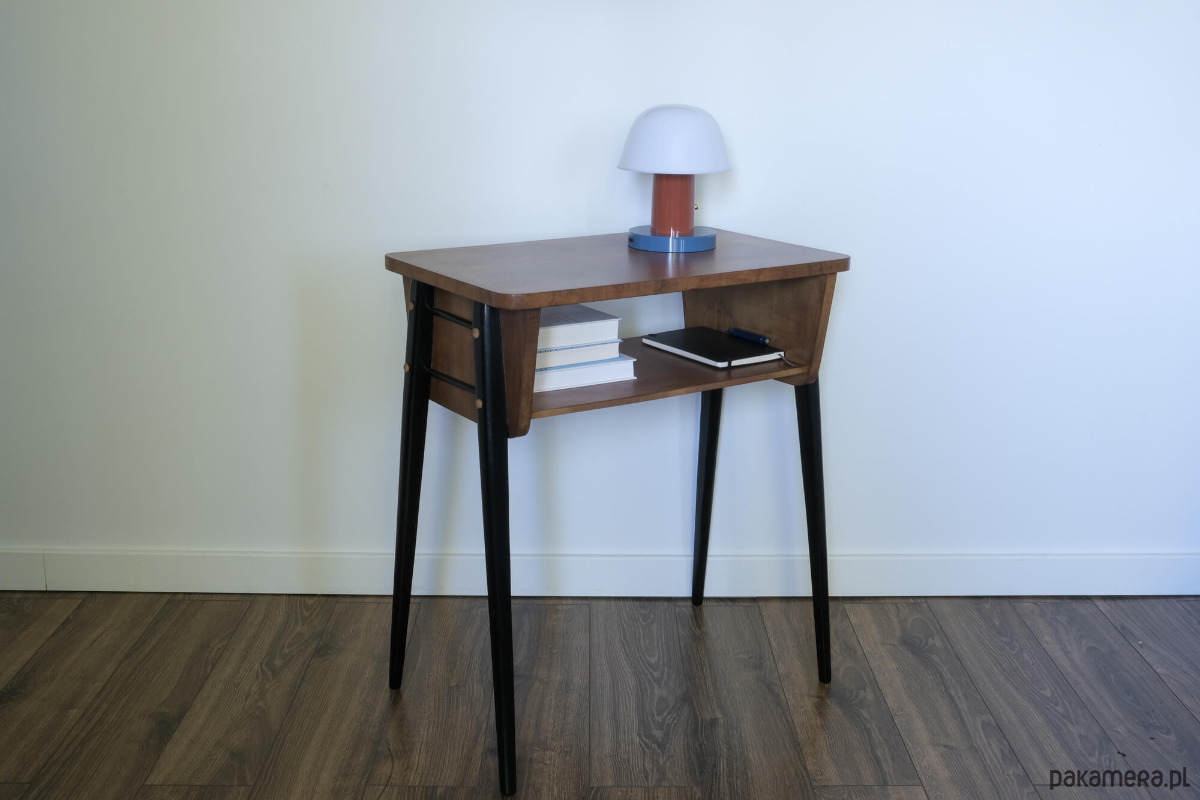 Stolik po renowacji, fornir odczyszczony i zabezpieczony lakierobejcą w kolorze jasnego orzecha w wykończeniu satynowym. Nogi pomalowane w kolorze głębokiej czerni z połyskiem.