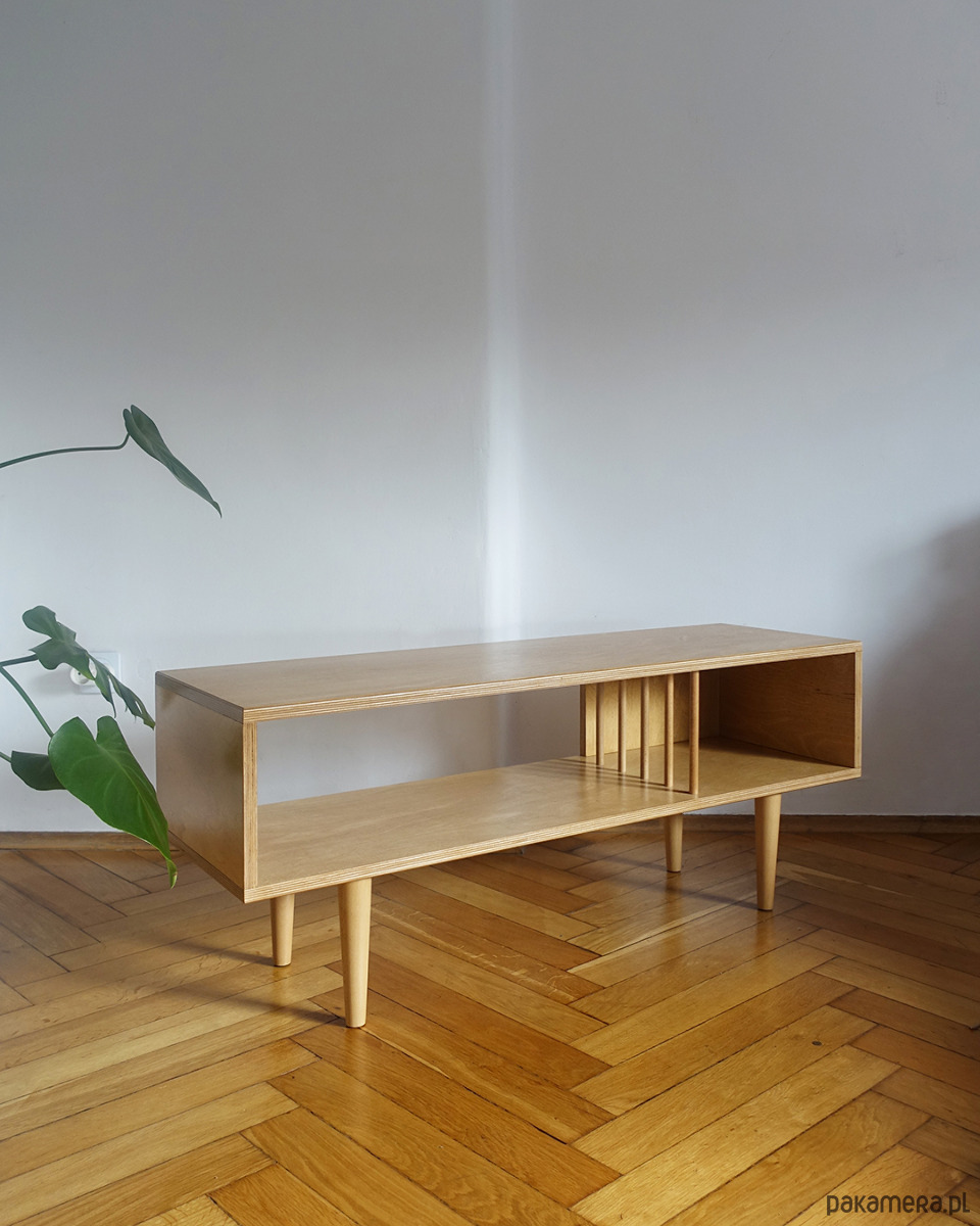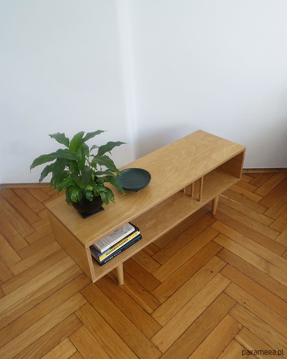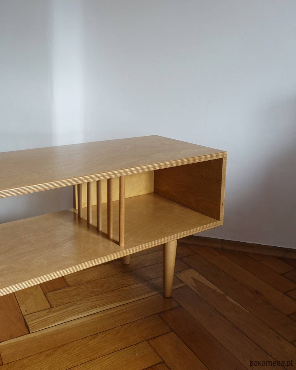 Stolik wykonany jest ze sklejki o grubości 18mm oraz z drewna bukowego. Z buku wykonano nogi oraz drążki dzielące dwie przestrzenie do przechowywania.