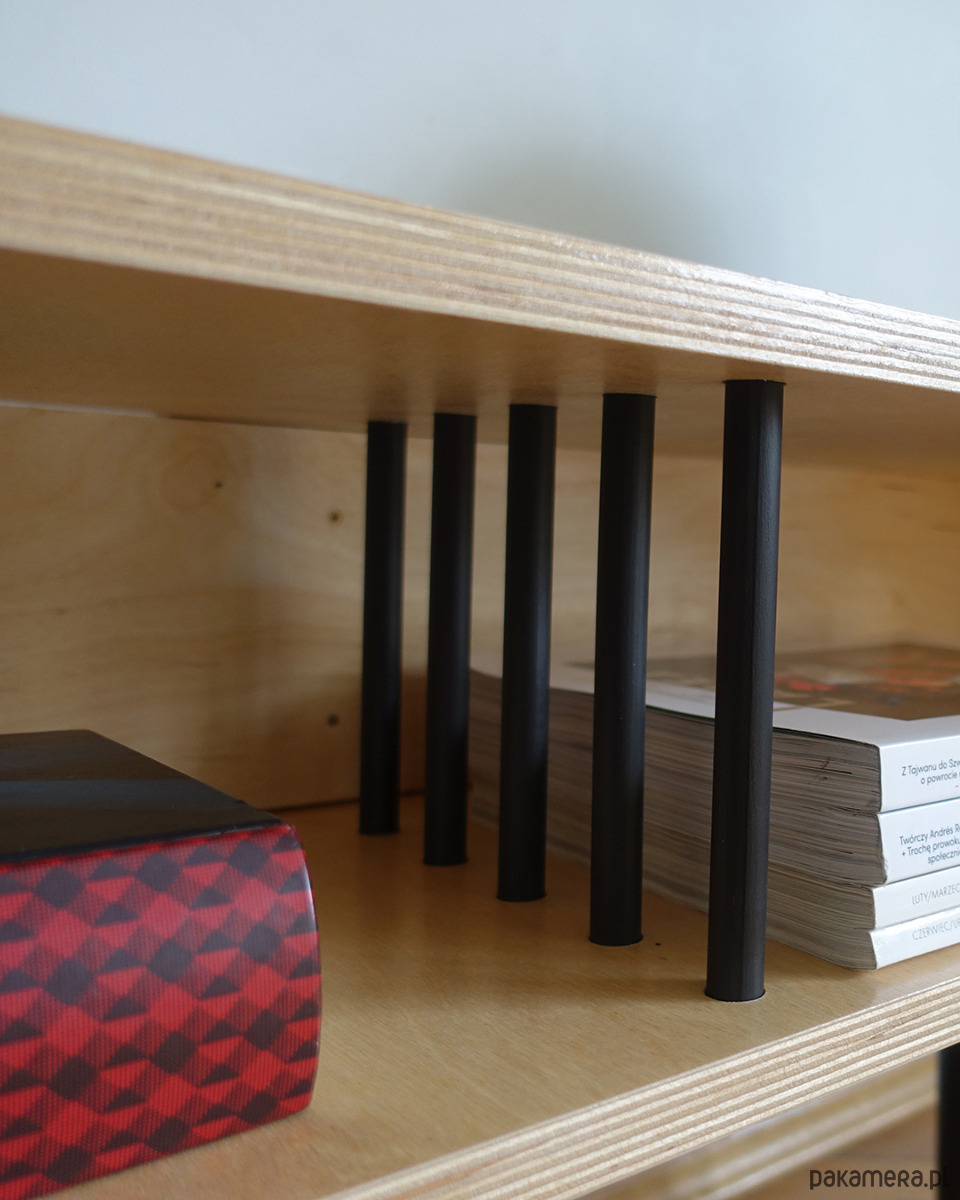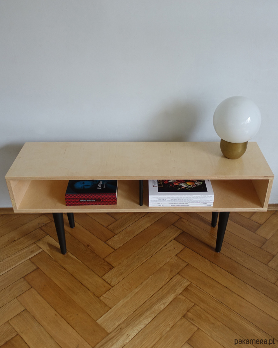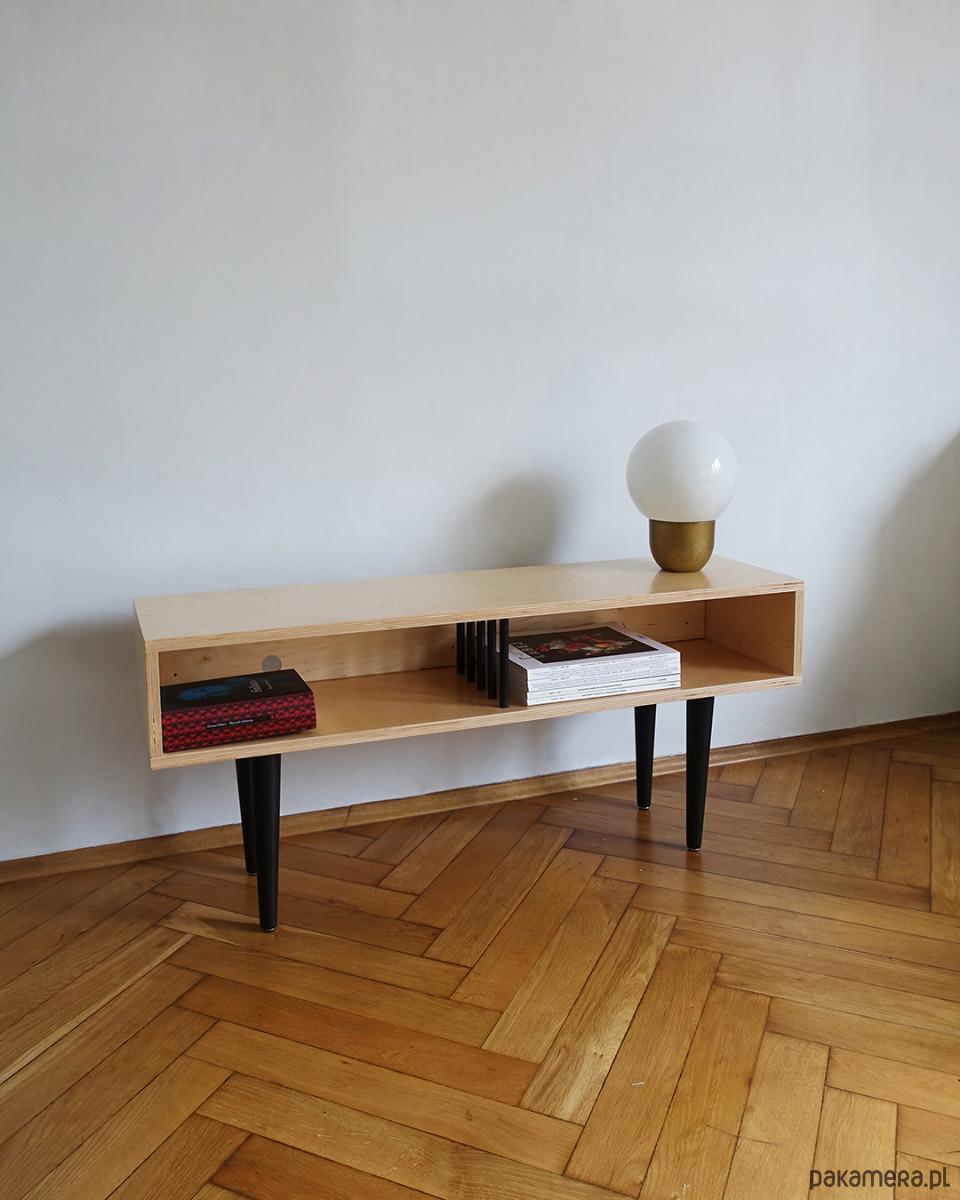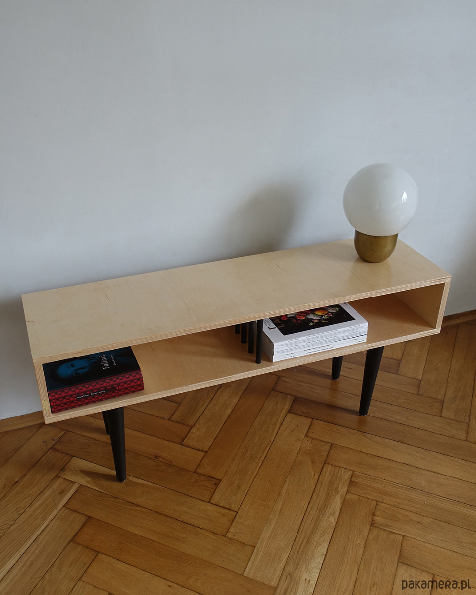 Stolik wykonany jest ze sklejki o grubości 18mm oraz z drewna bukowego. Z buku wykonano nogi oraz drążki dzielące dwie przestrzenie do przechowywania.