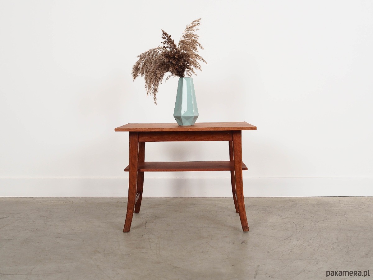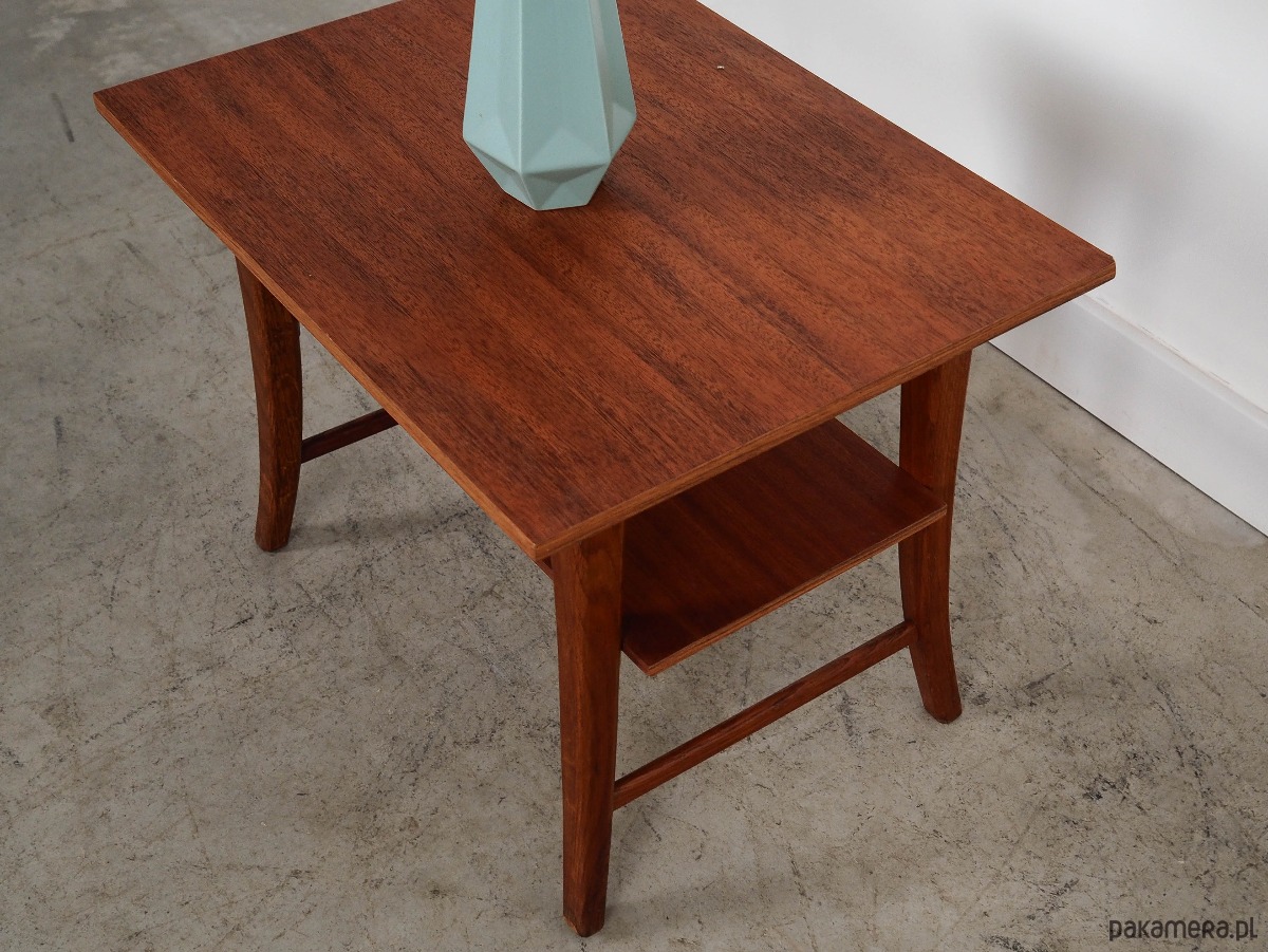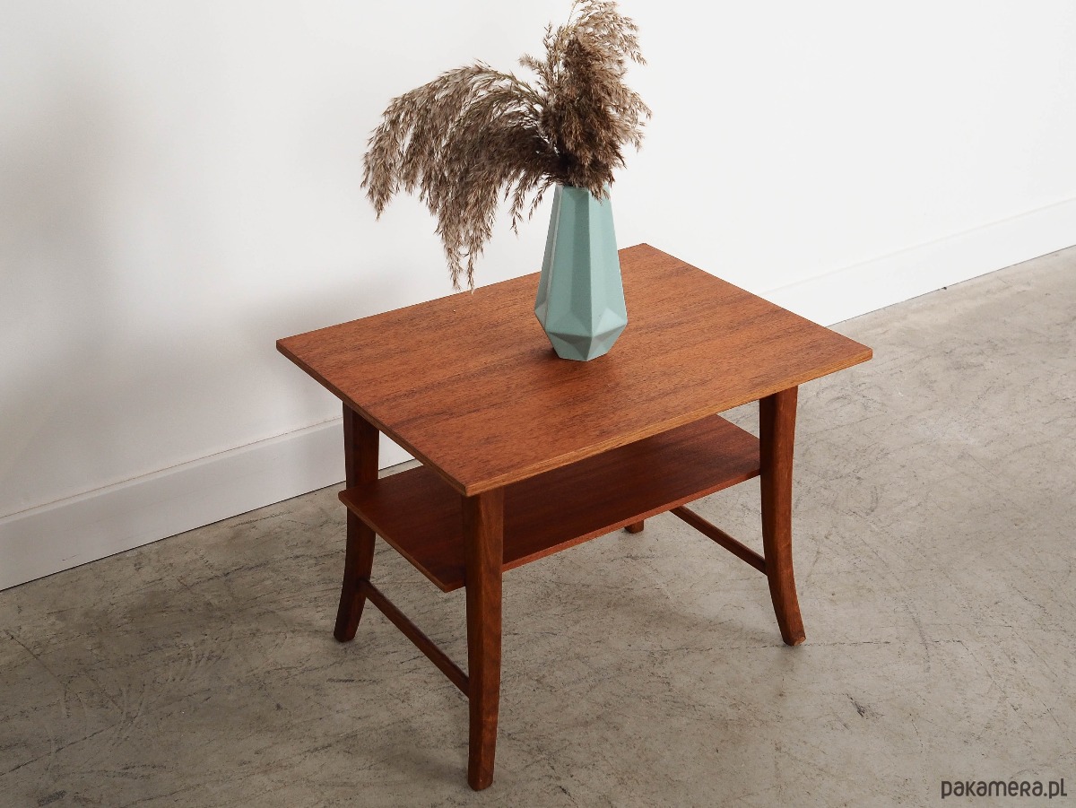 Blat stolika pokryty jest fornirem tekowym. Nogi zostały wykonane z litego drewna. Powierzchnia po odświeżeniu. Dodatkowym atutem jest praktyczna półeczka.