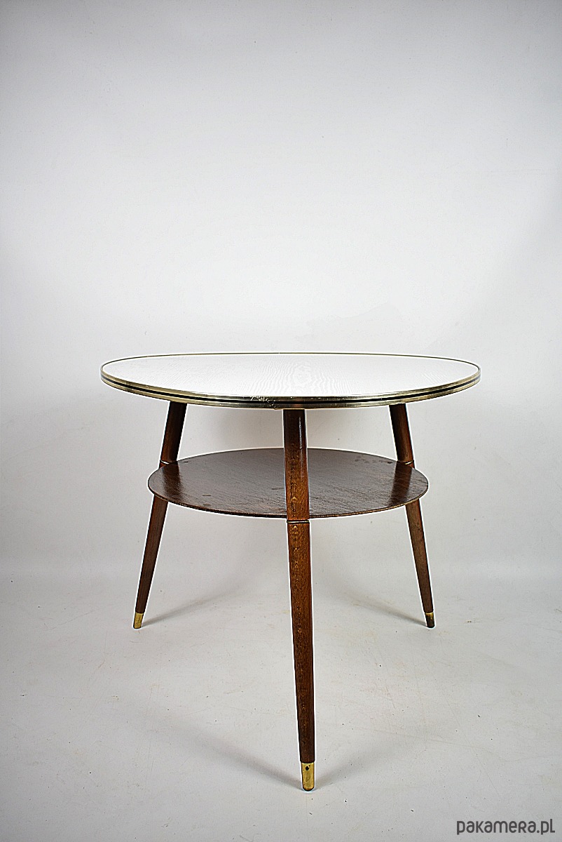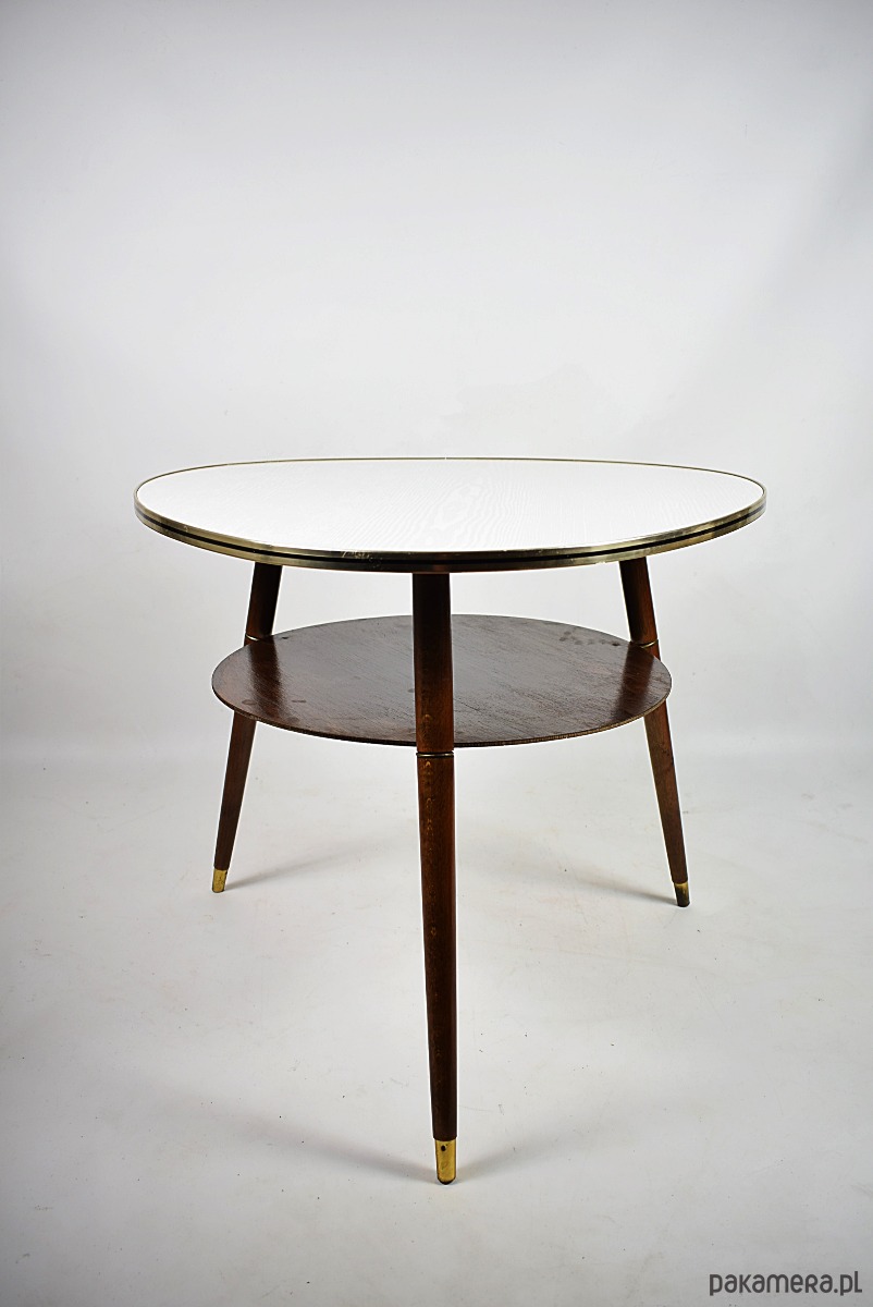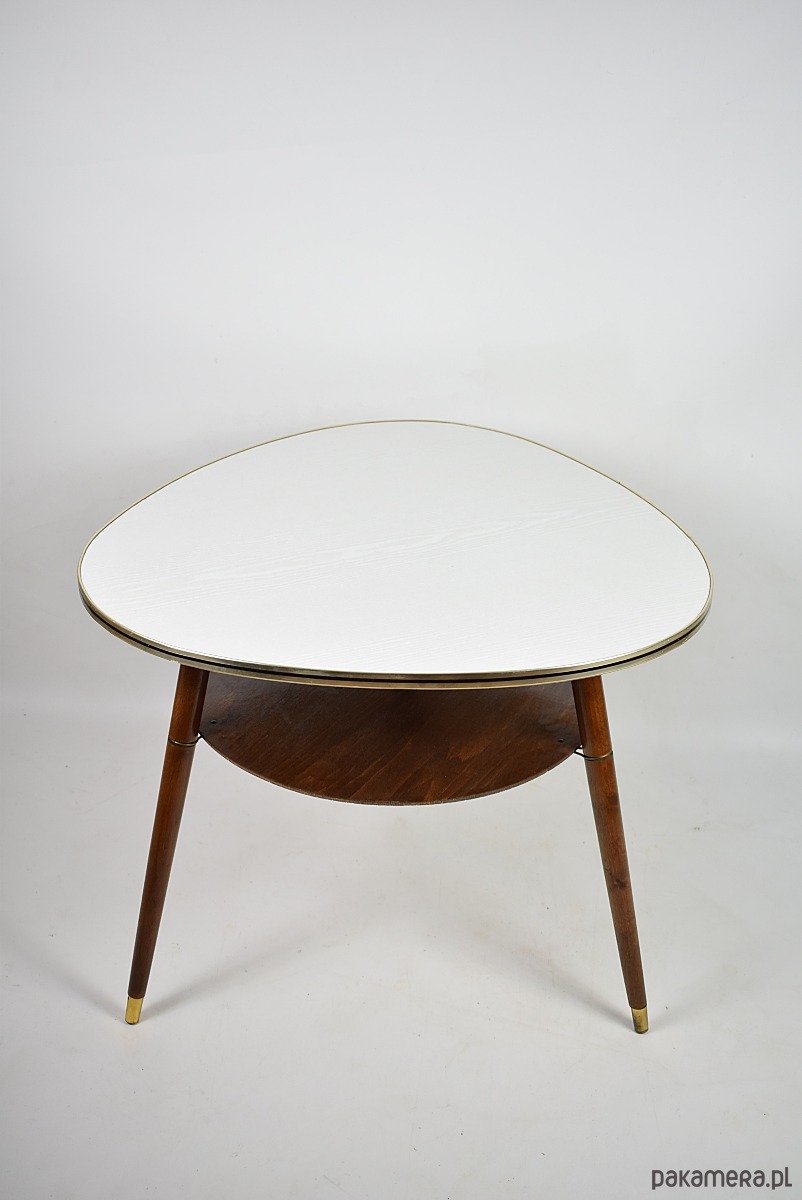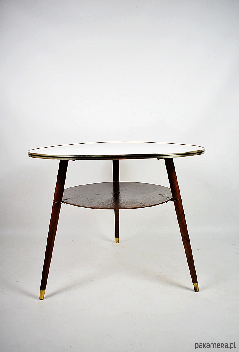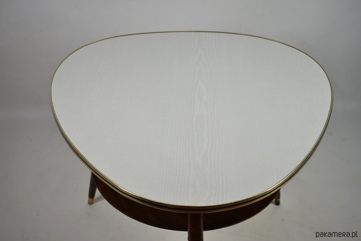 Stolik w stylu rockabilly z lat 60.Stolik w stanie bardzo dobrym, posiada minimalne ślady czasu. Blat posiada okleinę drewnopodobną, możliwość na życzenie klienta, za dodatkową opłatą(160zł) wykonanie blatu z czarnego lakobelu.