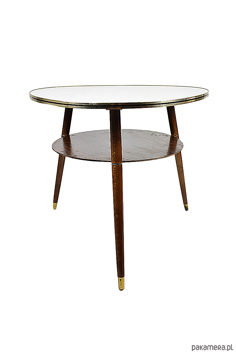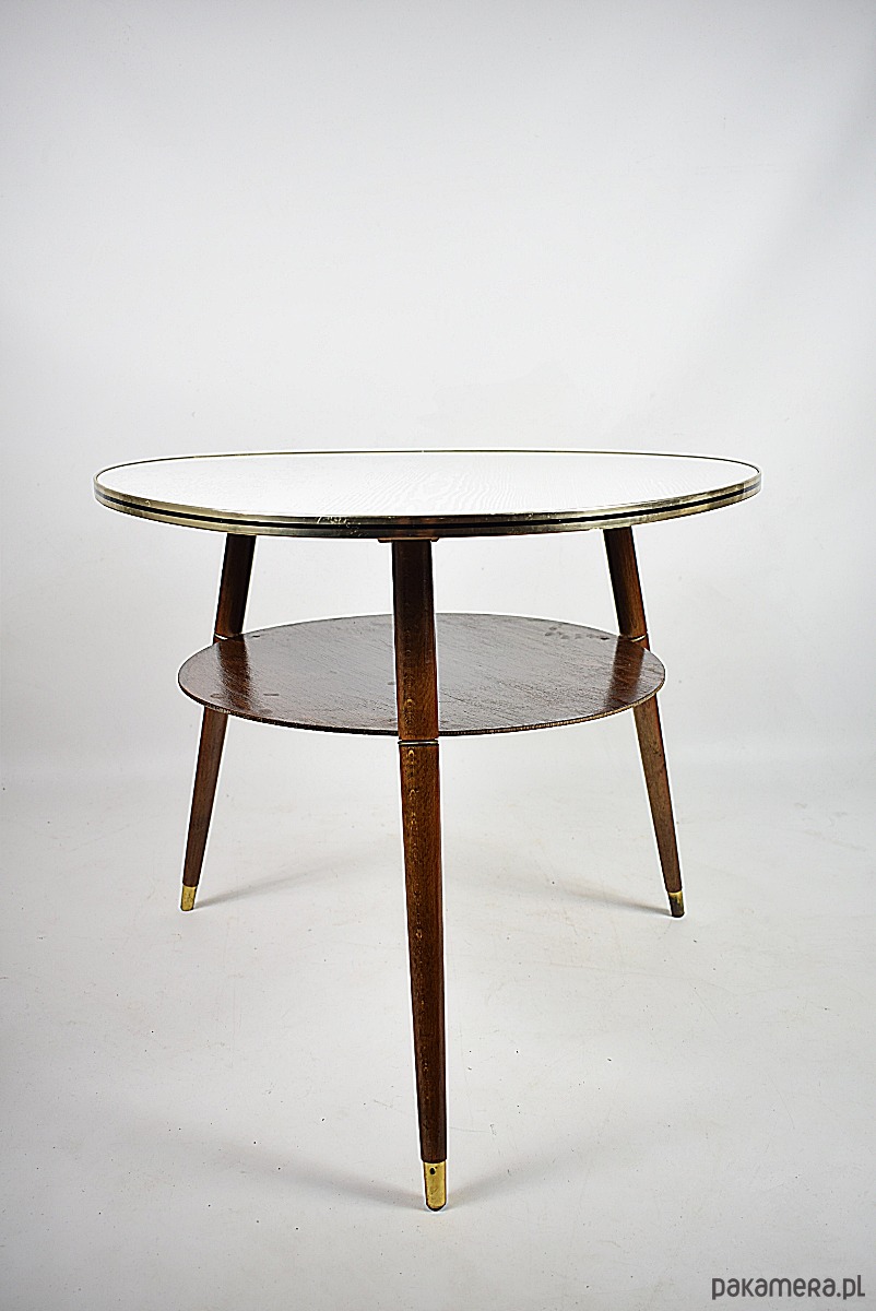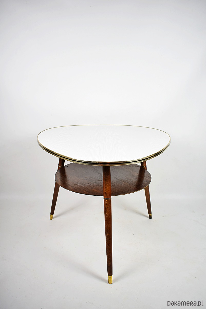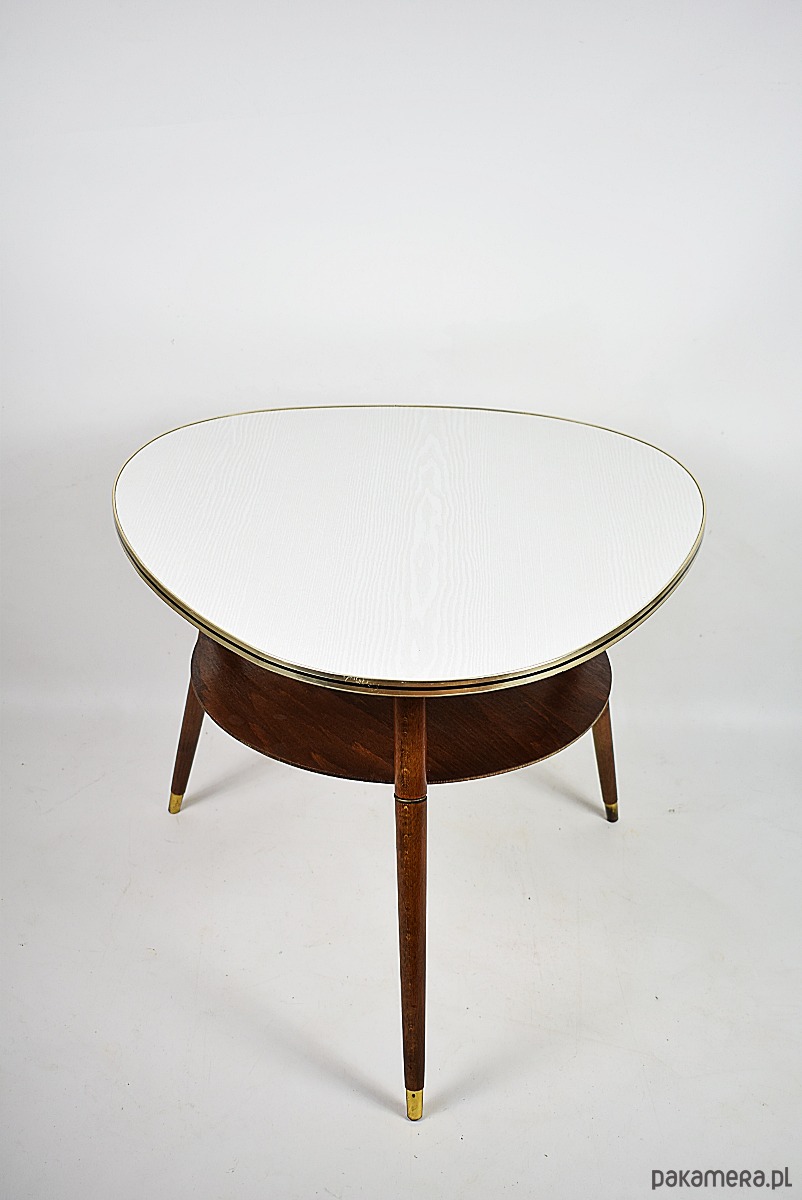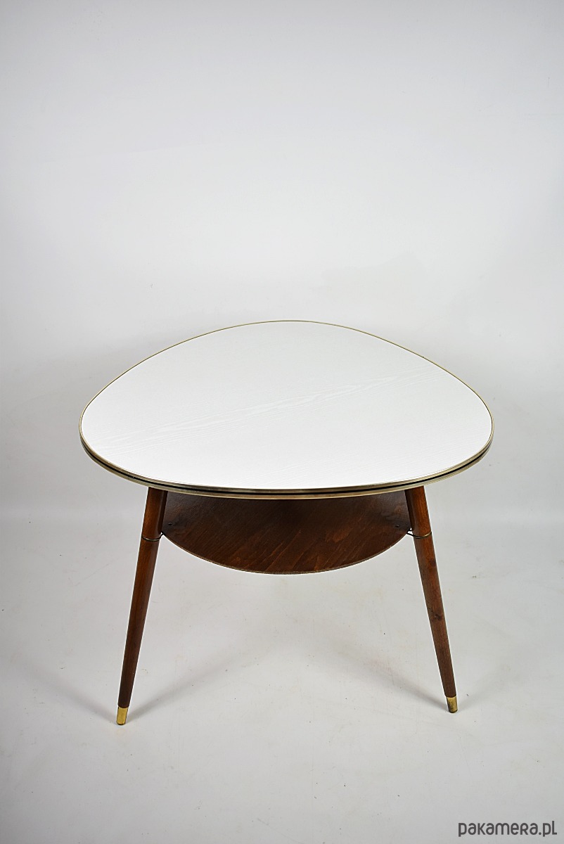 Stolik w stylu rockabilly z lat 60.Stolik w stanie bardzo dobrym, posiada minimalne ślady czasu. Blat posiada okleinę drewnopodobną, możliwość na życzenie klienta, za dodatkową opłatą(160zł) wykonanie blatu z czarnego lakobelu.