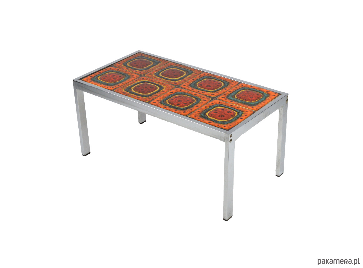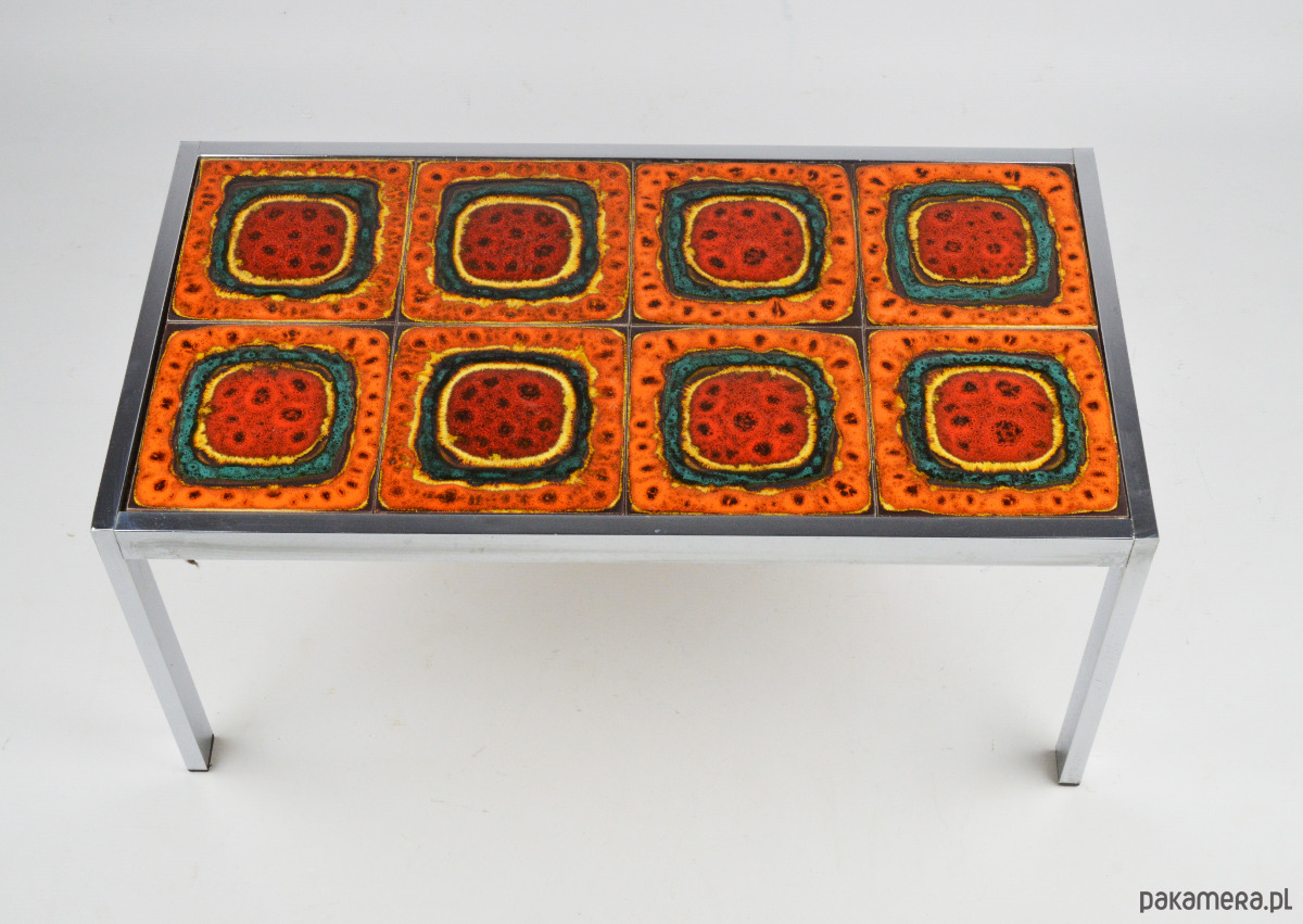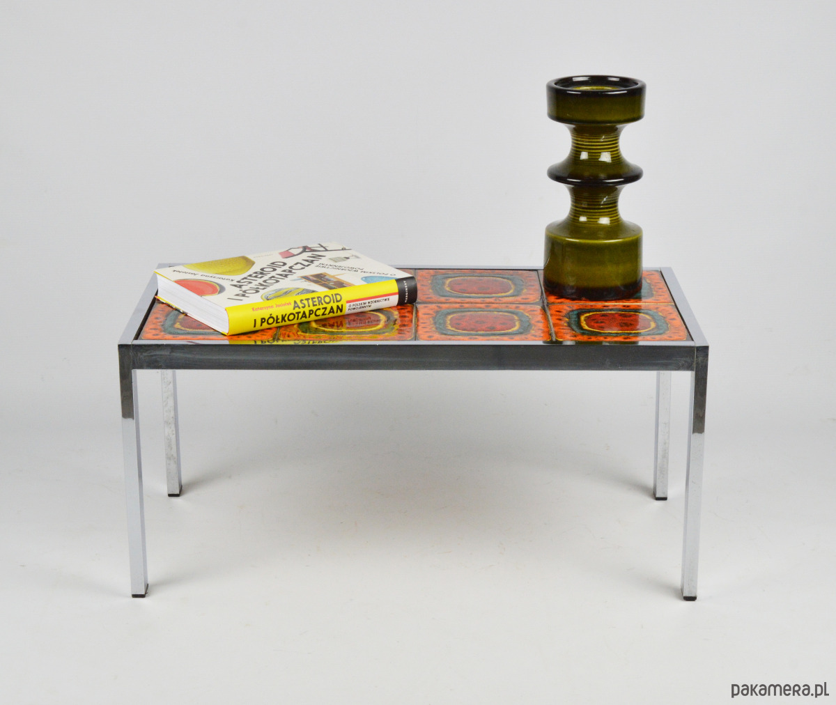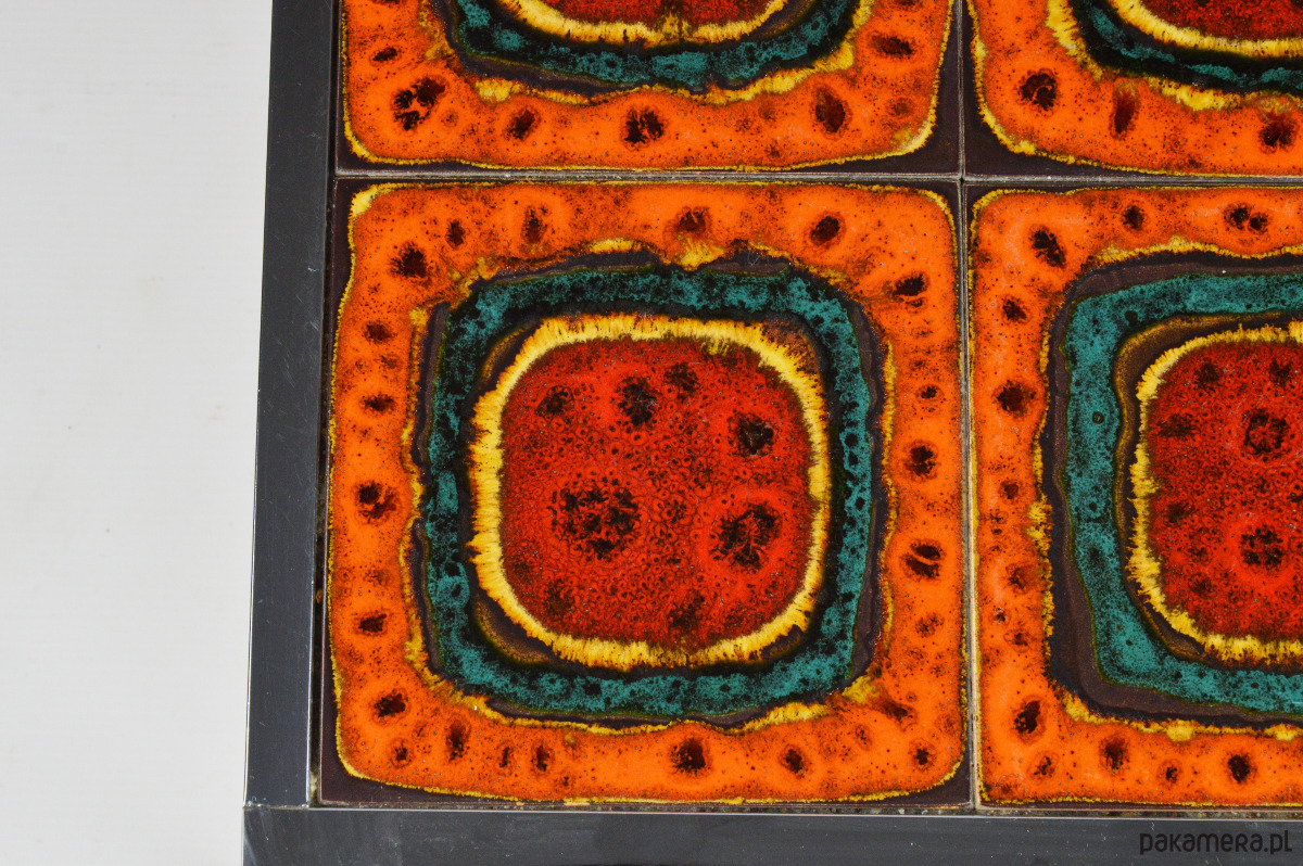 Stolik z dekoracyjnymi płytami ceramicznymi w żywych i energetycznych kolorach z lat 70. Stan zachowania dobry, widoczne rysy i zmatowienia na chromowanych elementach stolika.