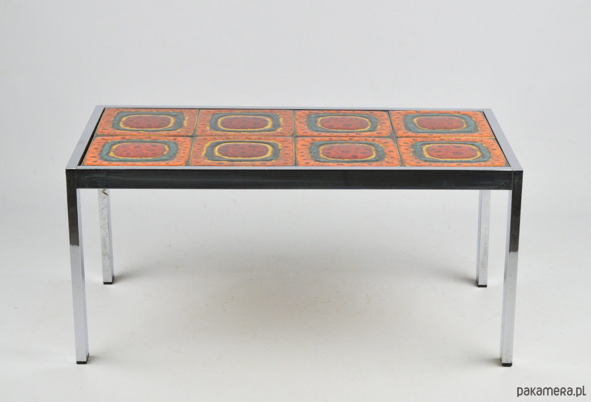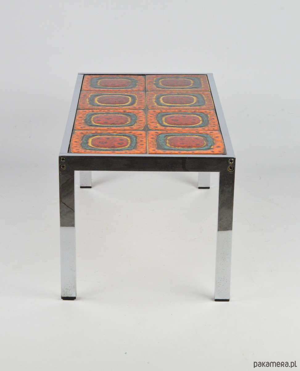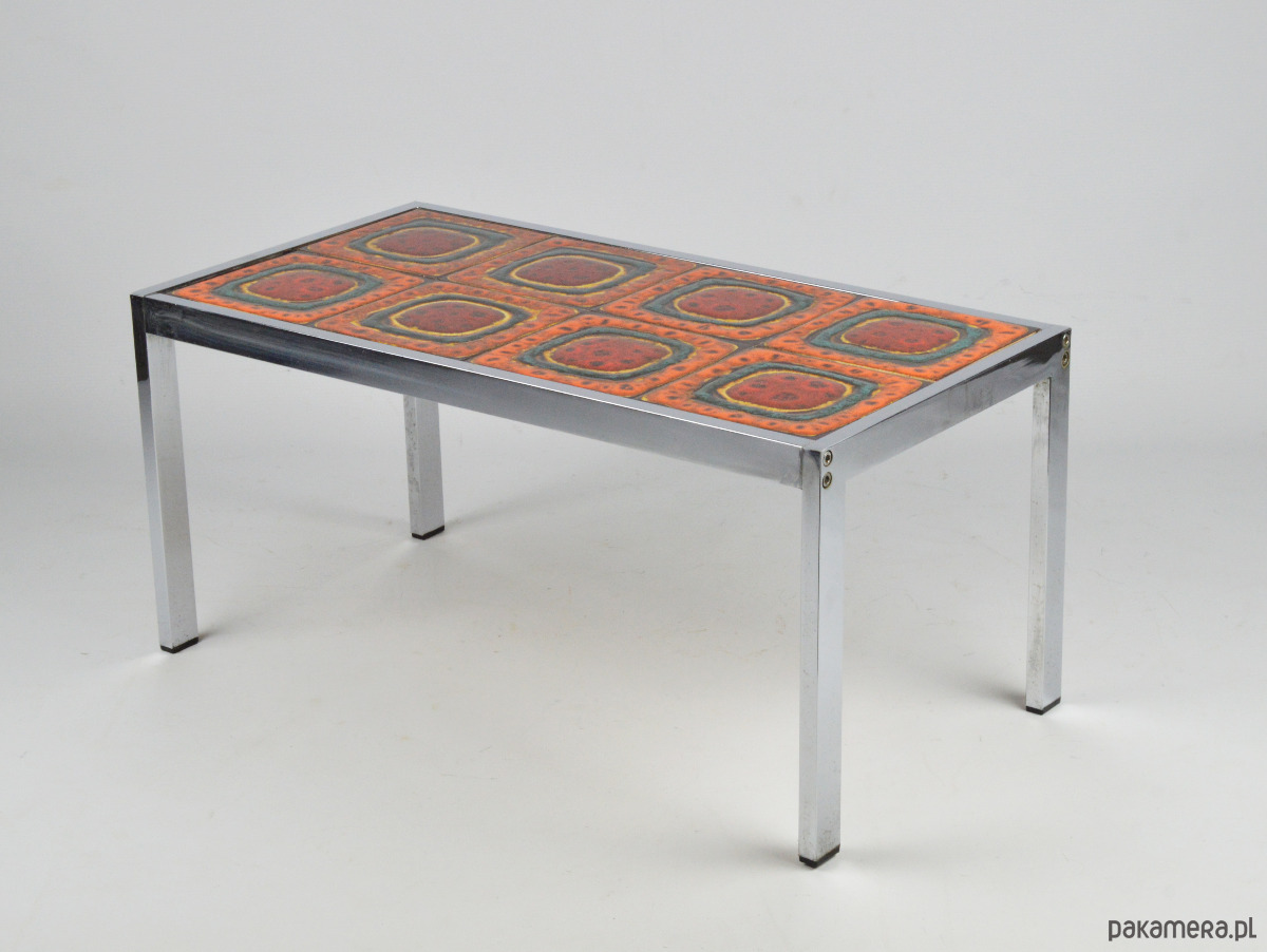Stolik z dekoracyjnymi płytami ceramicznymi w żywych i energetycznych kolorach z lat 70. Stan zachowania dobry, widoczne rysy i zmatowienia na chromowanych elementach stolika.