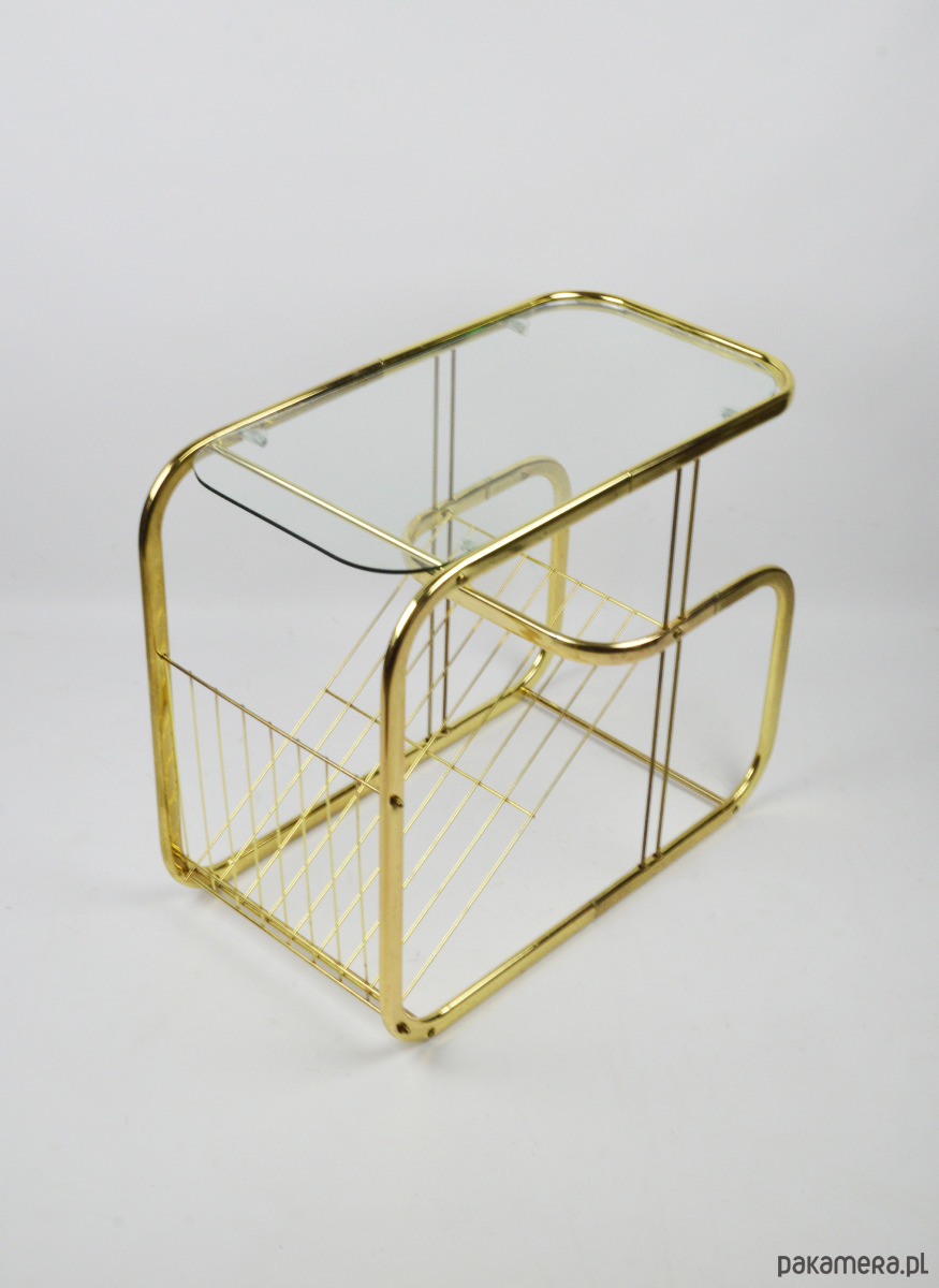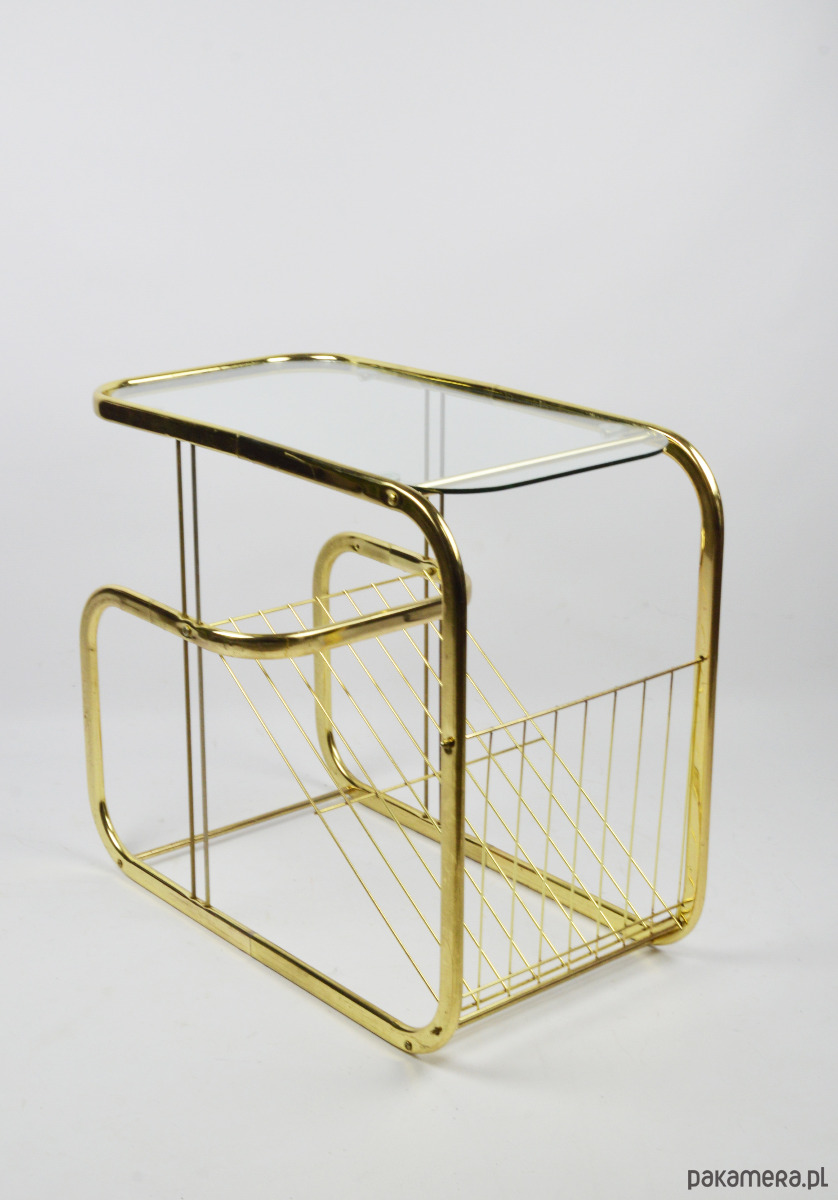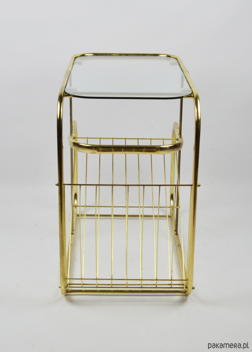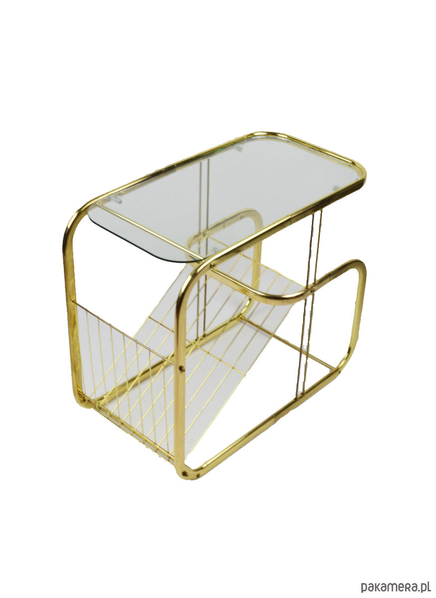 Złoty stolik z gazetnikiem z lat 80. Złota, metalowa konstrukcja ze szklanym blatem. Stan zachowania dobry, widoczne utlenienia i rysy.