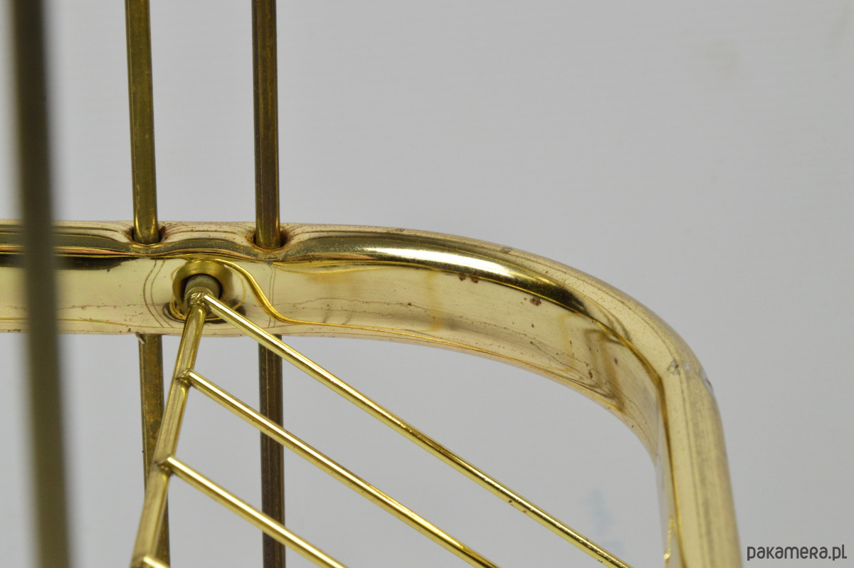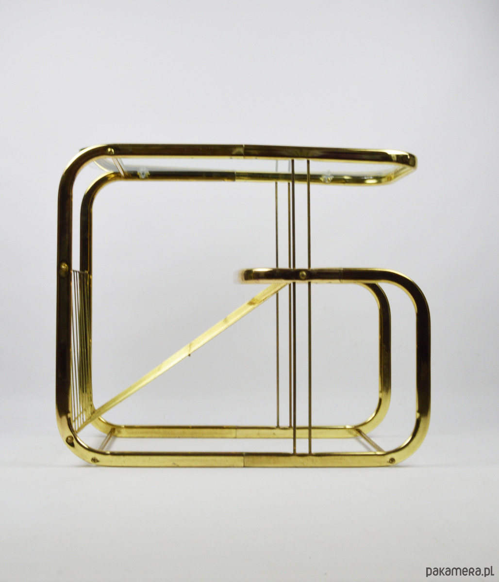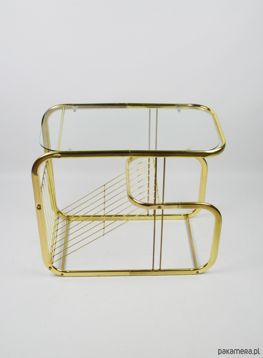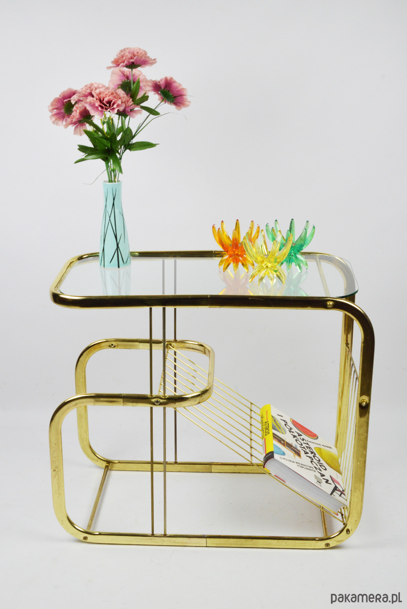 Złoty stolik z gazetnikiem z lat 80. Złota, metalowa konstrukcja ze szklanym blatem. Stan zachowania dobry, widoczne utlenienia i rysy.
