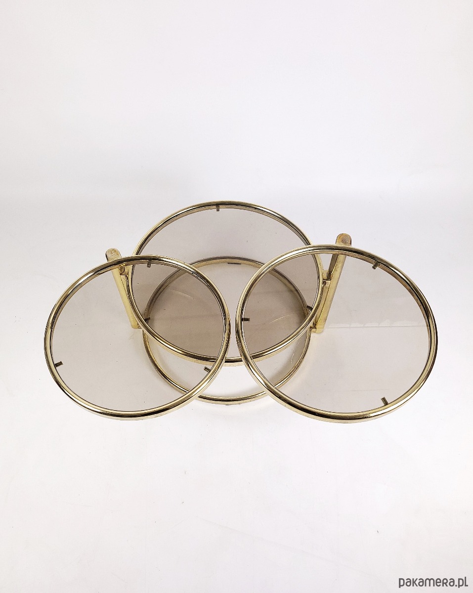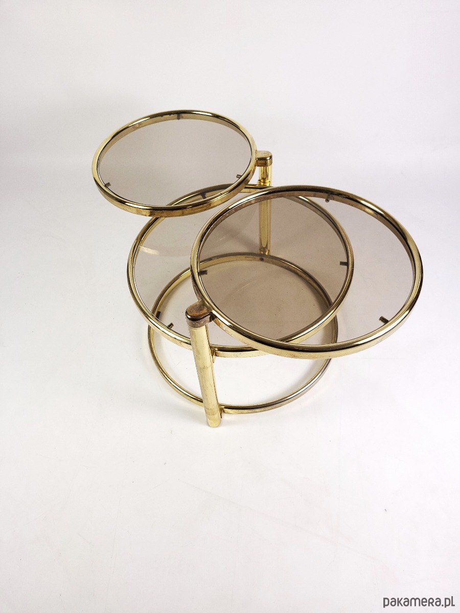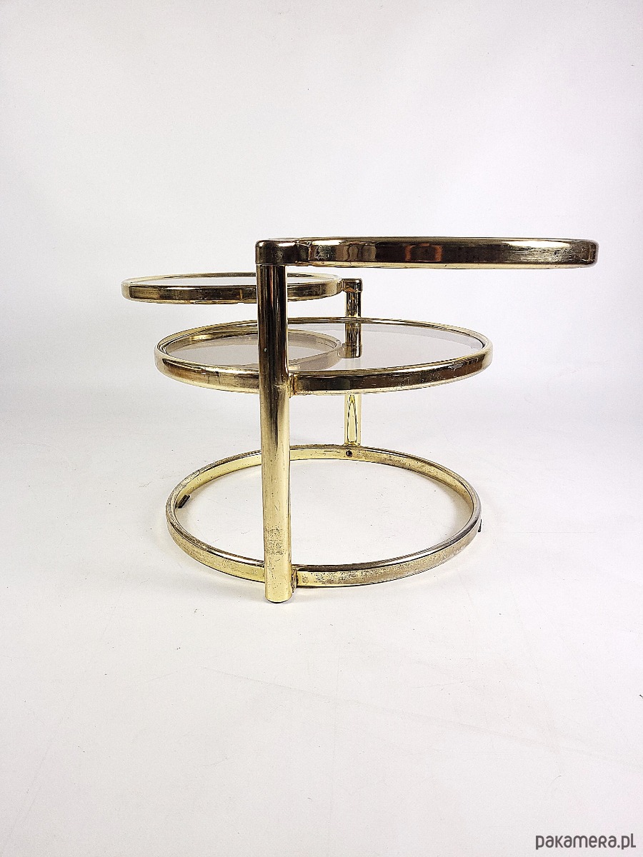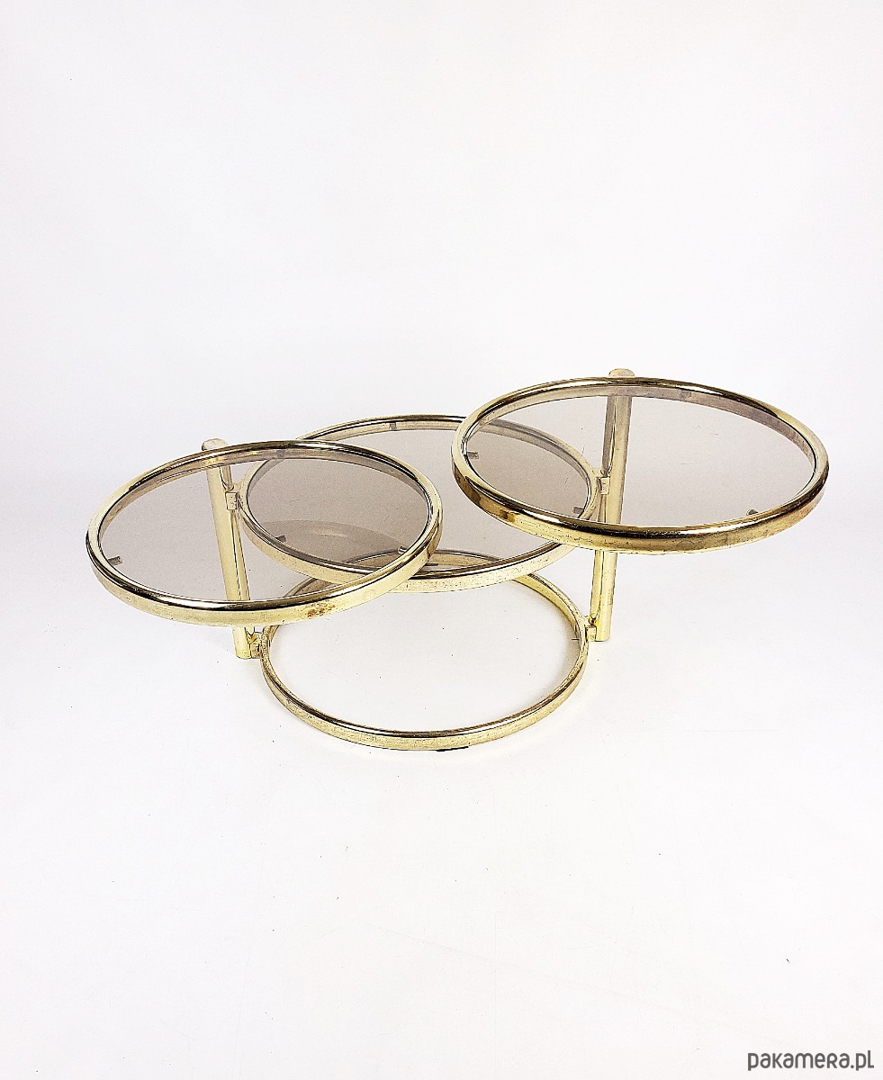 Stolik modułowy z lat 70. Stolik rozkłada się w kilku wariantach. Widoczne utlenienia w części metalowej, chromowanej. tafla szkła posiada delikatne zarysowania.