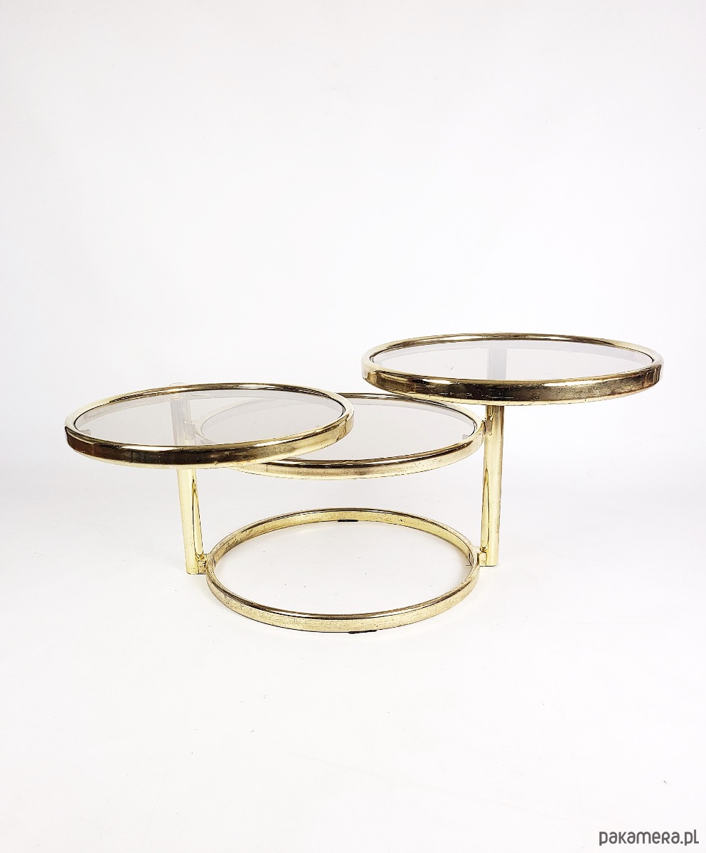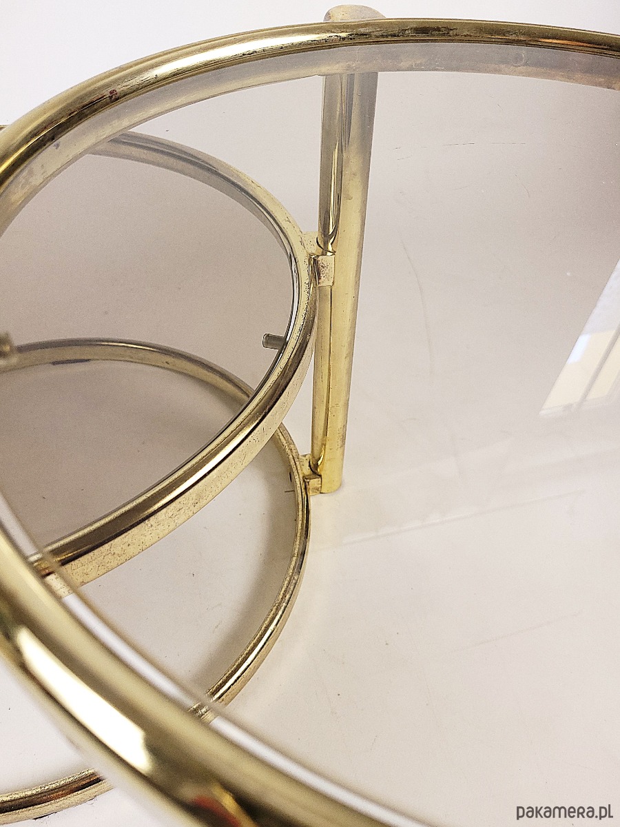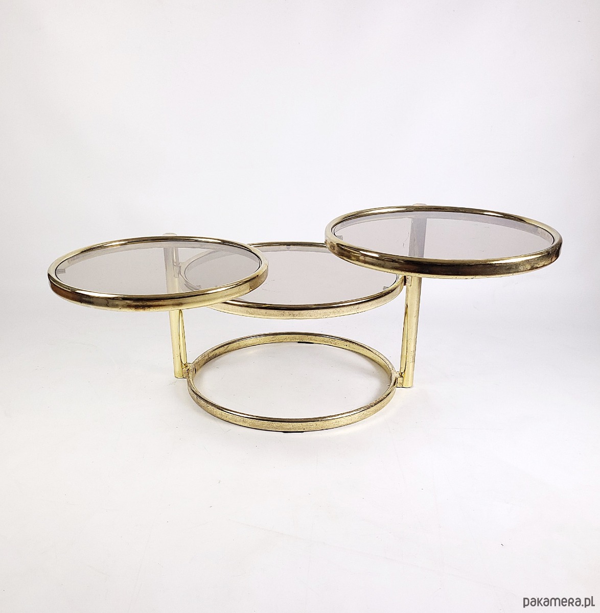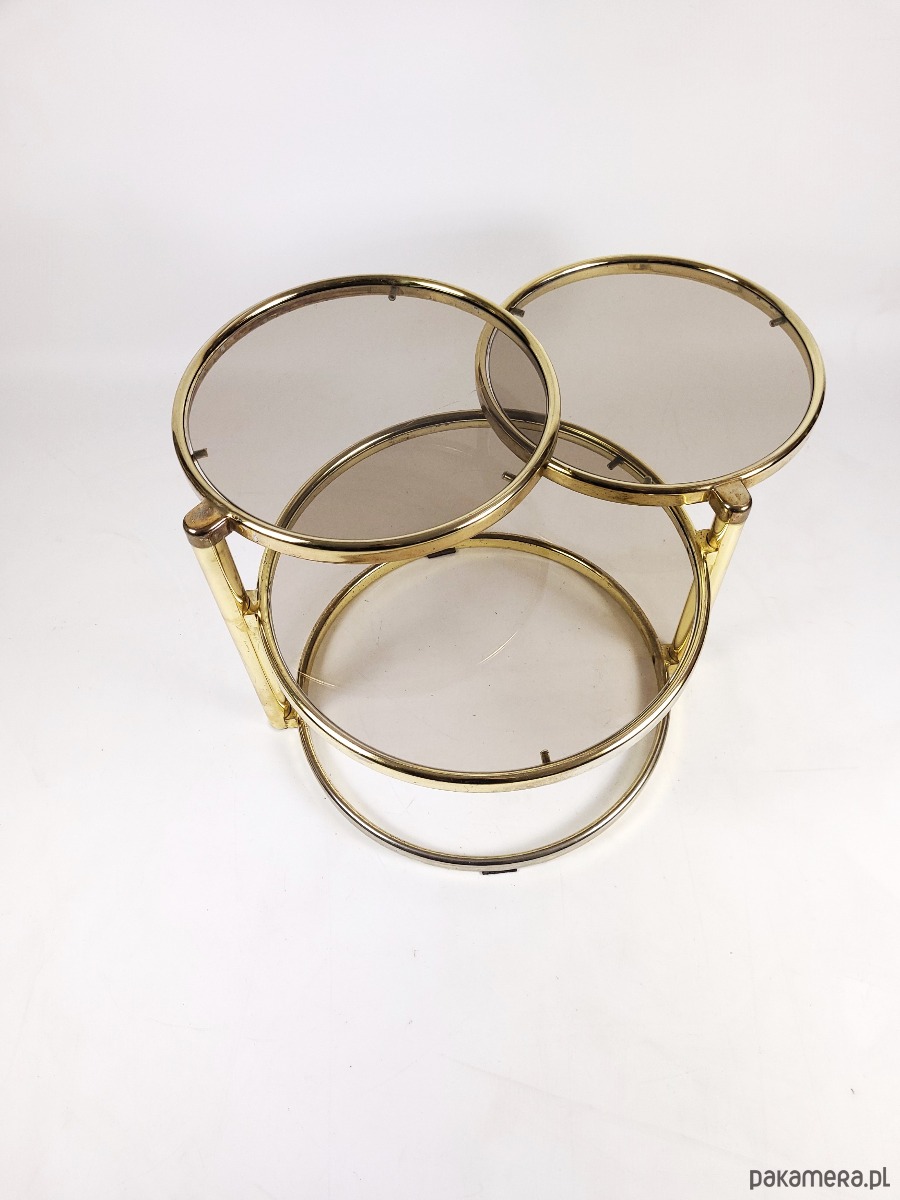 Stolik modułowy z lat 70. Stolik rozkłada się w kilku wariantach. Widoczne utlenienia w części metalowej, chromowanej. tafla szkła posiada delikatne zarysowania.