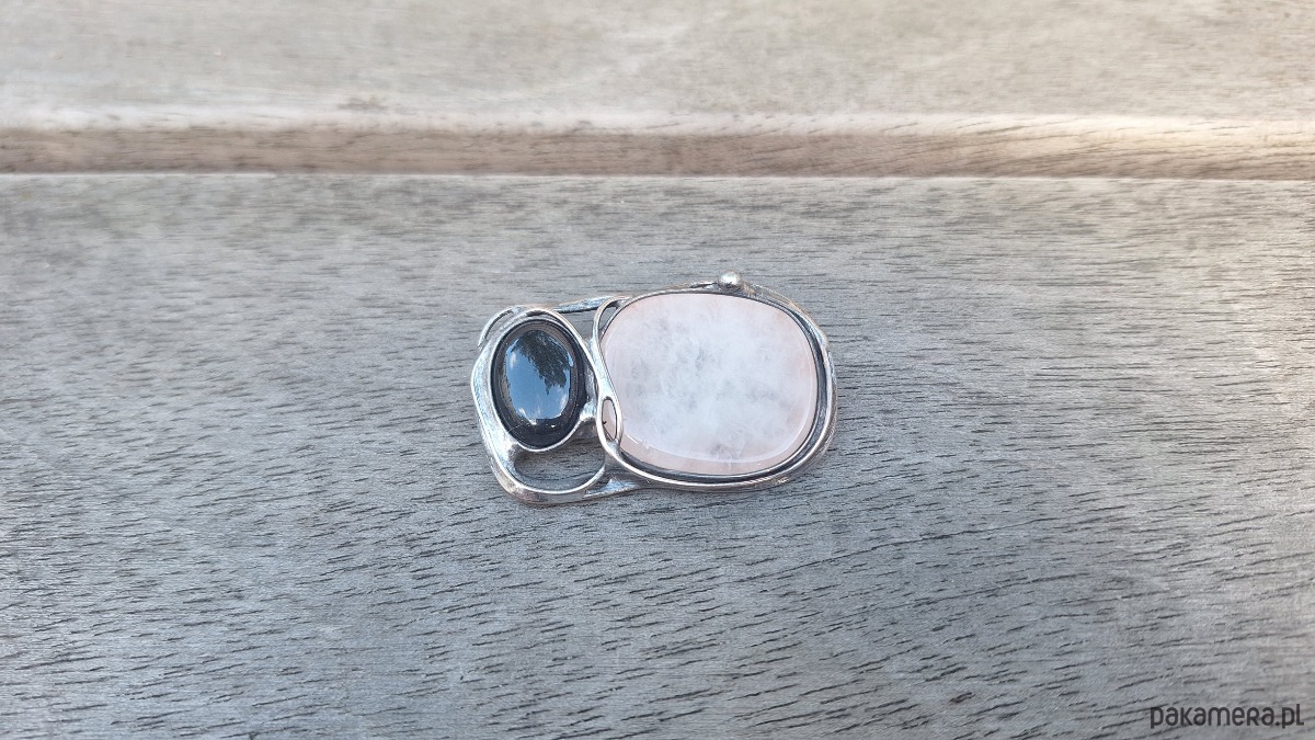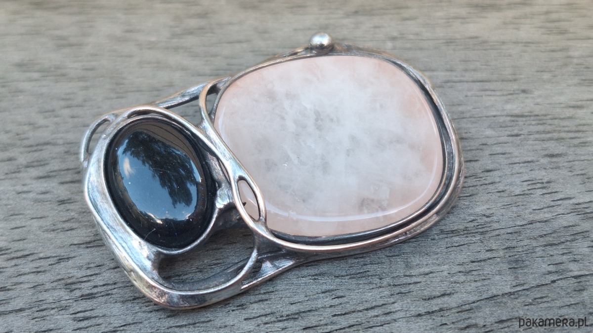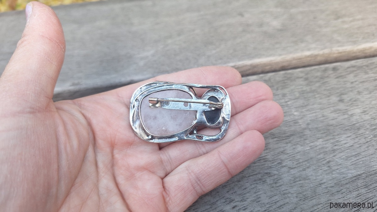 Broszka wykonana z miedzi, cyny, kwarcu i szkła. Wymiary ok. 5 na 3 m. Zapięcie metalowe.