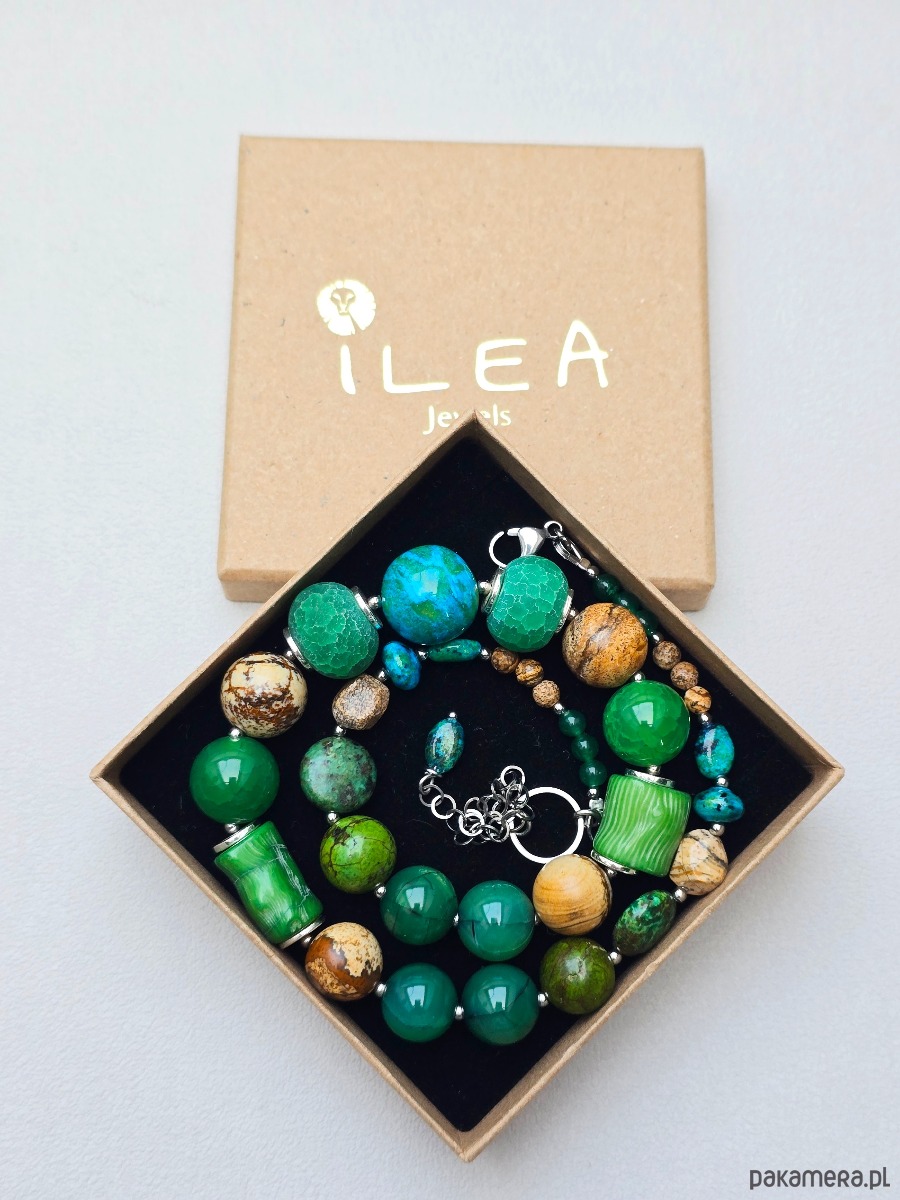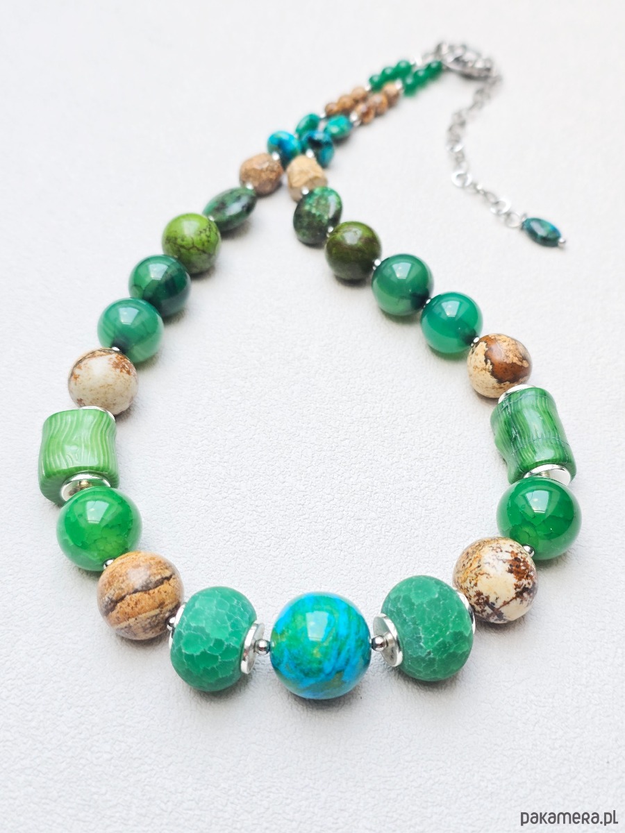 Wykorzystane kamienie: azuryt ( największa środkowa kula), jaspis krajobrazowy, agat zielony, chryzokola, howlit, turkus afrykański, koral, hematyt