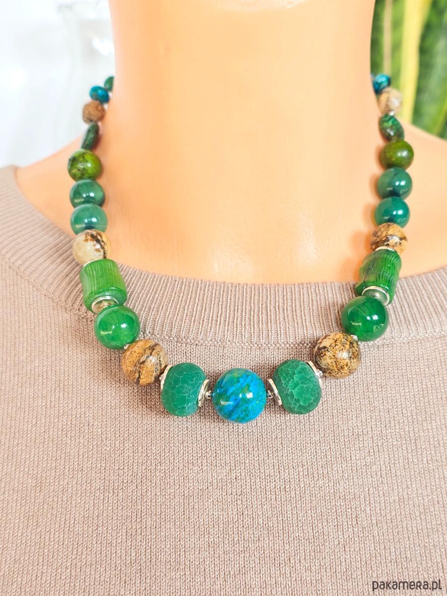 Unikatowy, stopniowany naszyjnik z kamieni naturalnych w zielono- brązowej kolorystyce, o średnicy od 4 do 18mm.