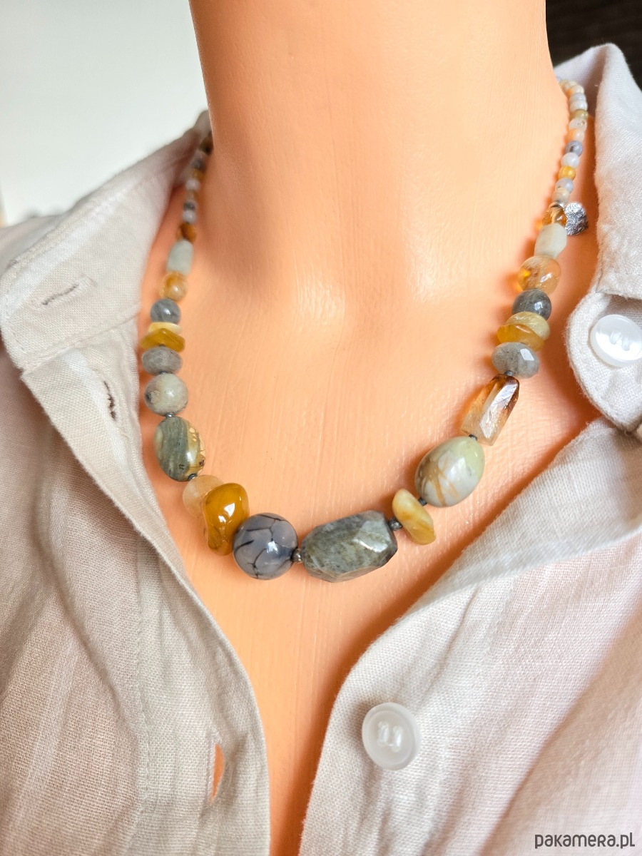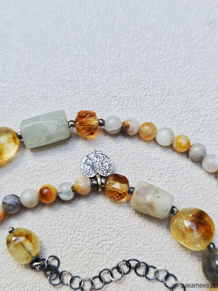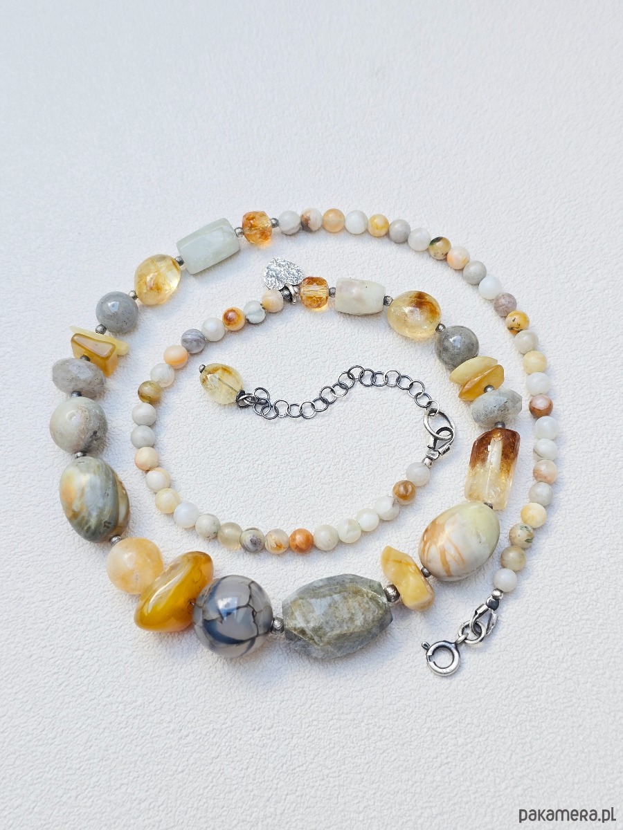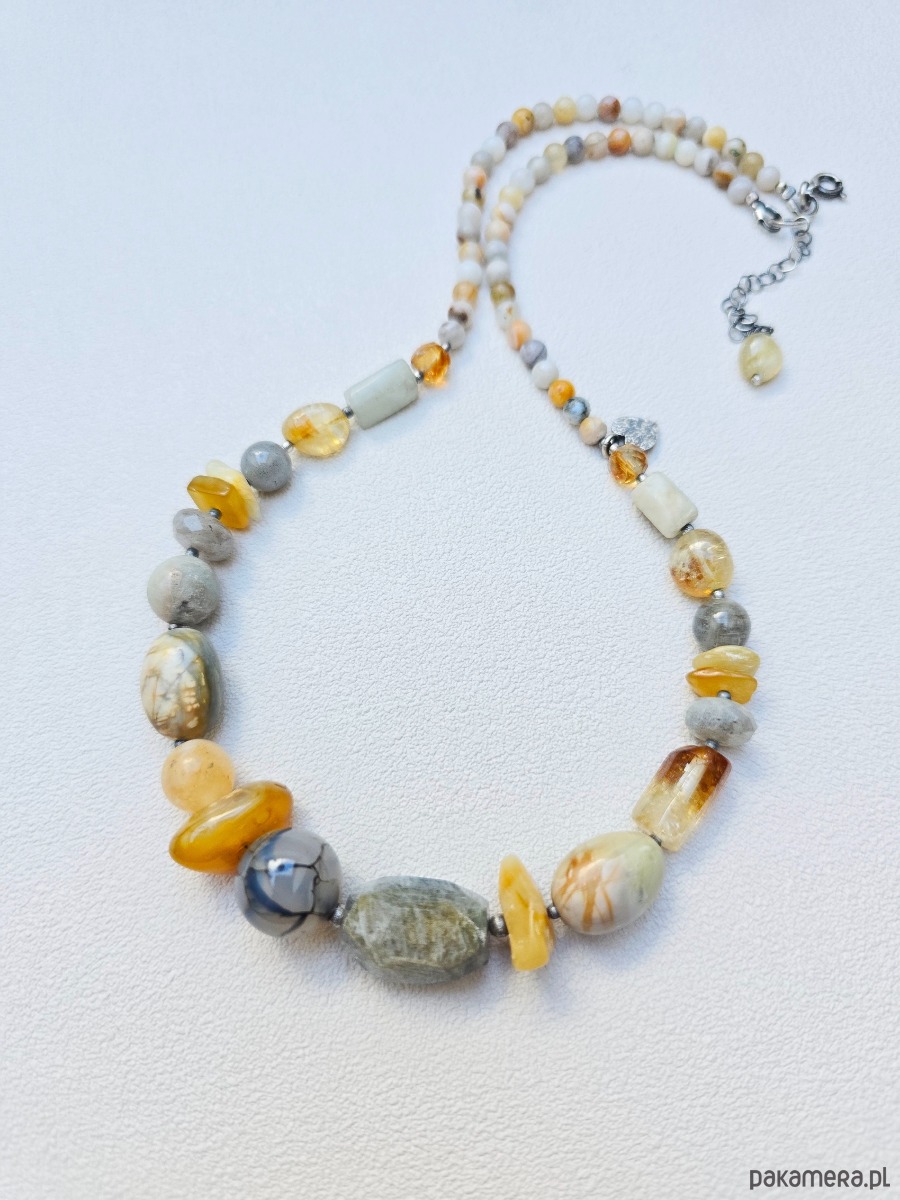 Wykorzystane kamienie: agat, cytryn, jadeit kwiatowy, jaspis Picasso, labradoryt, turmalin