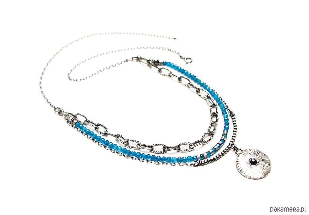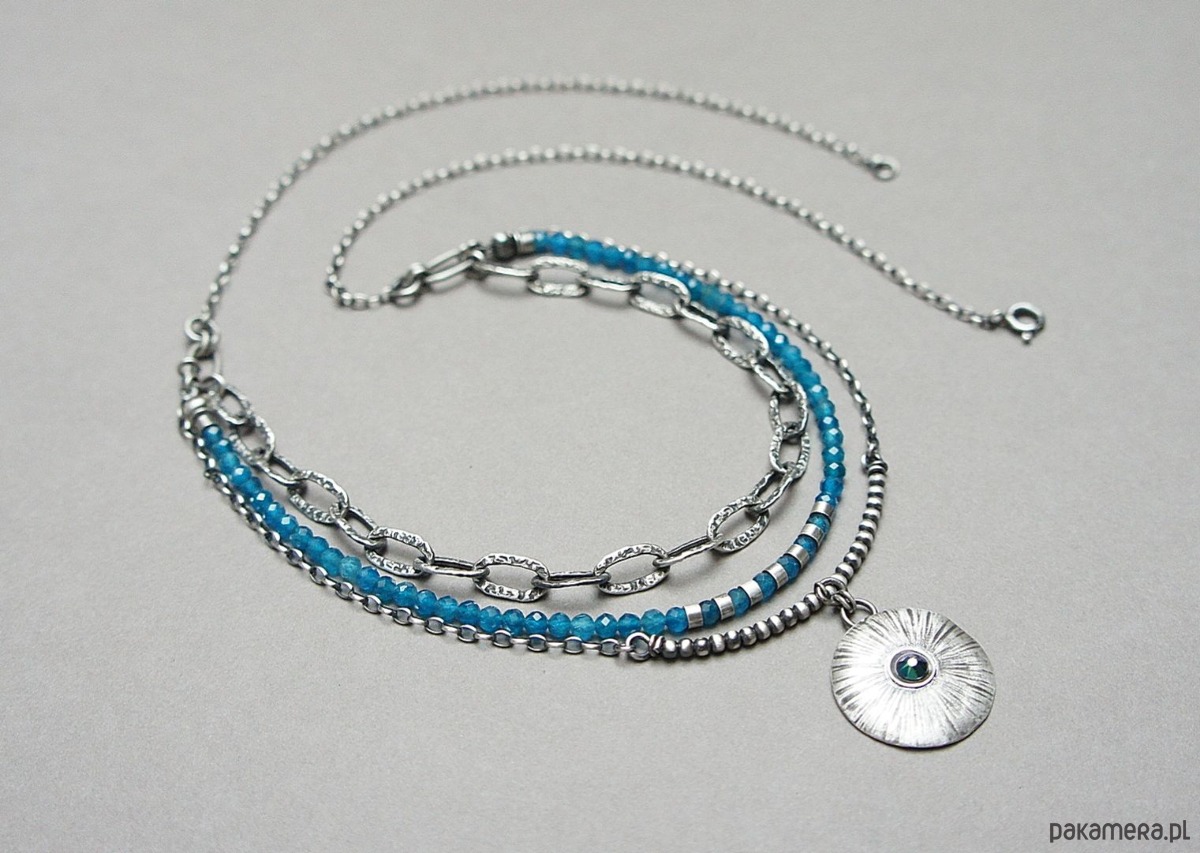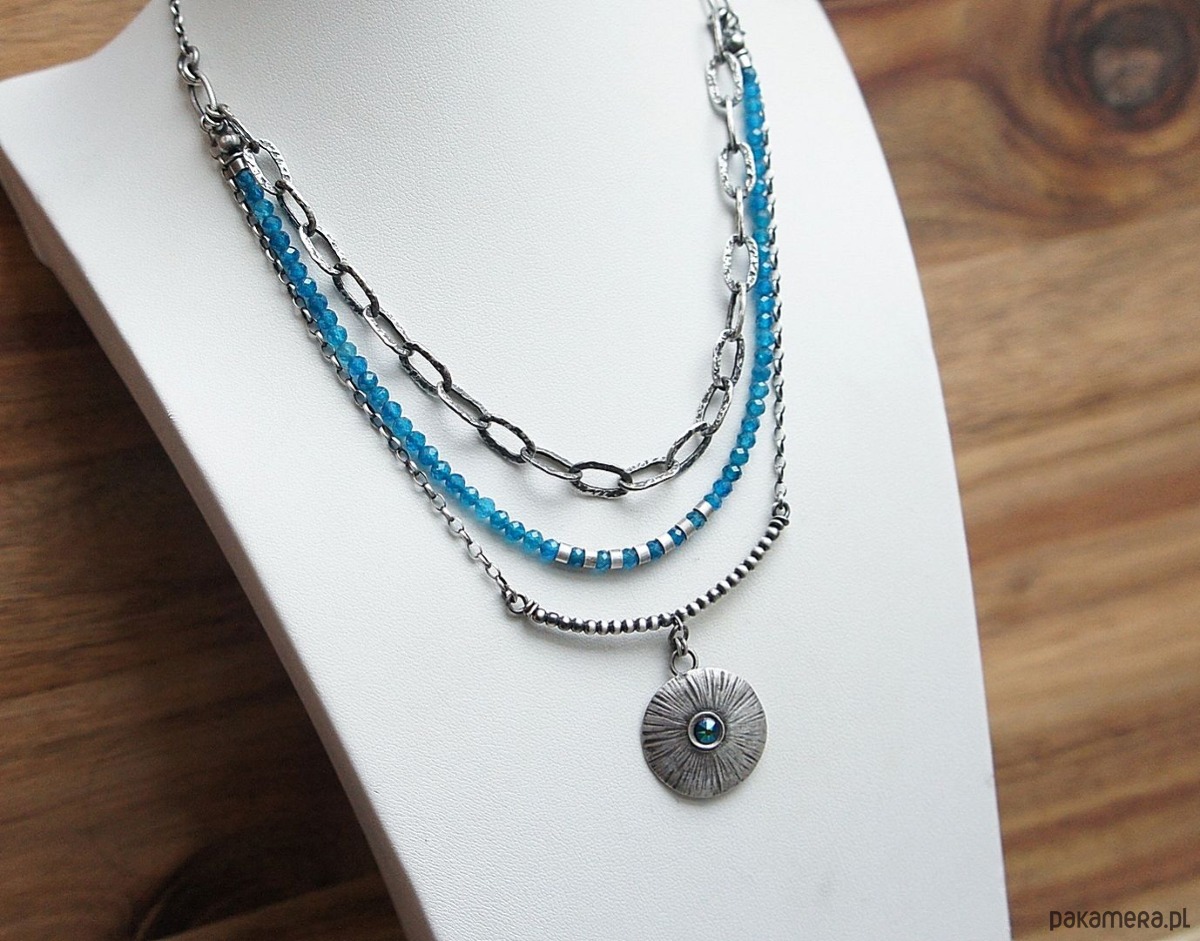 Naszyjnik trzyrzędowy wykonany własnoręcznie ze srebra [pr. 925] w połączeniu z kuleczkami apatytów [3mm] oraz zawieszką z kryształkiem Swarovski [22mm]. Całość oksydowana i przetarta. Długość naszyjnika około 60,5cm [po najdłuższym obwodzie]. Biżuteria ozdobnie zapakowana.
