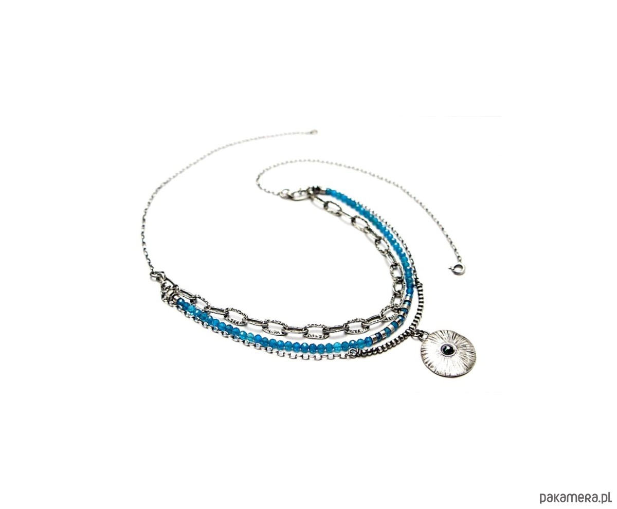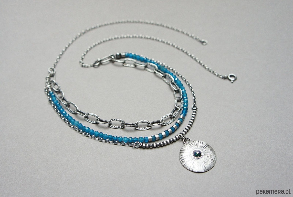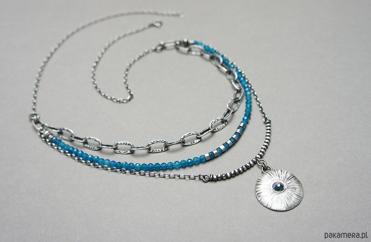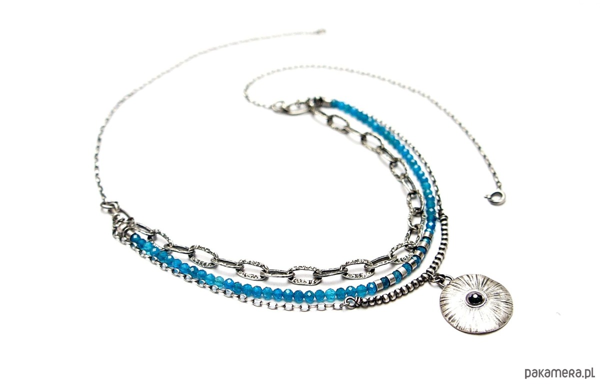 Naszyjnik trzyrzędowy wykonany własnoręcznie ze srebra [pr. 925] w połączeniu z kuleczkami apatytów [3mm] oraz zawieszką z kryształkiem Swarovski [22mm]. Całość oksydowana i przetarta. Długość naszyjnika około 60,5cm [po najdłuższym obwodzie]. Biżuteria ozdobnie zapakowana.