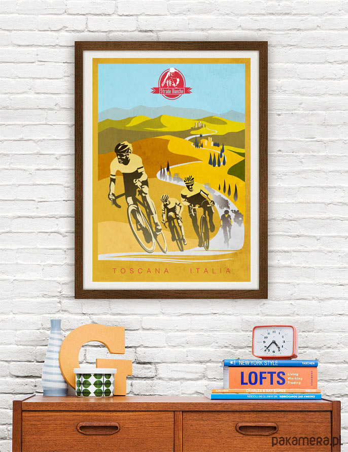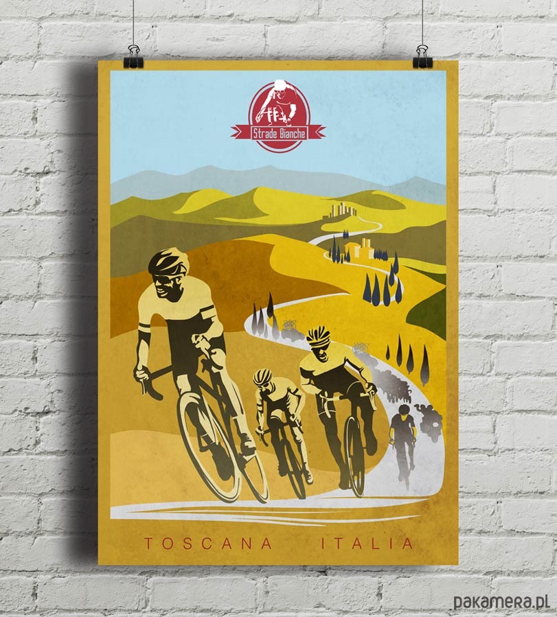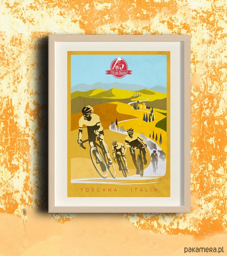 Plakat w stylu vintage z autorską grafiką inspirowaną wyścigiem kolarskim Strade Bianche odbywającym się w okolicach Sieny w Toskanii (Włochy).