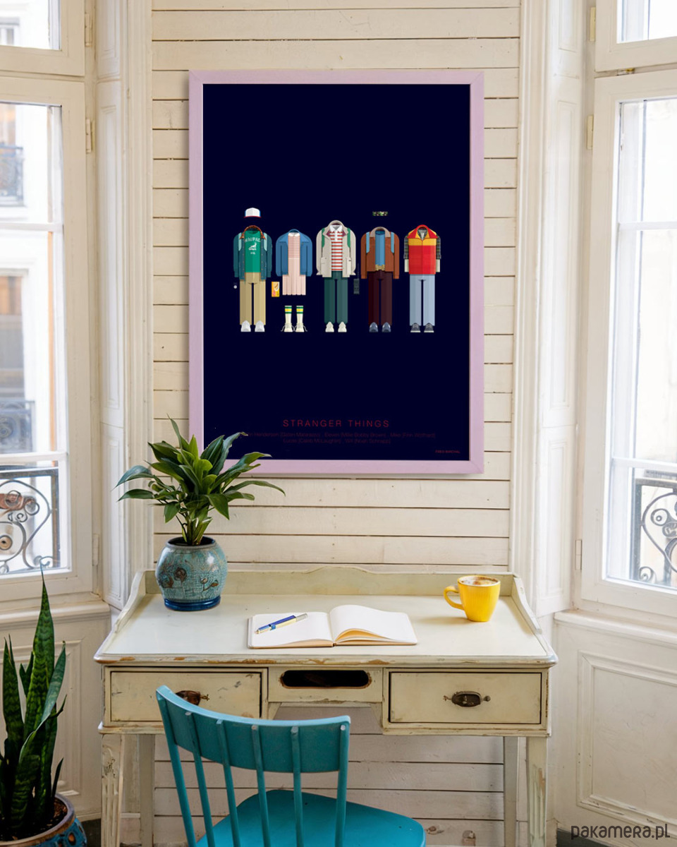 Plakat z autorską grafiką inspirowaną serialem "Stranger Things", stworzonym przez Duffer Brothers. Pochodzi z serii "TV & Cinema Costumes" i przedstawia stroje głównych bohaterów: Dustina, Eleven, Mikea, Lucasa i Willa.