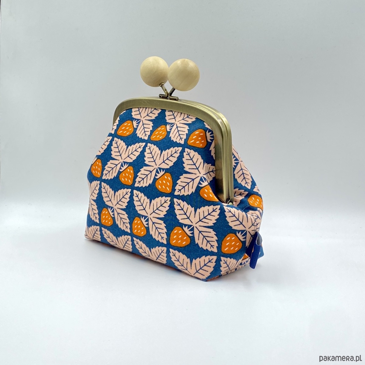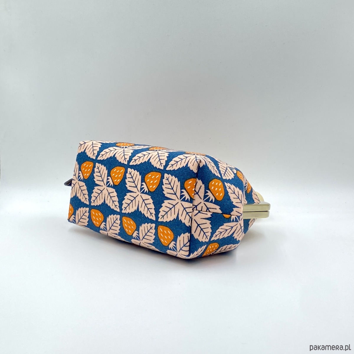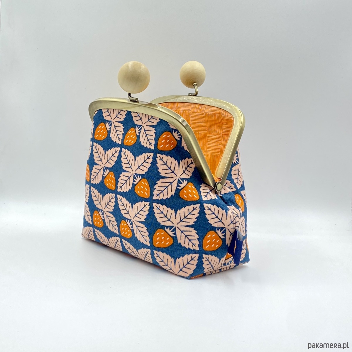 „Strawberry White” to torebka / kosmetyczka ze wzmocnionej bawełny w geometryczny wzór truskawek. Od wewnątrz znajduje się podszewka w pomarańczowym kolorze w naprzemienne kreski. Granatowa metka.