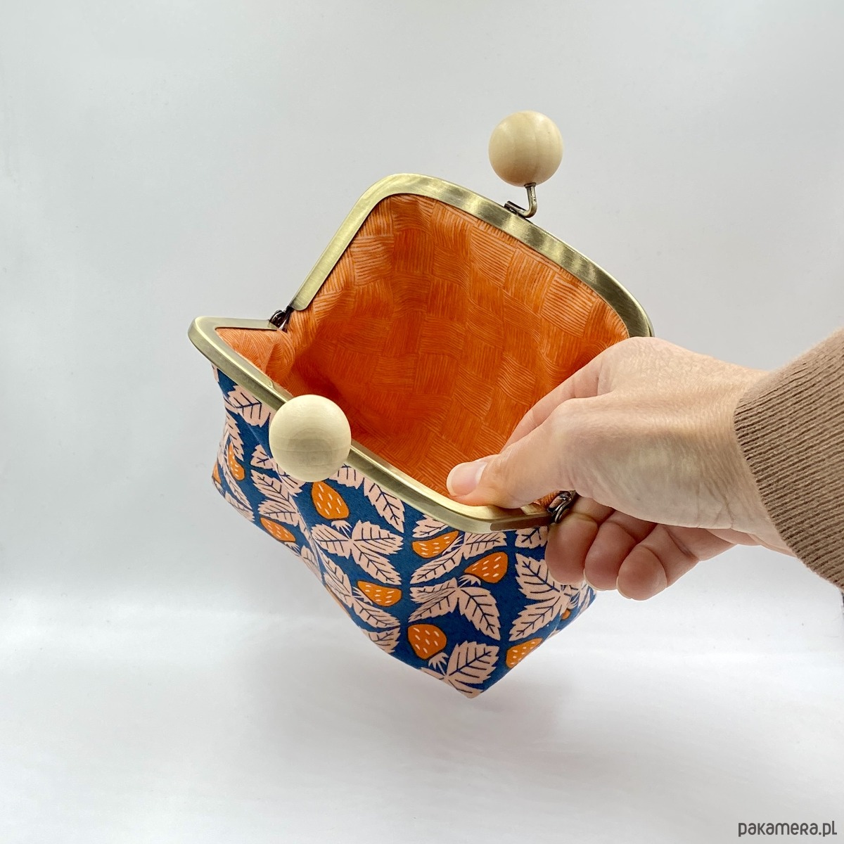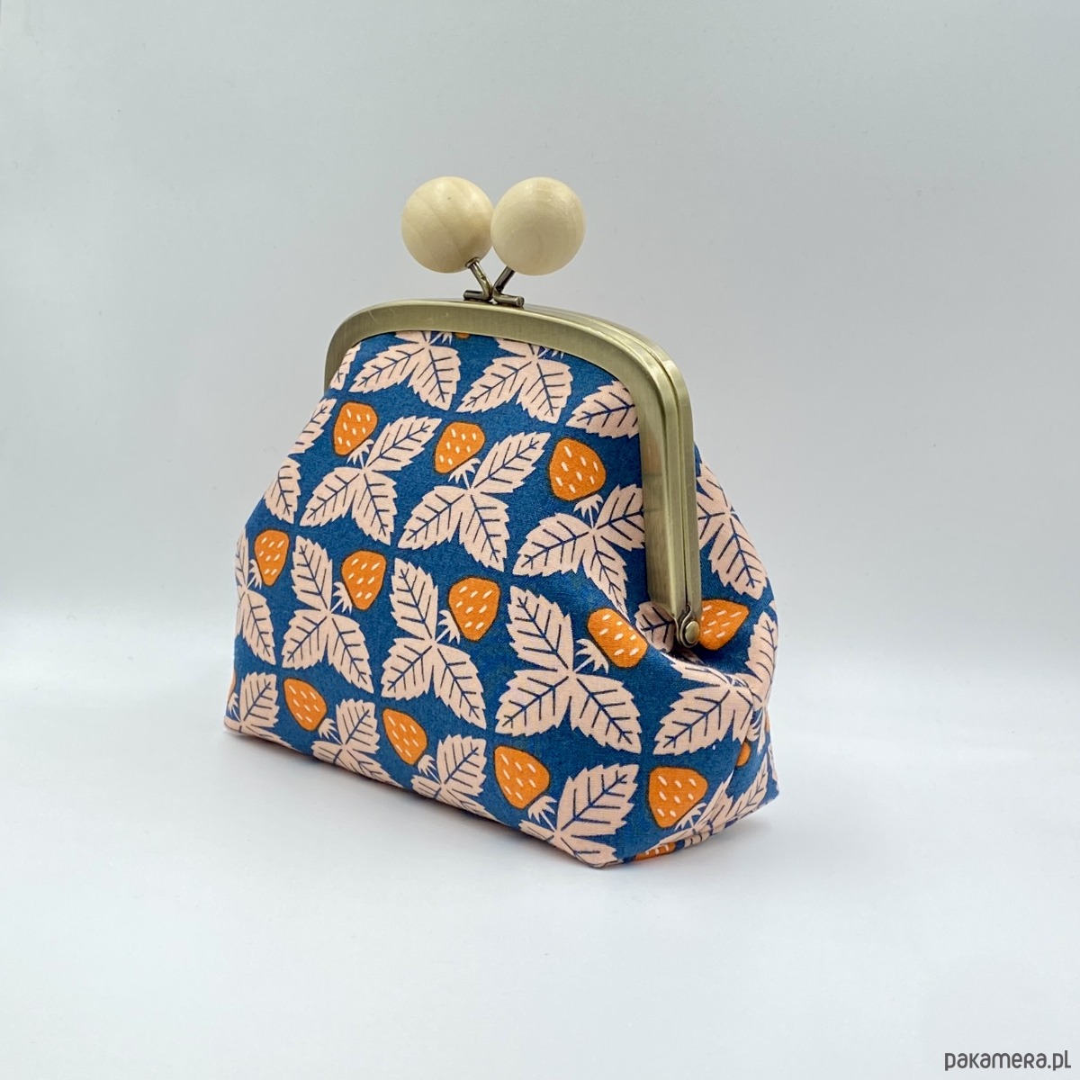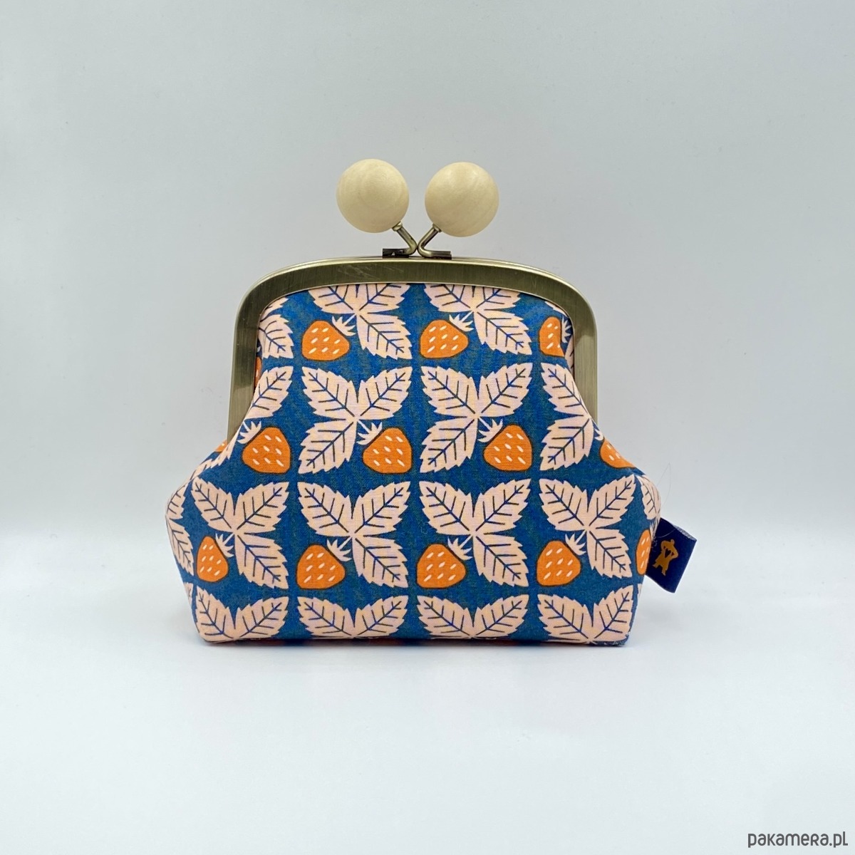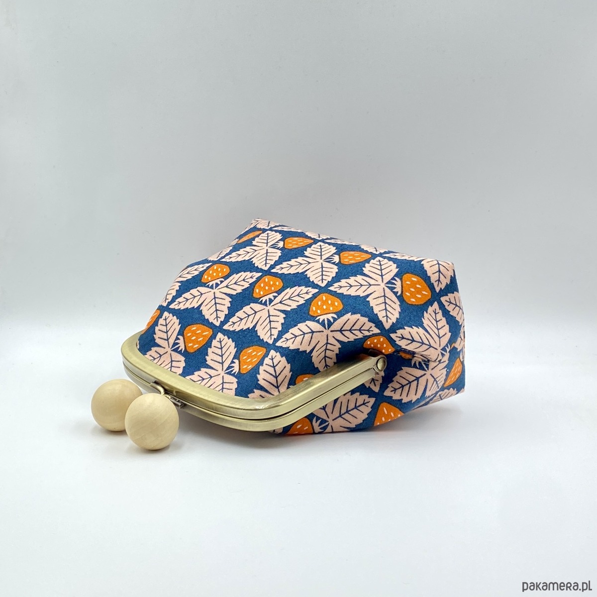 „Strawberry White” to torebka / kosmetyczka ze wzmocnionej bawełny w geometryczny wzór truskawek. Od wewnątrz znajduje się podszewka w pomarańczowym kolorze w naprzemienne kreski. Granatowa metka.
