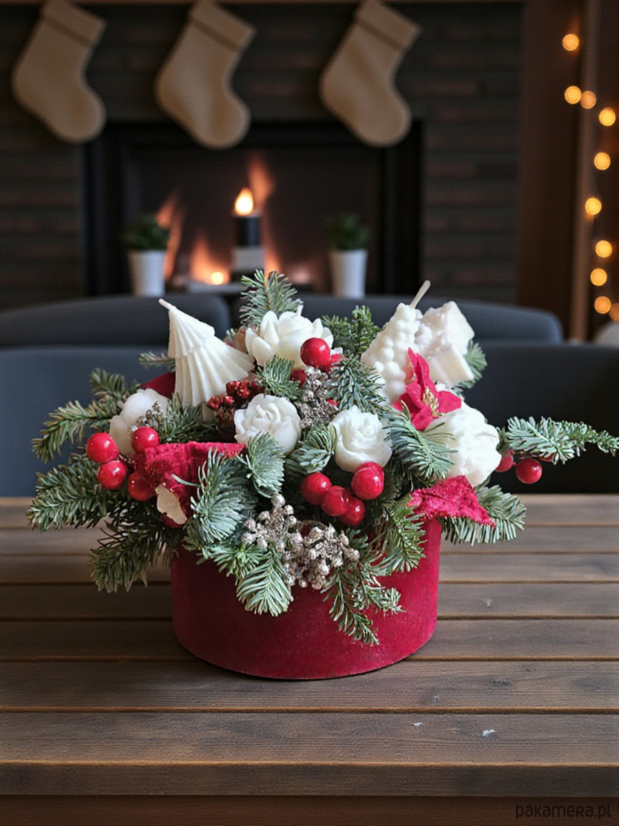 Wprowadź do swojego wnętrza prawdziwą magię świąt dzięki wyjątkowemu stroikowi stworzonemu na eleganckim, miękkim pluszowym boxie. To niepowtarzalna dekoracja, która łączy w sobie ciepło naturalnych materiałów, klimatyczne światło świec oraz estetykę klasycznych bożonarodzeniowych ozdób.