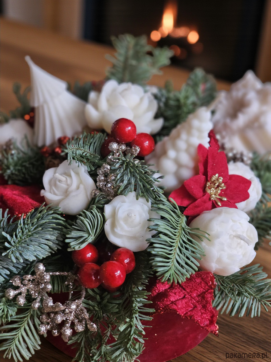 Świąteczny stroik na pluszowym boxie z ręcznie robionymi świecami sojowymi.
