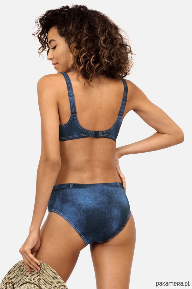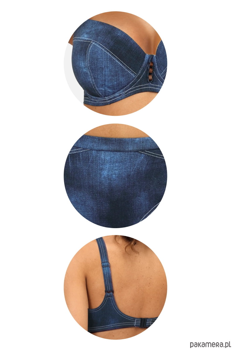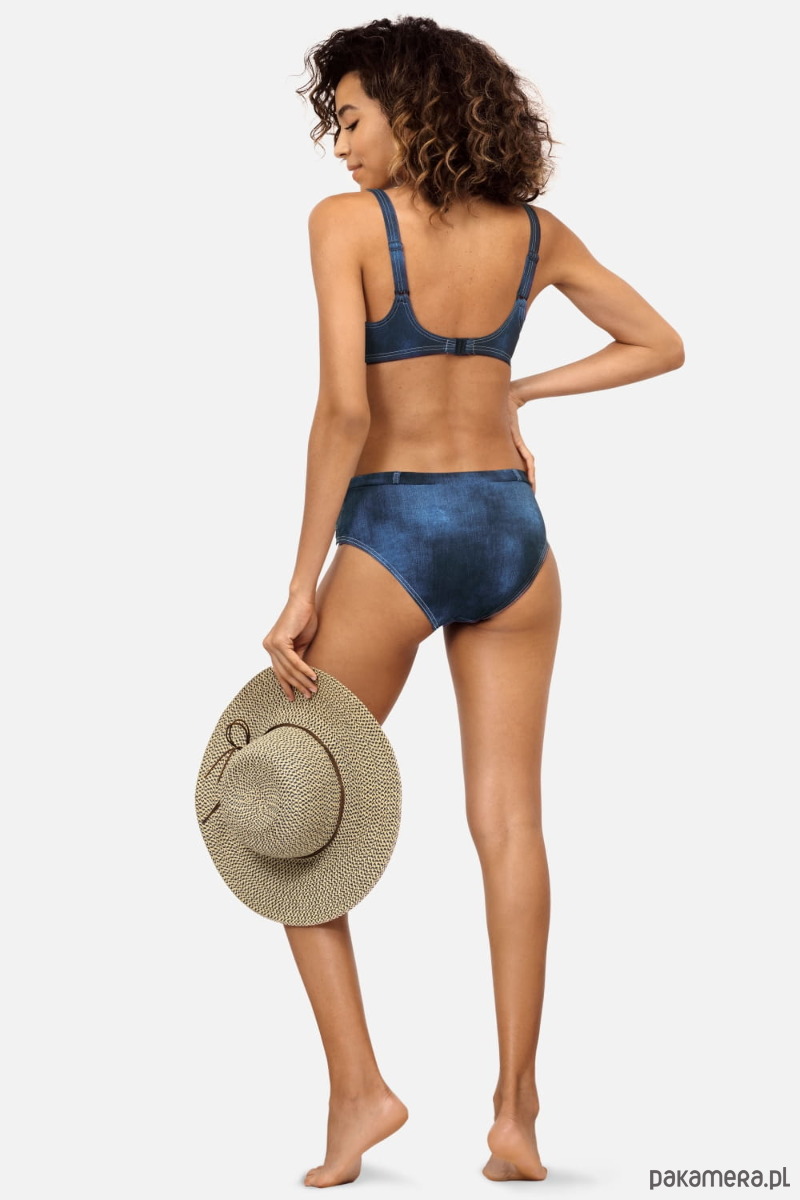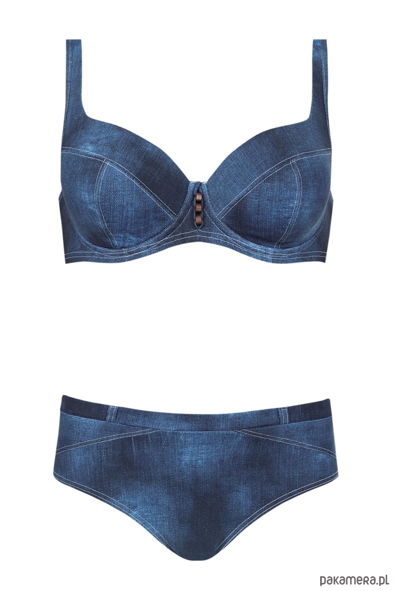 Strój kąpielowy (fason) na piankowej misce, częściowo usztywniony, z regulowanymi ramiączkami. Dzięki fiszbinom i pionowo-poziomemu cięciu miseczki doskonale podtrzymuje biust, dlatego dedykowany jest szczególnie Paniom z bardzo dużą miseczką. Subtelne, ozdobne, drewniane koraliki na łączeniu miseczek, a zapięcie obwodu pod biustem na praktyczną zapinkę na zatrzask. Ciemno niebieska tkanina imitująca dekatyzowany, przecierany jeans* nadaje modelowi nie tylko oryginalnej prezencji, ale i stylowego designu. Figi z wyższym stanem, wzmocnione siatką. Konstrukcja na bazie modelu Frida.