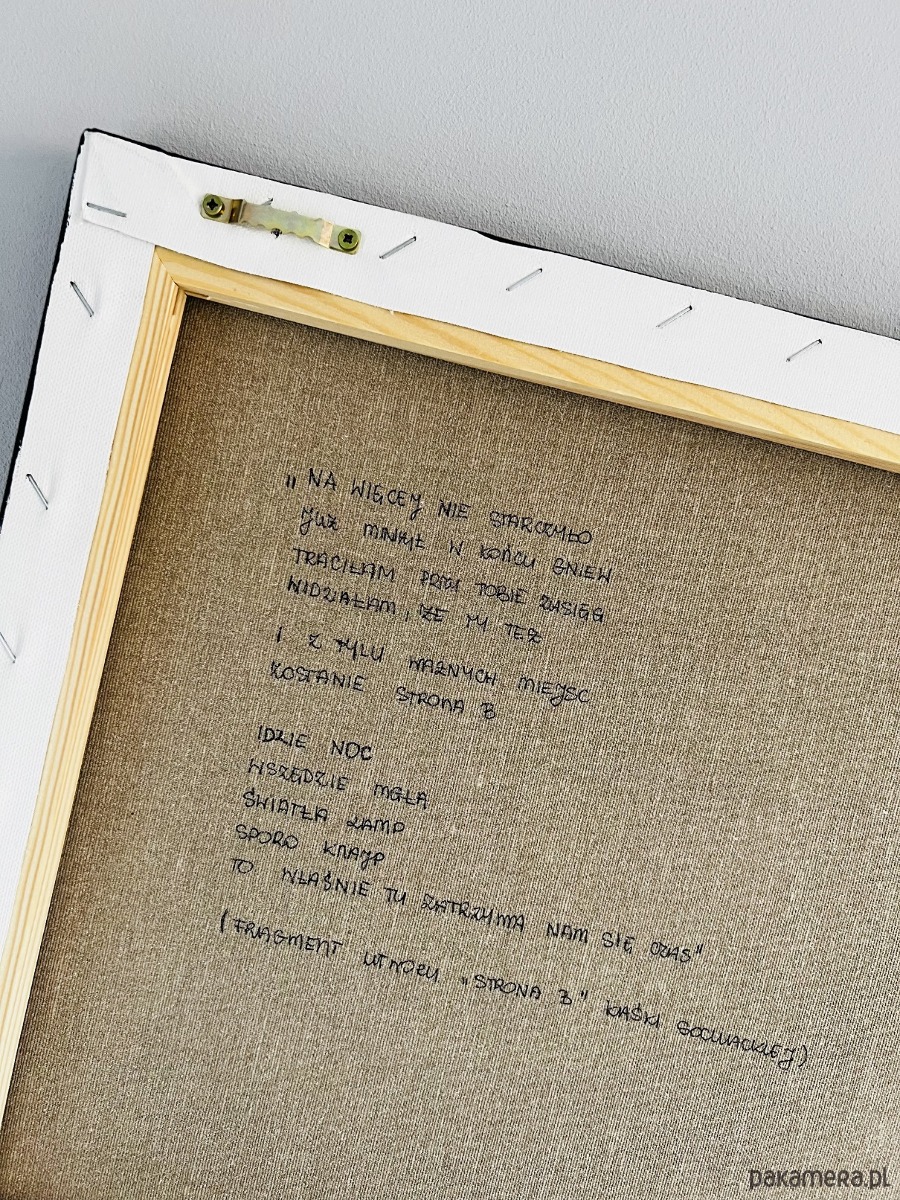 Na rewersie zawarty został fragment utworu "Strona B" Kaśki Sochackiej. Praca pochodzi z cyklu "MADISON. Namalowałam piosenki". Obraz stanowi interpretację utworu Kaśki Sochackiej "Strona B", pochodzącego z płyty "Ta druga'. Za zgodą Autorki kompozycji muzycznej, na rewersie płótna zawarty został fragment malowanej piosenki.