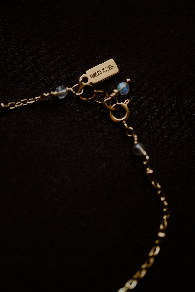 Długość 17,5 cm. Aby nie stracić swej delikatności łańcuszek z regulacją jest krótki. Jeśli potrzebujesz bransoletkę w innym rozmiarze, napisz go w uwagach do zamówienia, a stworzę ją na Twój wymiar ⊹ ࣪ ˖ Wykończona pozłacaną stalą jubilerską. Sygnowana logiem marki. Dostępna tylko do końca miesiąca.