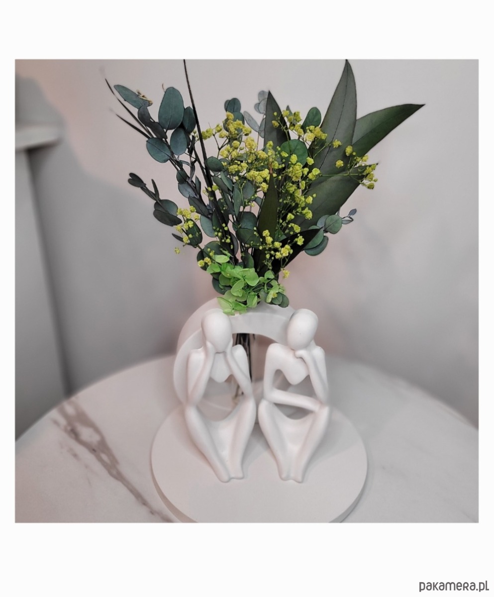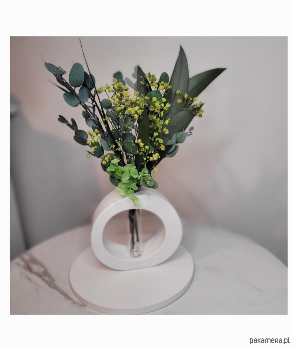 Autorski zestaw z gipsu z wazonem i stabilizowanymi roślinami.