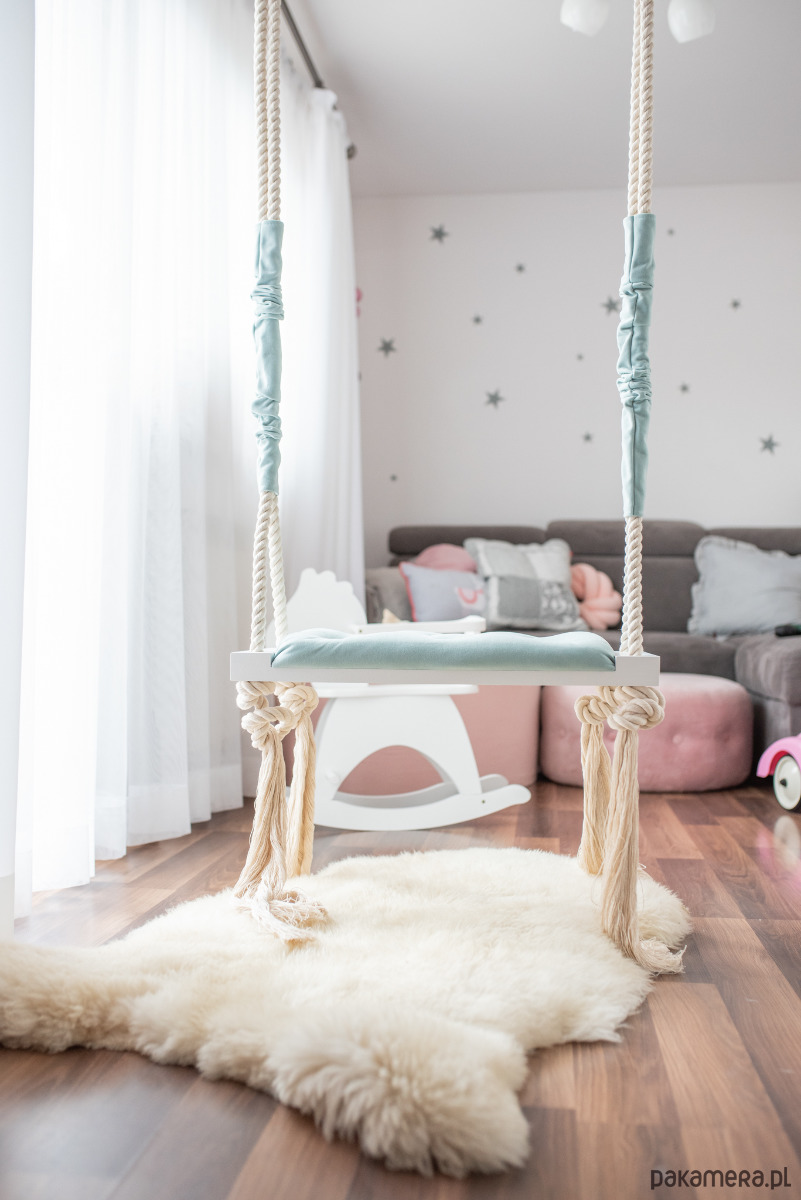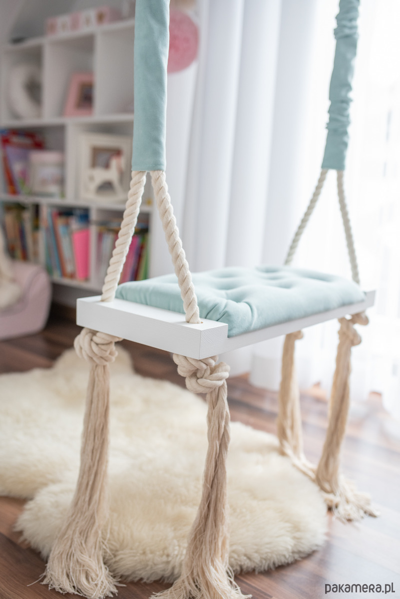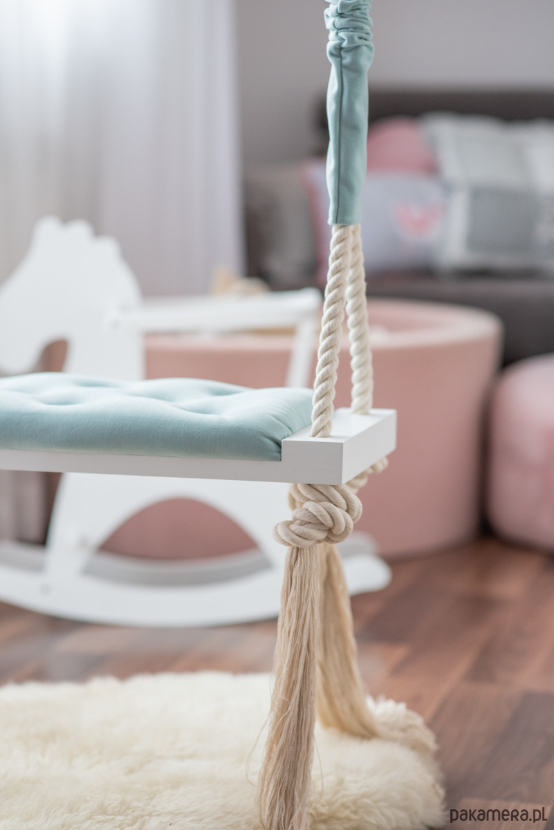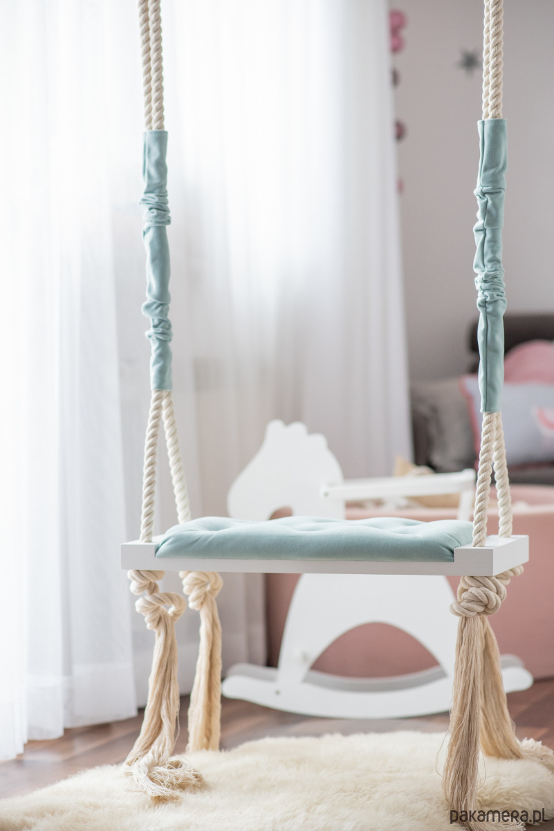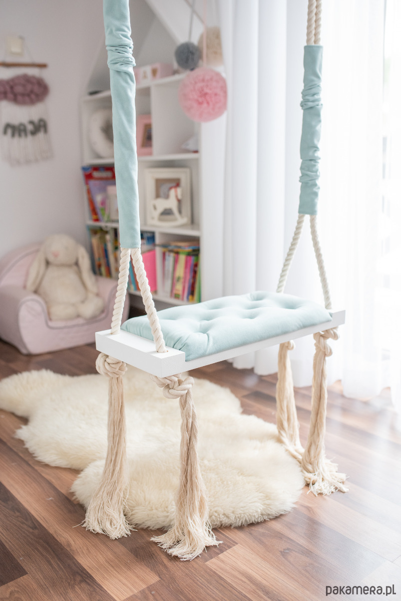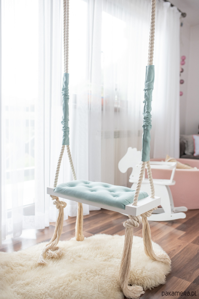 Elegancka huśtawka na linach z tapicerowany siedziskiem w kolorze miętowym. Huśtawka może być piękną dekoracją w pokoju dziecięcym albo salonie. Ale to nie wszystko bo coraz częściej nasza huśtawka jest zamawiana do wyjątkowych sesji fotograficznych, do kwiaciarni czy restauracji.