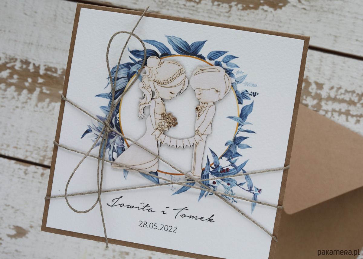 Oryginalna kartka ślubna z kopertą. Imiona, data i życzenia są przykładowe.