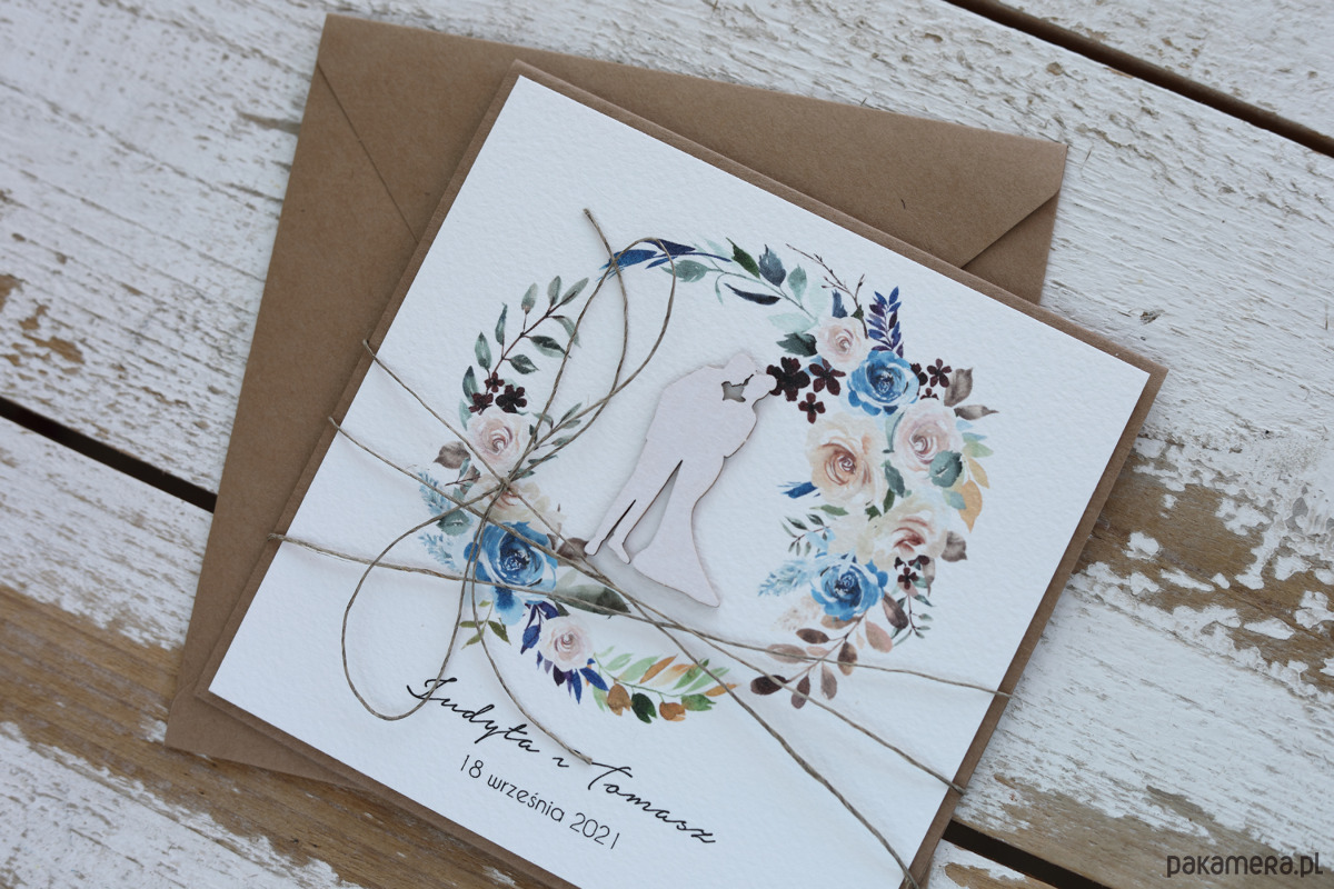 Oryginalna kartka ślubna z kopertą. Imiona, data i życzenia są przykładowe.
