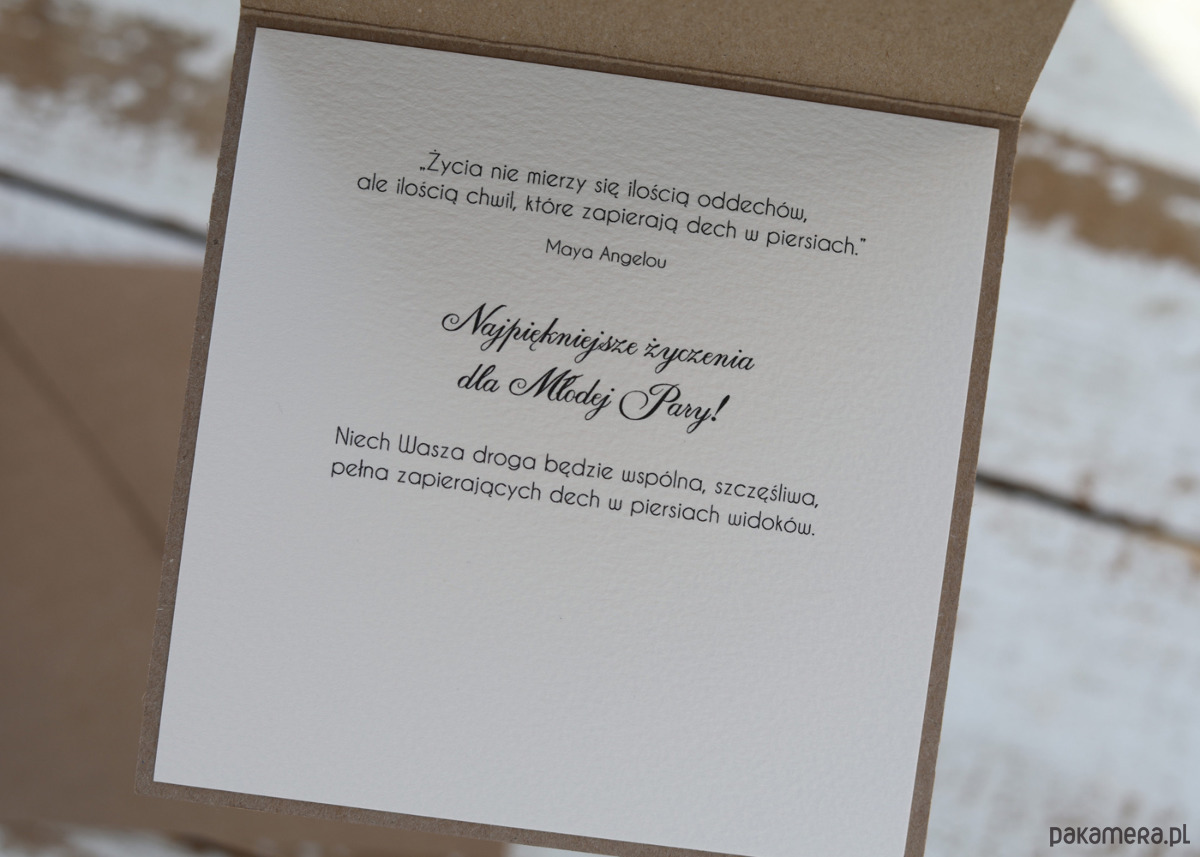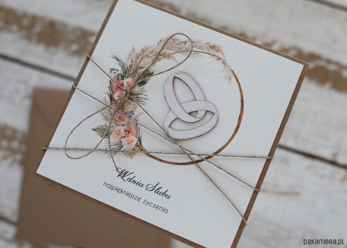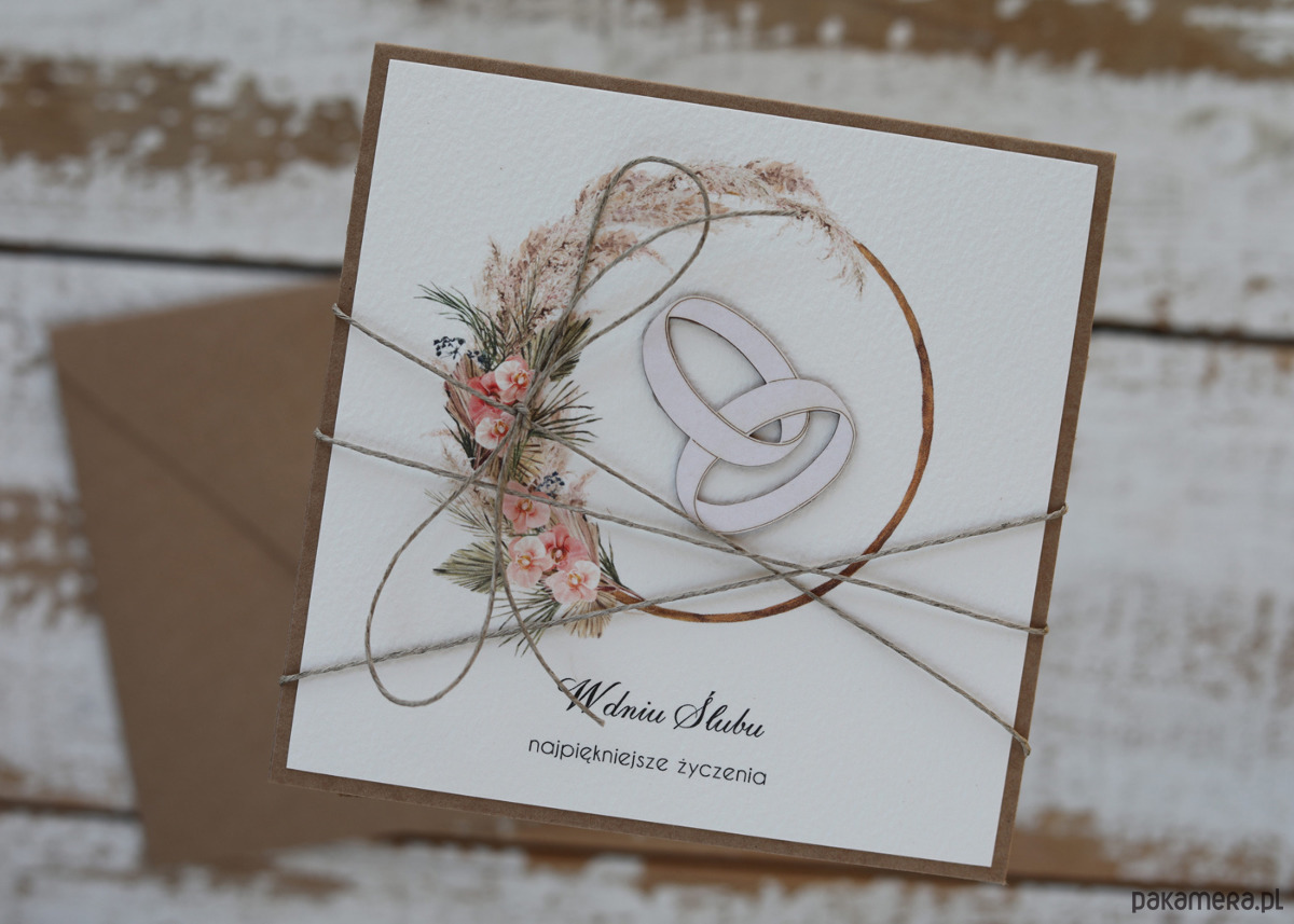 Wyjątkowa kartka ślubna wykonana z produktów eko w tym z papieru kraftowego, bawełnianego 100% w odcieniu brzoskwini, tekturkowej ozdoby, przewiązana lnianym sznureczkiem.