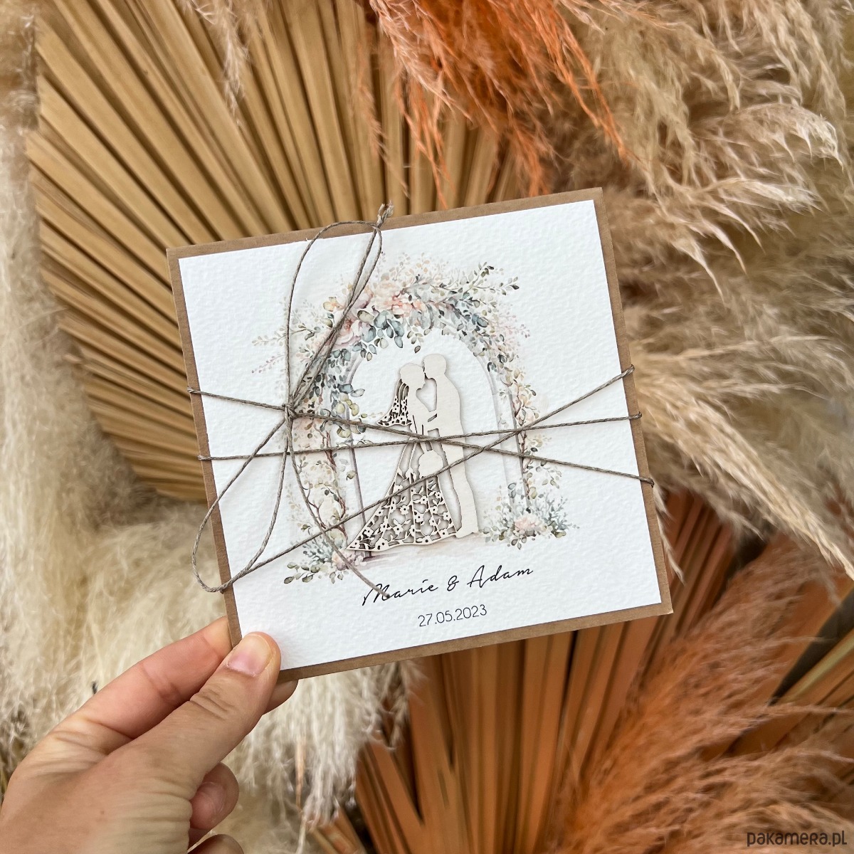 Kartka o wymiarach 14x14 cm wykonana z papieru kraftowego, papieru bawełnianego oraz z najlepszej jakości tekturki. Personalizacja na przodzie kartki i w środku - proszę o podanie danych w uwagach do zamówienia -
