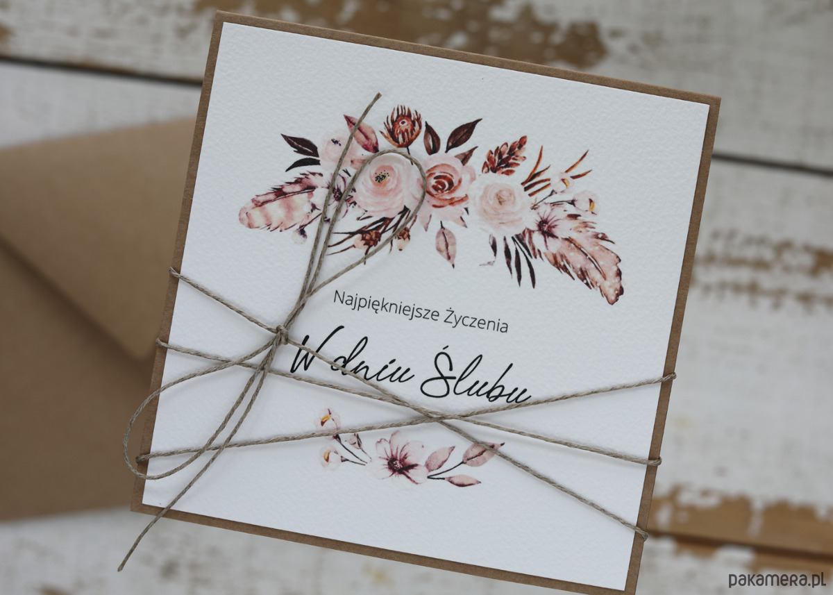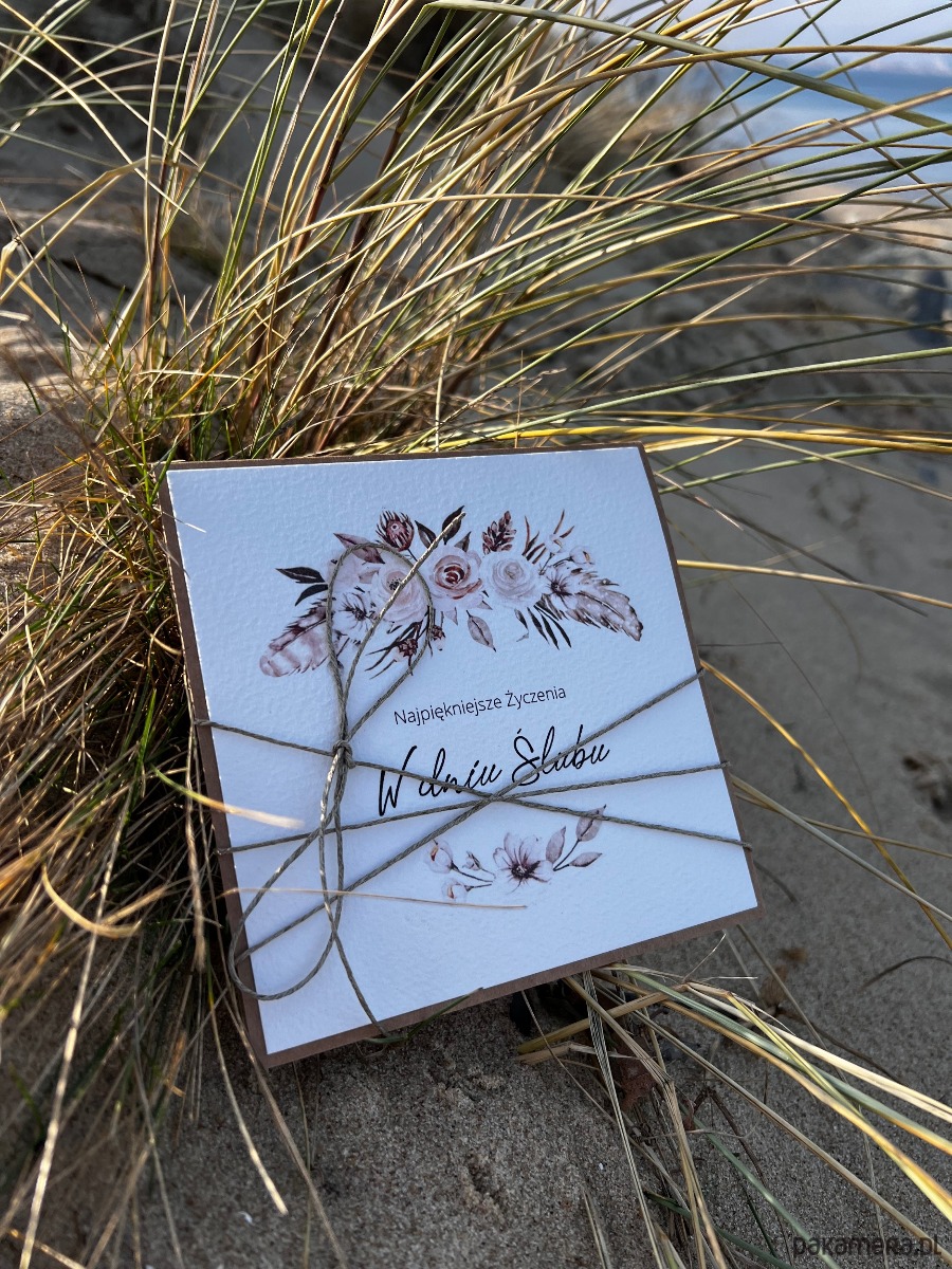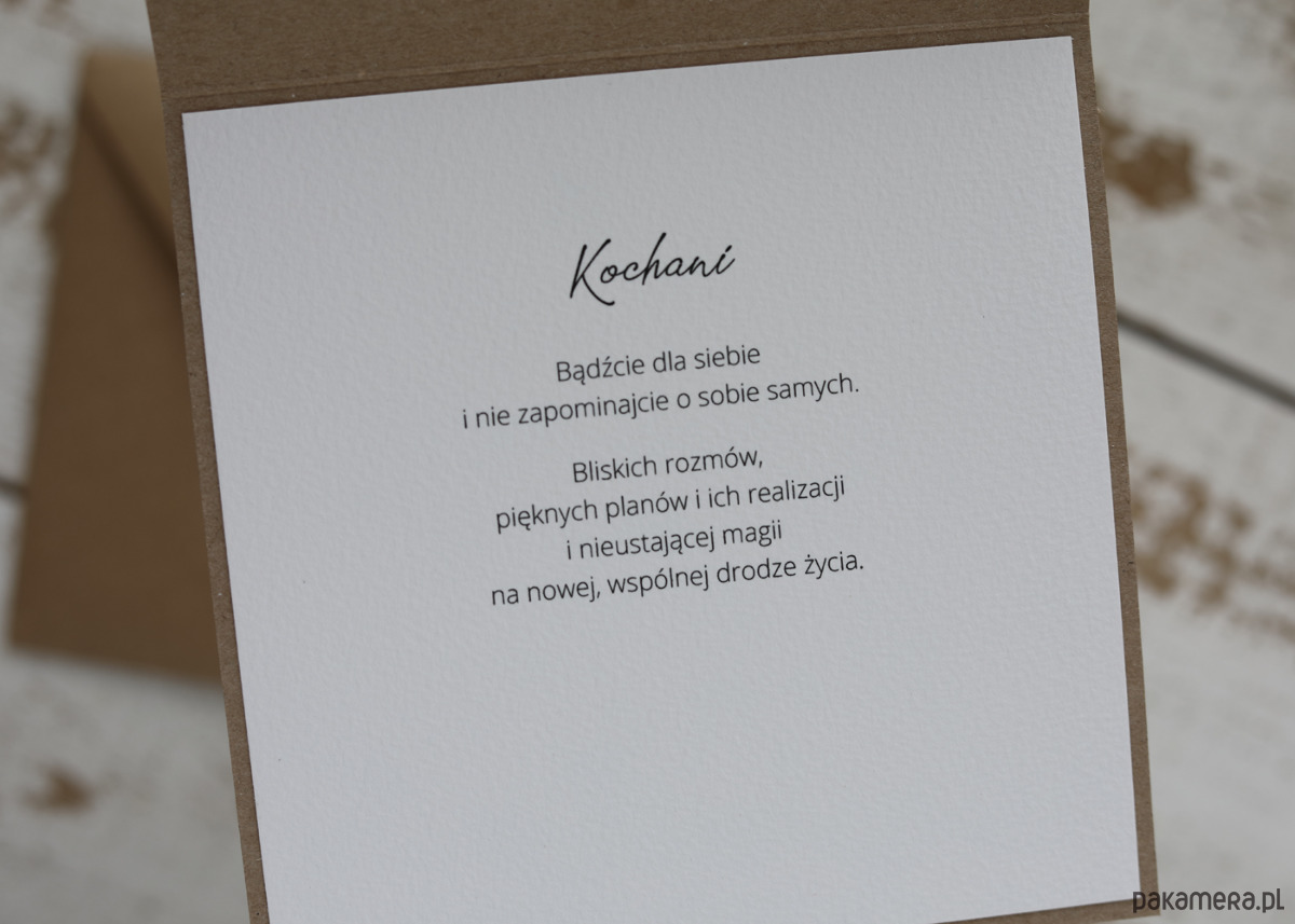 Wymiar 14x14 cm. Kartka wykonana na bazie papieru kraftowego z użyciem papieru bawełnianego z nadrukiem. Z gotowymi życzeniami jak na zdjęciu.