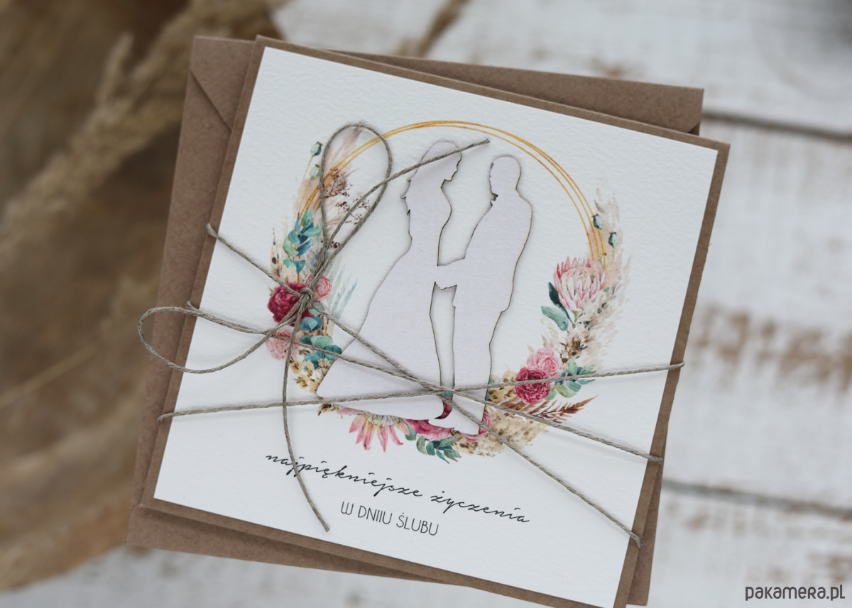 Oryginalna kartka na ślub. Kartka 14x14 wraz z kopertą. Kartka wykonana z papieru kraftowego, papieru bawełnianego w odcieniu brzoskwini oraz tekturki.