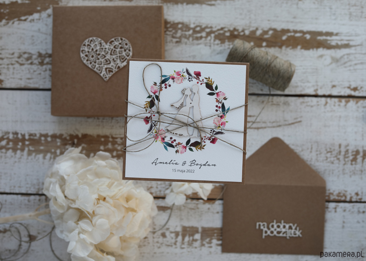 Oryginalna kartka ślubna z pudełkiem i kopertą "na dobry początek". Imiona, data i życzenia są przykładowe.