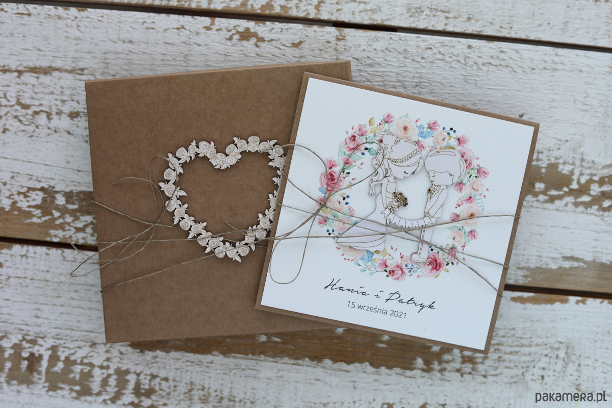 Oryginalna kartka ślubna z pudełkiem. Imiona, data i życzenia są przykładowe.