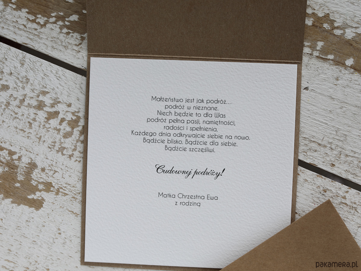 Kartka o wymiarach 14x14 cm wykonana z papieru kraftowego, papieru bawełnianego oraz z najlepszej jakości tekturki. Personalizacja na przodzie kartki i w środku - proszę o podanie danych w UWAGACH do ZAMÓWIENIA -