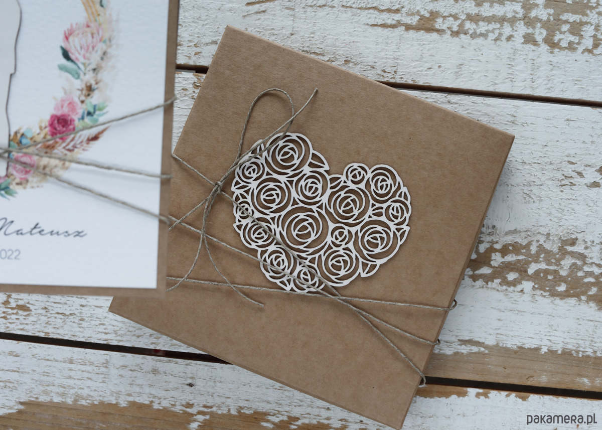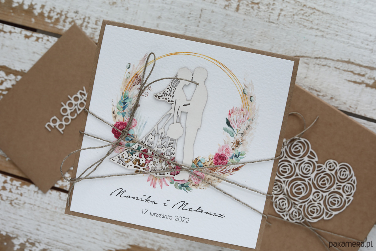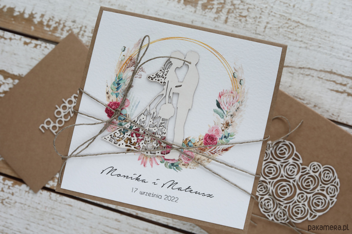 Kartka o wymiarach 14x14 cm wykonana z papieru kraftowego, papieru bawełnianego oraz z najlepszej jakości tekturki. Personalizacja na przodzie kartki i w środku - proszę o podanie danych w uwagach do zamówienia -