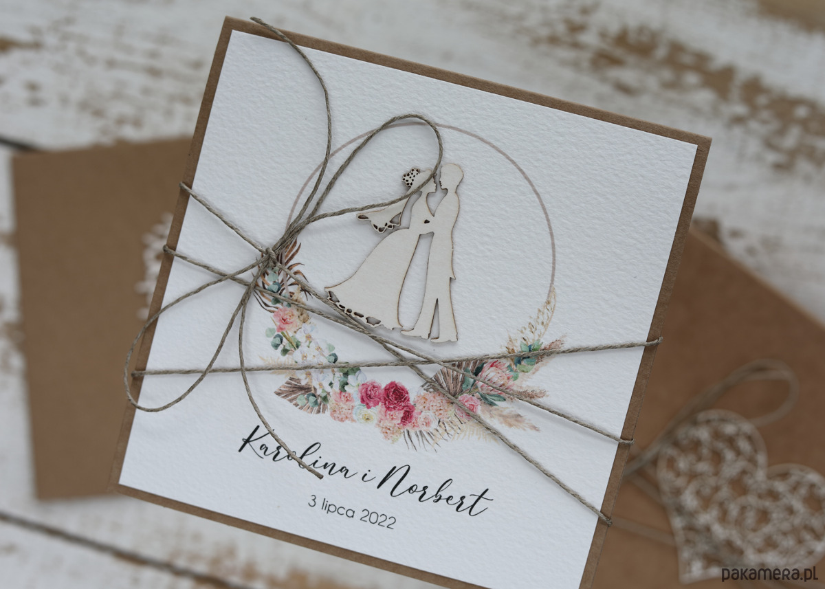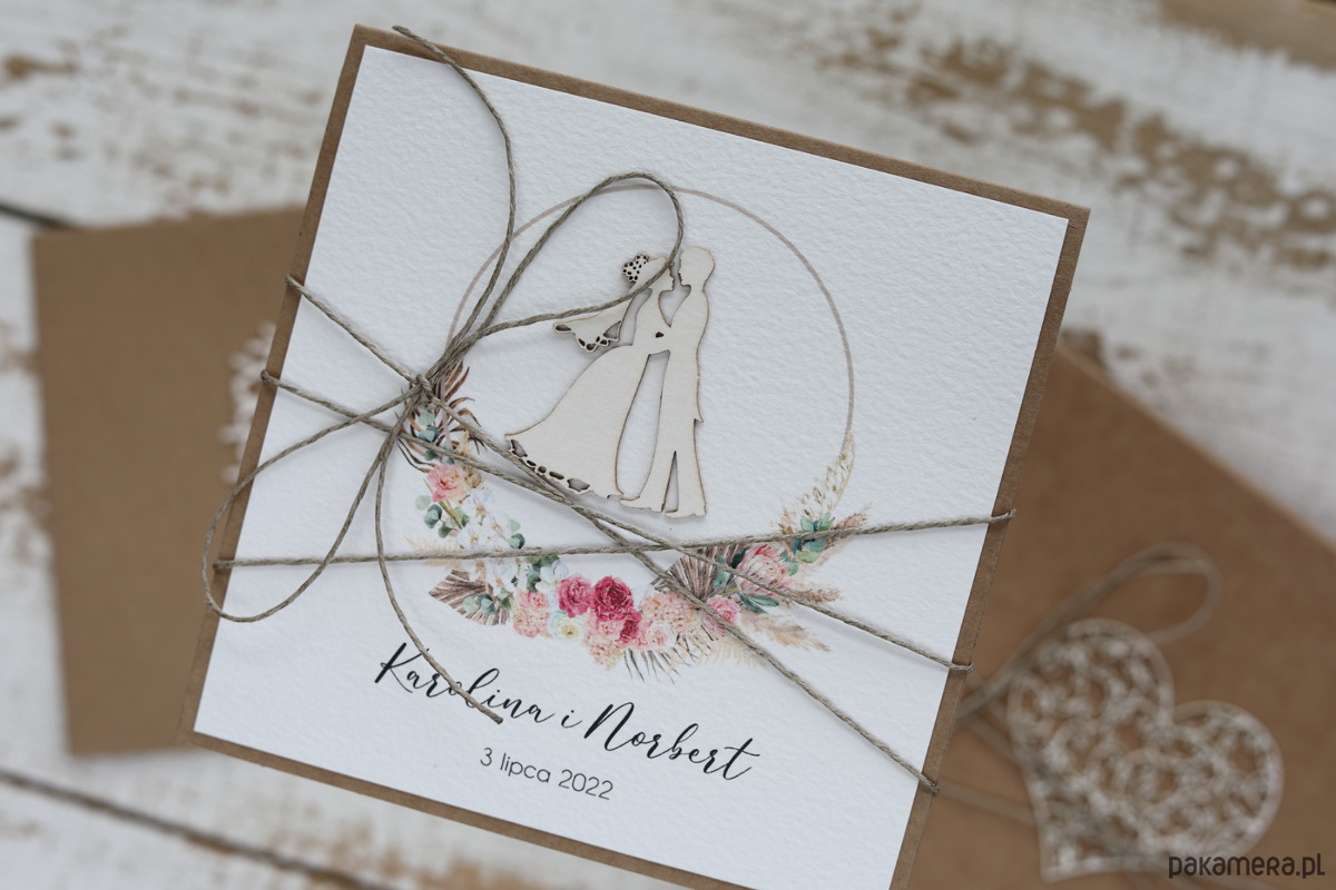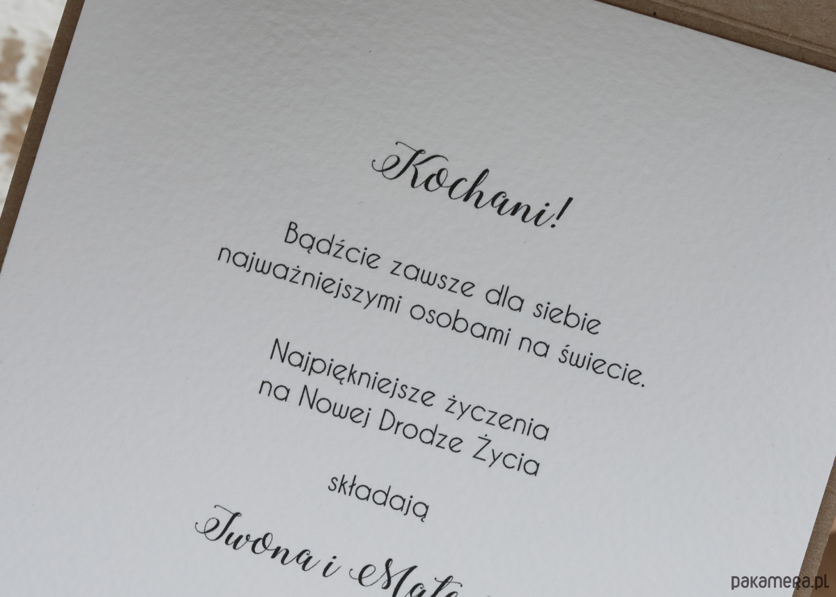 Kartka o wymiarach 14x14 cm wykonana z papieru kraftowego, papieru bawełnianego oraz z najlepszej jakości tekturki. Personalizacja na przodzie kartki i w środku - proszę o podanie danych w uwagach do zamówienia -