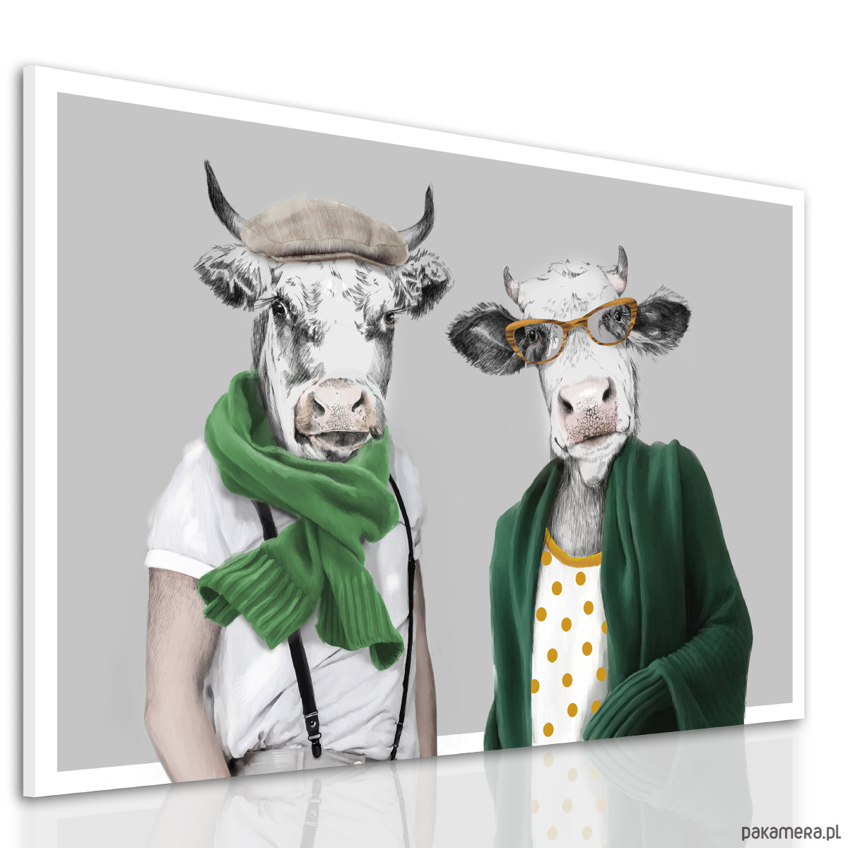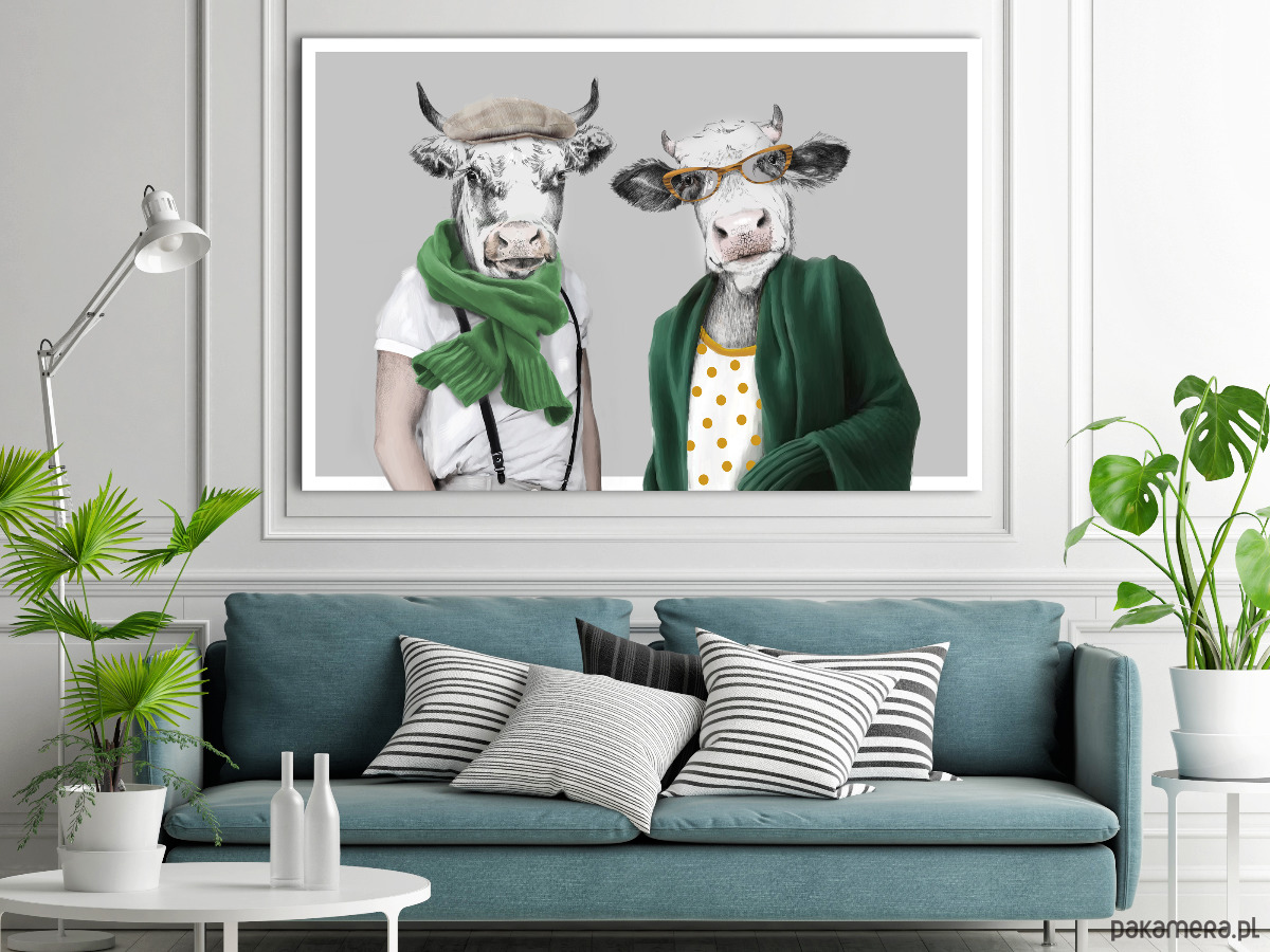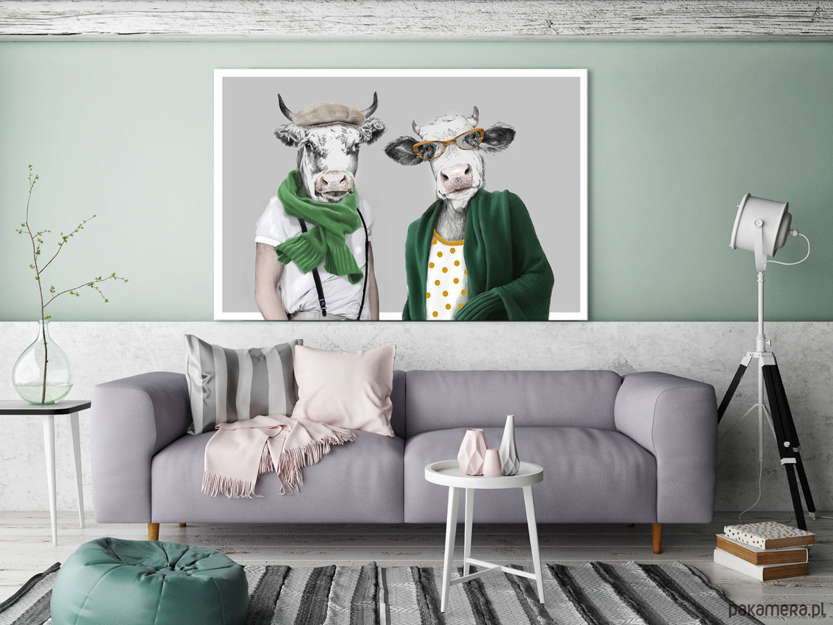 Zabawny i oryginalny obraz na płótnie przedstawiający parę krów w nowoczesnych, humorystycznych stylizacjach. Jeden z bohaterów ma na sobie kaszkiet, zielony szalik i szelki, a drugi – okulary, polka-dot top i luźny zielony sweter. Minimalistyczne tło podkreśla postaci, tworząc efektowną, pełną charakteru kompozycję.