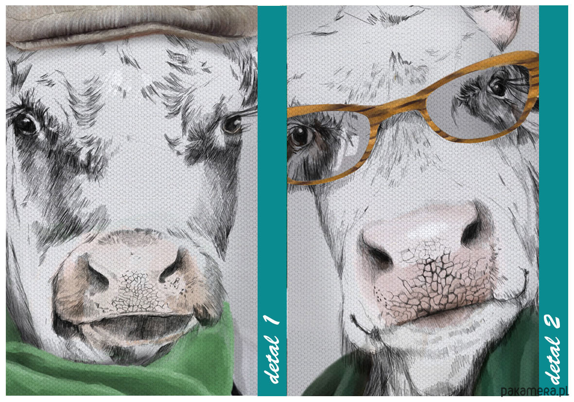 Słowa kluczowe: obraz krowy, humorystyczna ilustracja, zwierzęta w ubraniach, dekoracja do kuchni, nowoczesny obraz na płótnie, plakat zwierzęta stylowe.