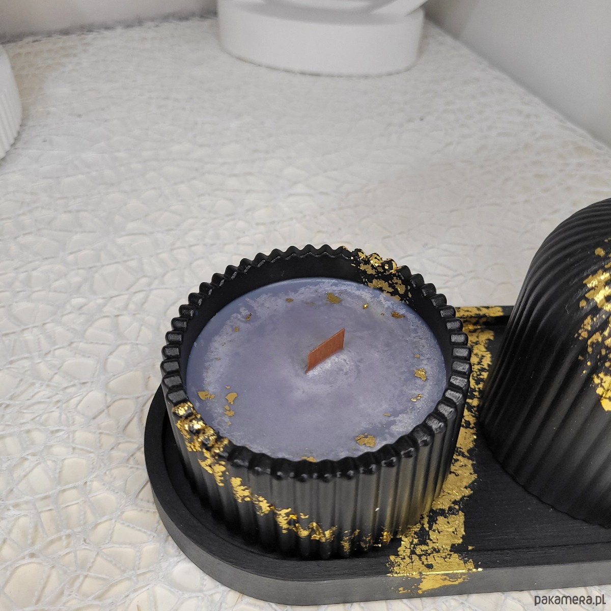 — Świeca zapachowa z naturalnym drewnianym knotem w stylowym gipsowym świeczniku