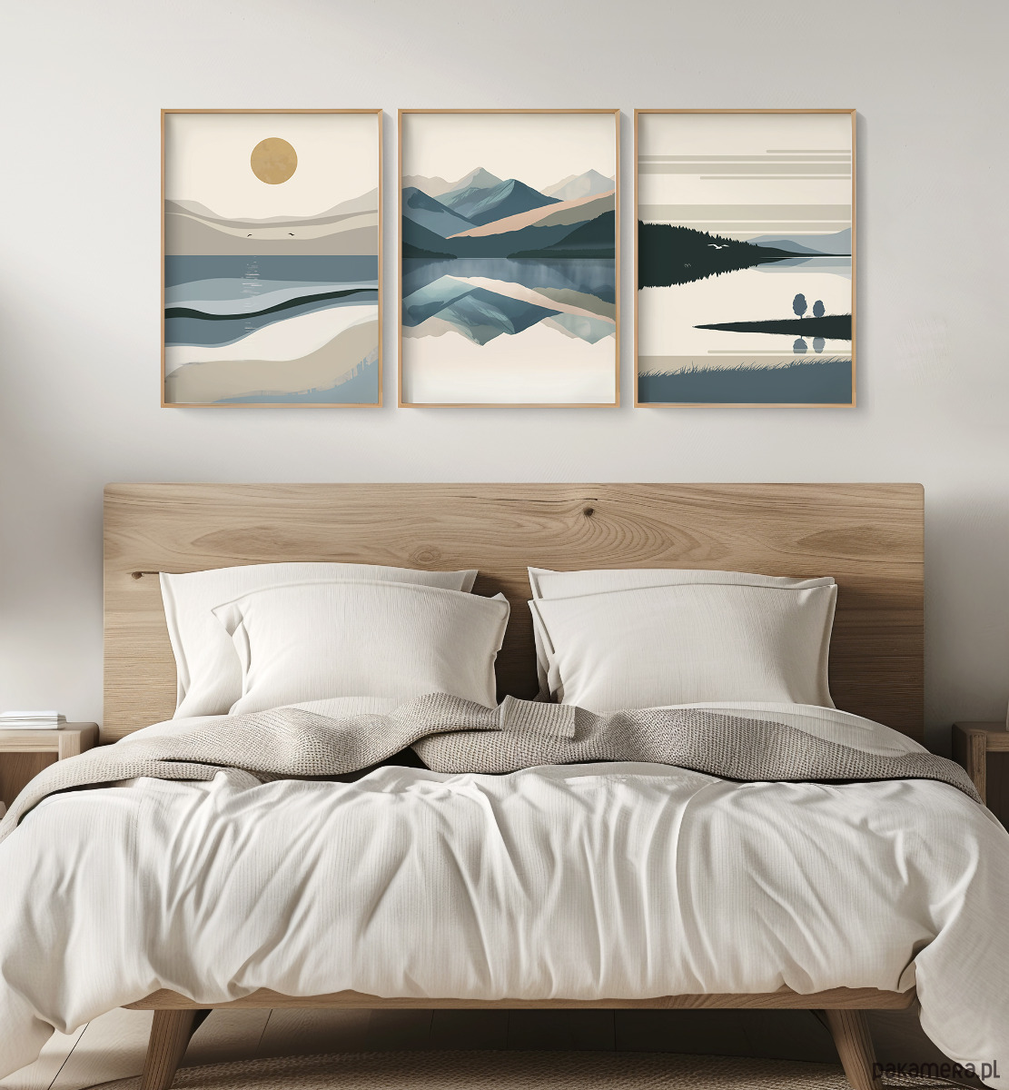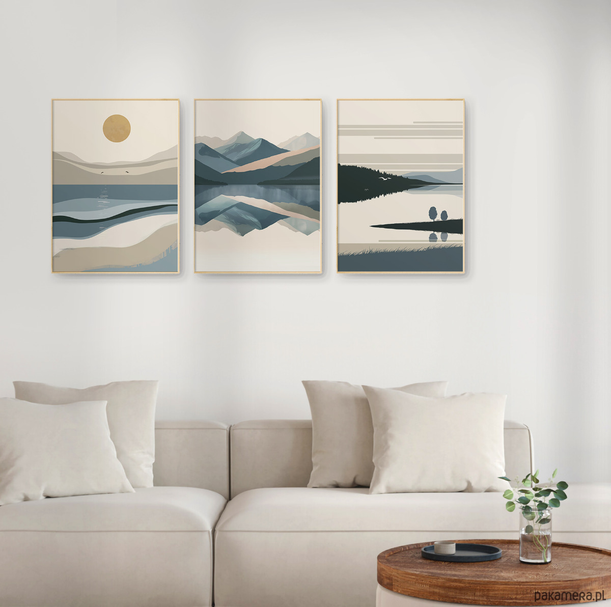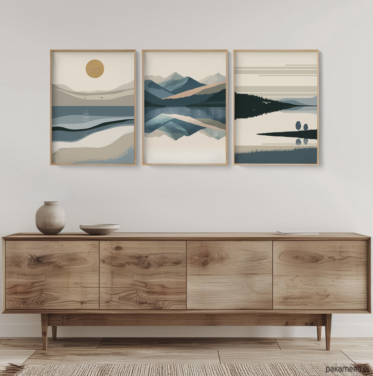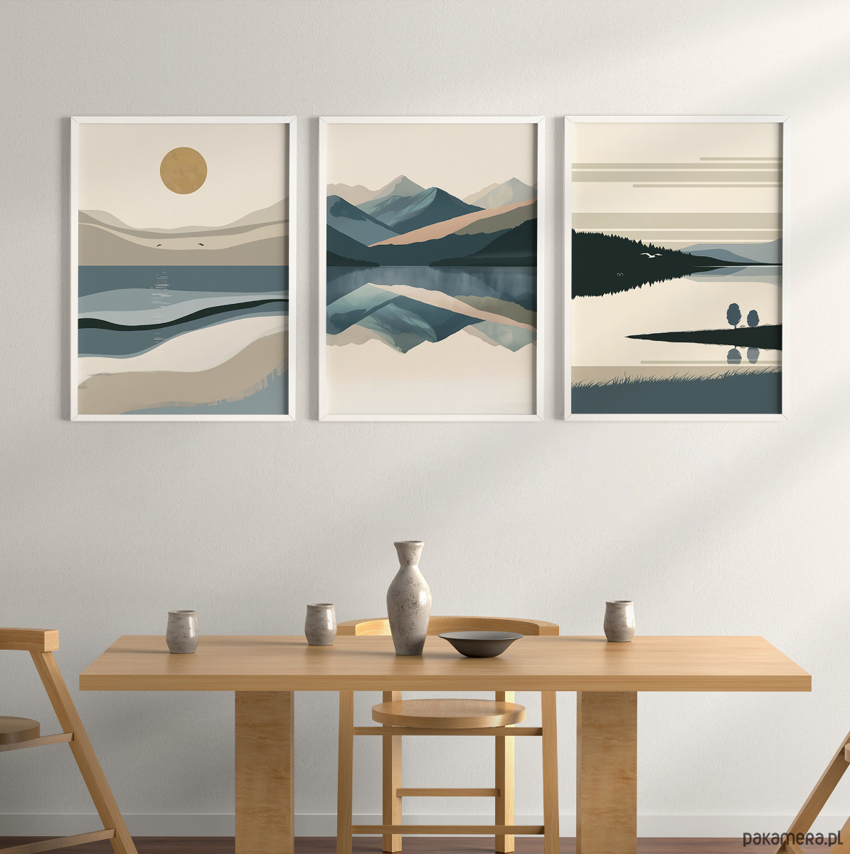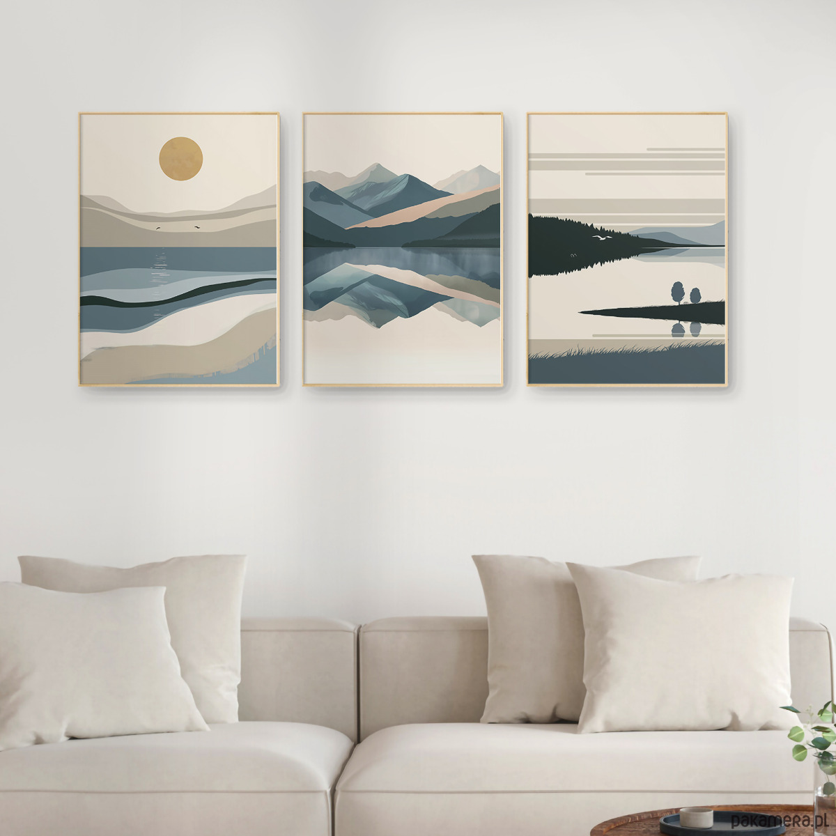 Abstrakcyjny, minimalistyczny zestaw 3 plakatów z wizerunkiem morza, gór i jezior. Inspiracją do ich stworzenia były oczywiście wyjątkowe polskie krajobrazy – tajemniczy Bałtyk, niezwykłe góry, oraz malownicze Mazury. Grafika może stanowić świetną dekorację ścian w salonie, sypialni, przedpokoju czy też kuchni, dodając wnętrzu stylowego charakteru i naturalnego klimatu.