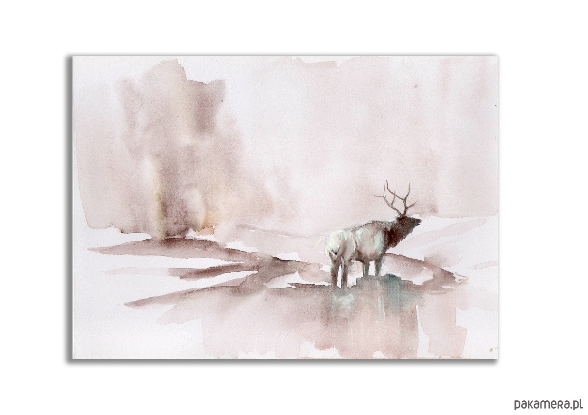Odkryj magię natury uchwyconą w delikatnych pociągnięciach pędzla. Ta urocza, ręcznie malowana akwarela przedstawia majestatycznego jelenia stojącego w zamglonym, spokojnym krajobrazie. Stonowana kolorystyka, dominujące odcienie sepii, brązu nadają pracy eteryczny i nowoczesny charakter.