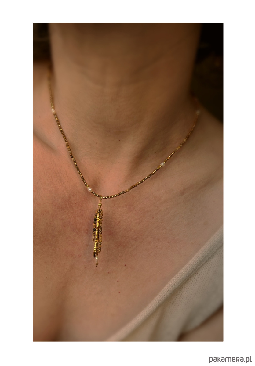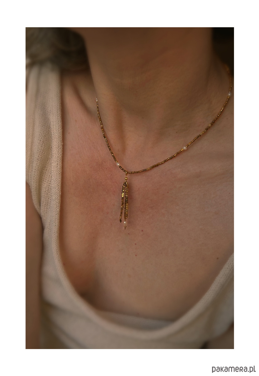 Długość około 42 cm plus łańcuszek 3 cm. Przekładki i dodatki srebro pozłacane i hematyty. Piękne złote refleksy to wynik szlifu hematytu i pozłacanej warstwy.