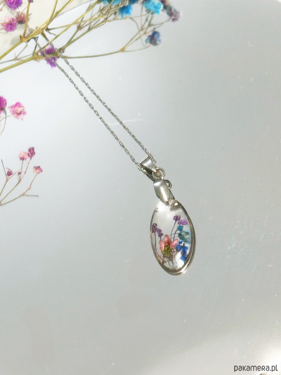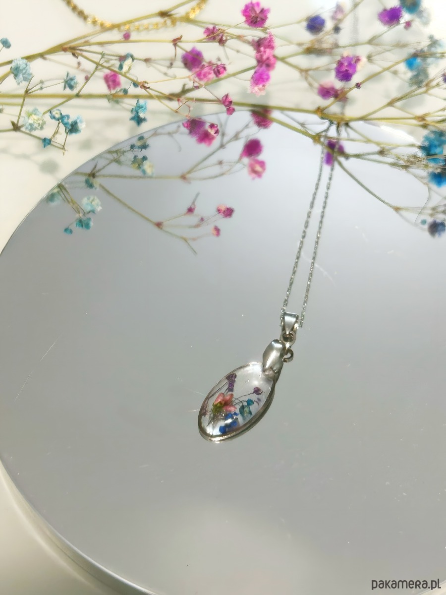 Naszyjnik w którym zatopiono pączki gipsówki, wrzosy i kwiatek dzikiej marchwi. Przezroczyste tło
