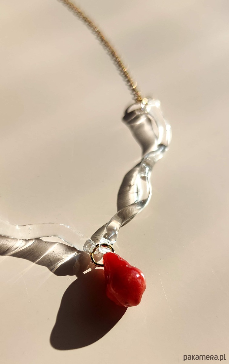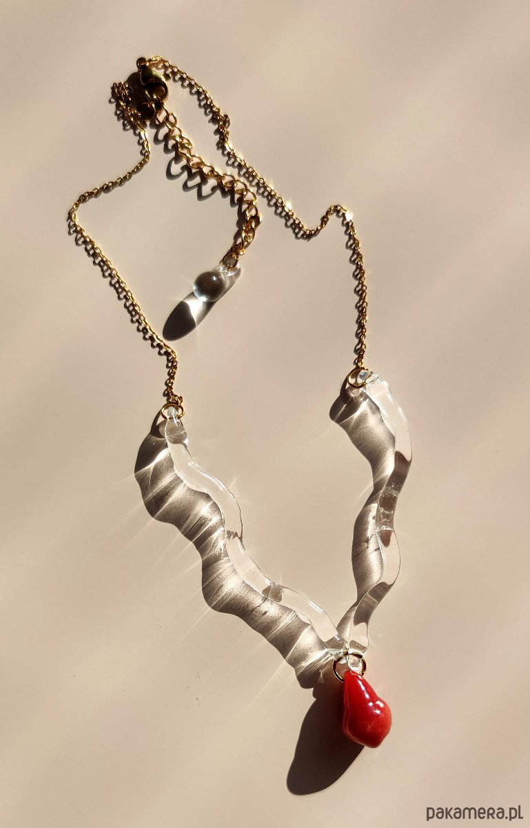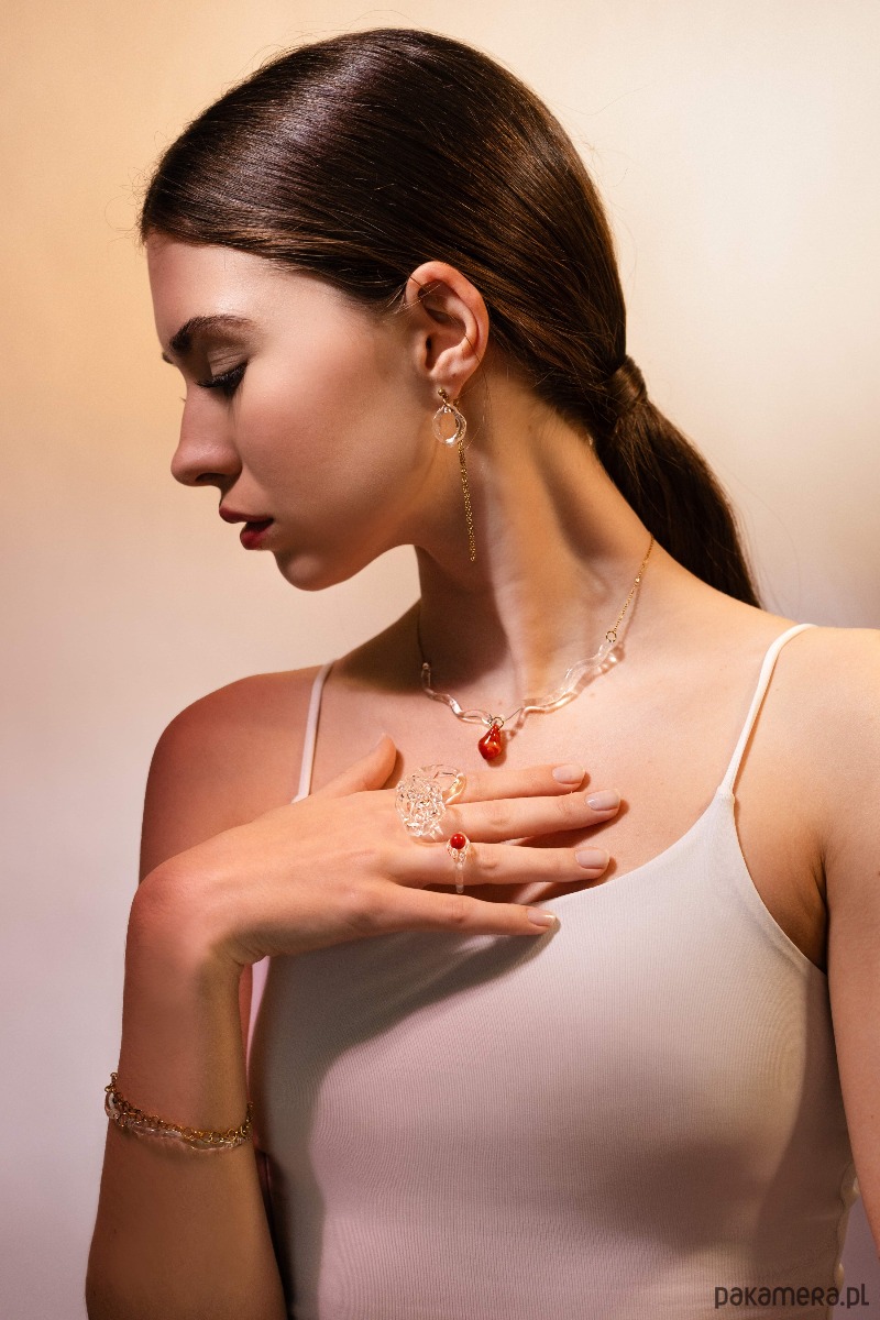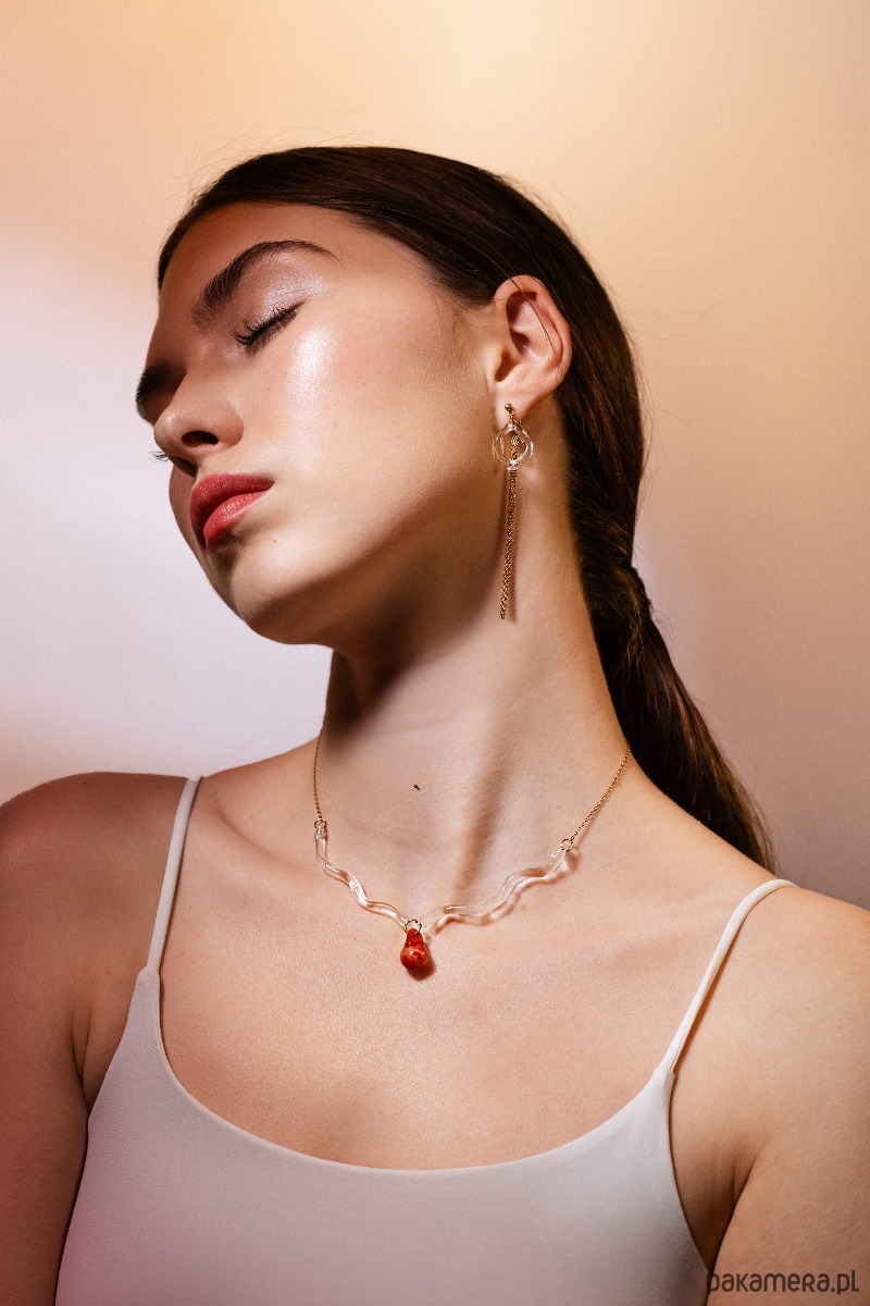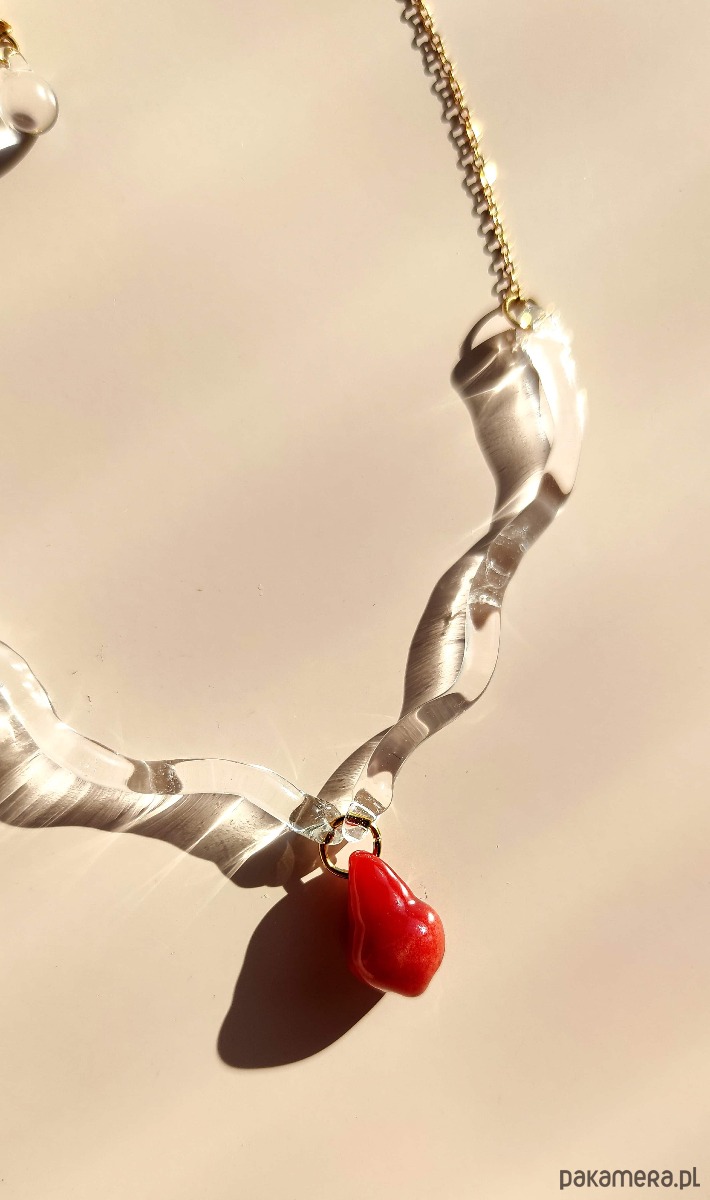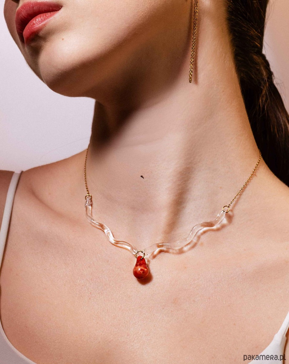Naszyjnik z tej serii jest jak linia falującej wody – przezroczysta, rozedrgana, lekka. Zawieszony u jej brzegu szklany akcent w kolorze koralowym przypomina kroplę ognia – gest, który łączy dwa żywioły w jedno.