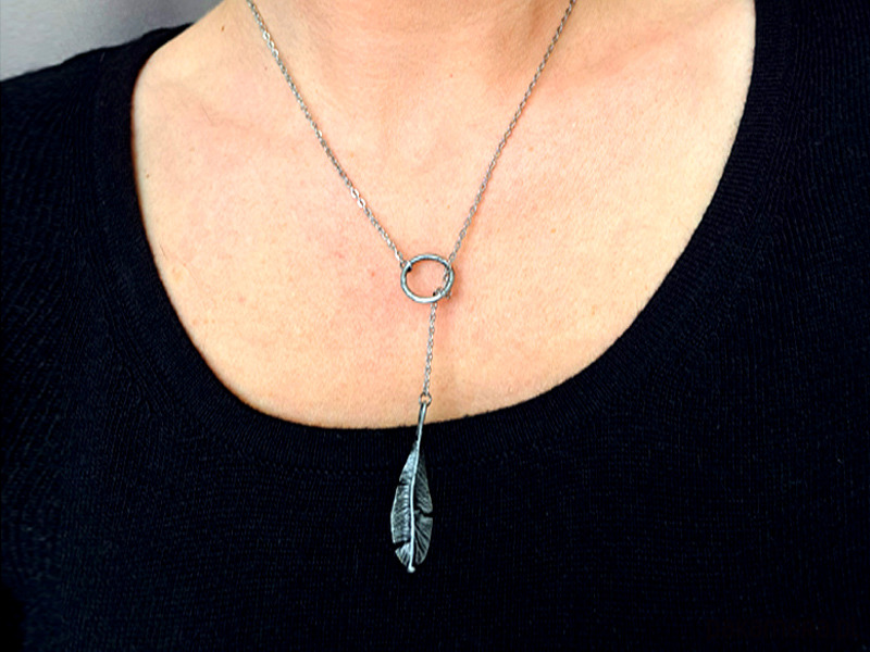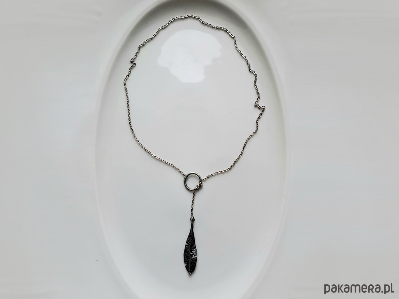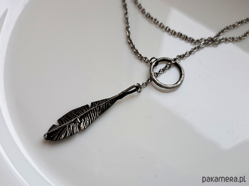 W celu zapięcia naszyjnika, piórko należy przeciągnąć dwukrotnie przez kółeczko. Dzięki temu, zapięcie jest pewne, a dodatkowym atutem jet możliwość regulacji wysokości piórka.