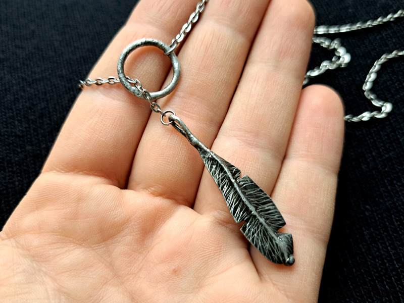 Delikatny naszyjnik w stylu boho z piórkiem w odcieniu ciemnego srebra na łańcuszku ze stali chirurgicznej.